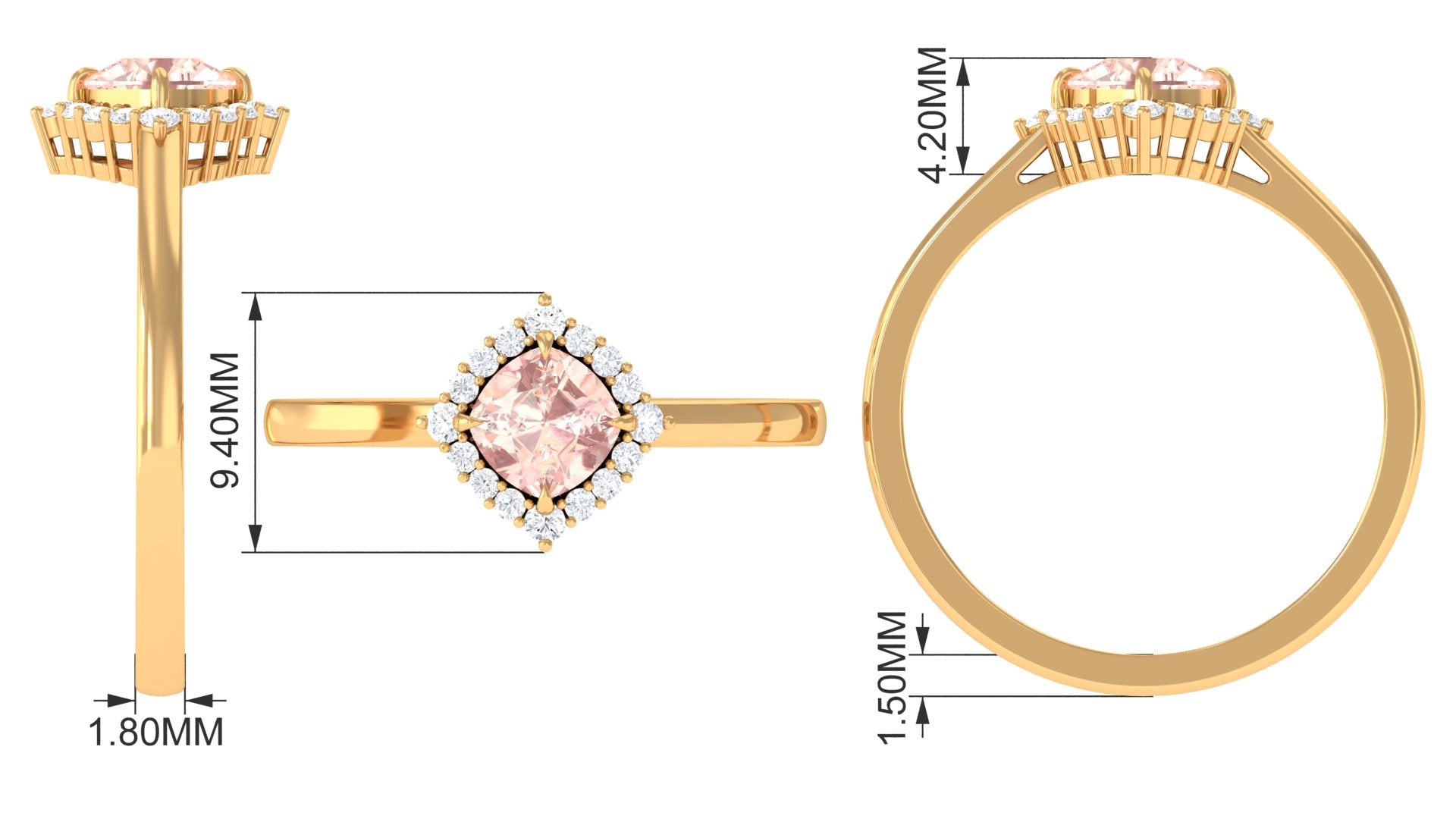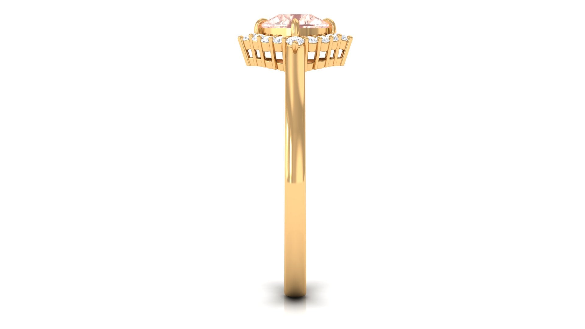 Lending a sparkling visual appeal to the conventional solitaire style, a Halo Ring encircles the center Morganite with a shimmering loop of Diamond/Moissanite. The Halo effortlessly draws more attention to the beauty of your Morganite by making it appear larger (while saving your precious bucks). So if you’re all about the glitz and glam, a Halo Style Morganite Engagement Ring might be a great fit for you.