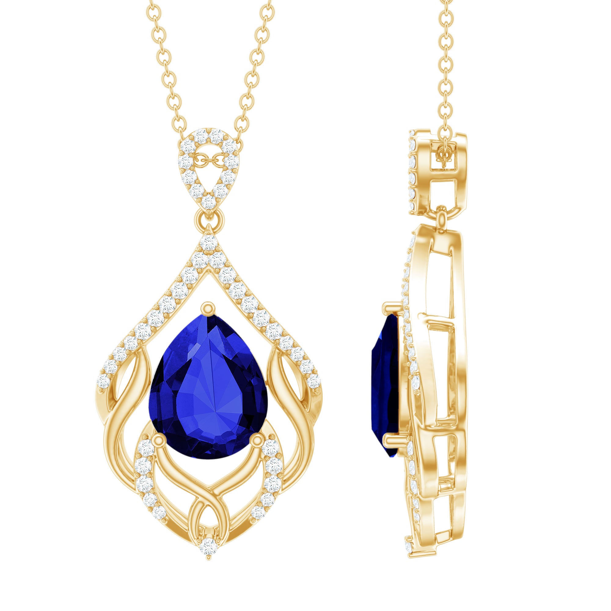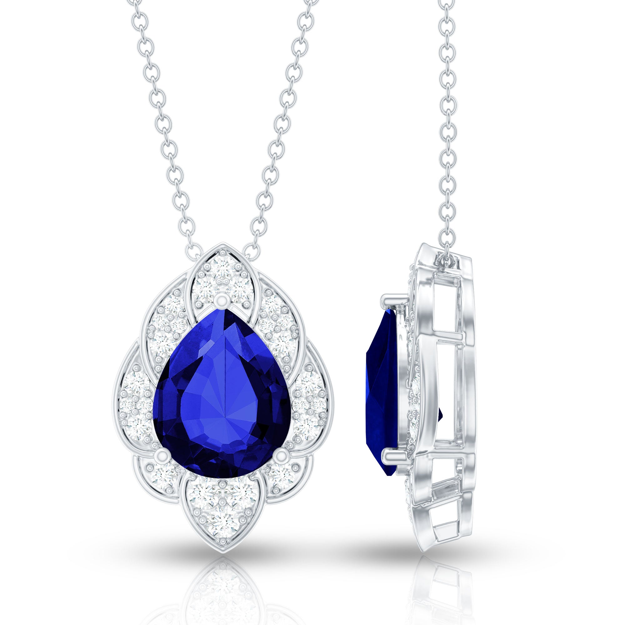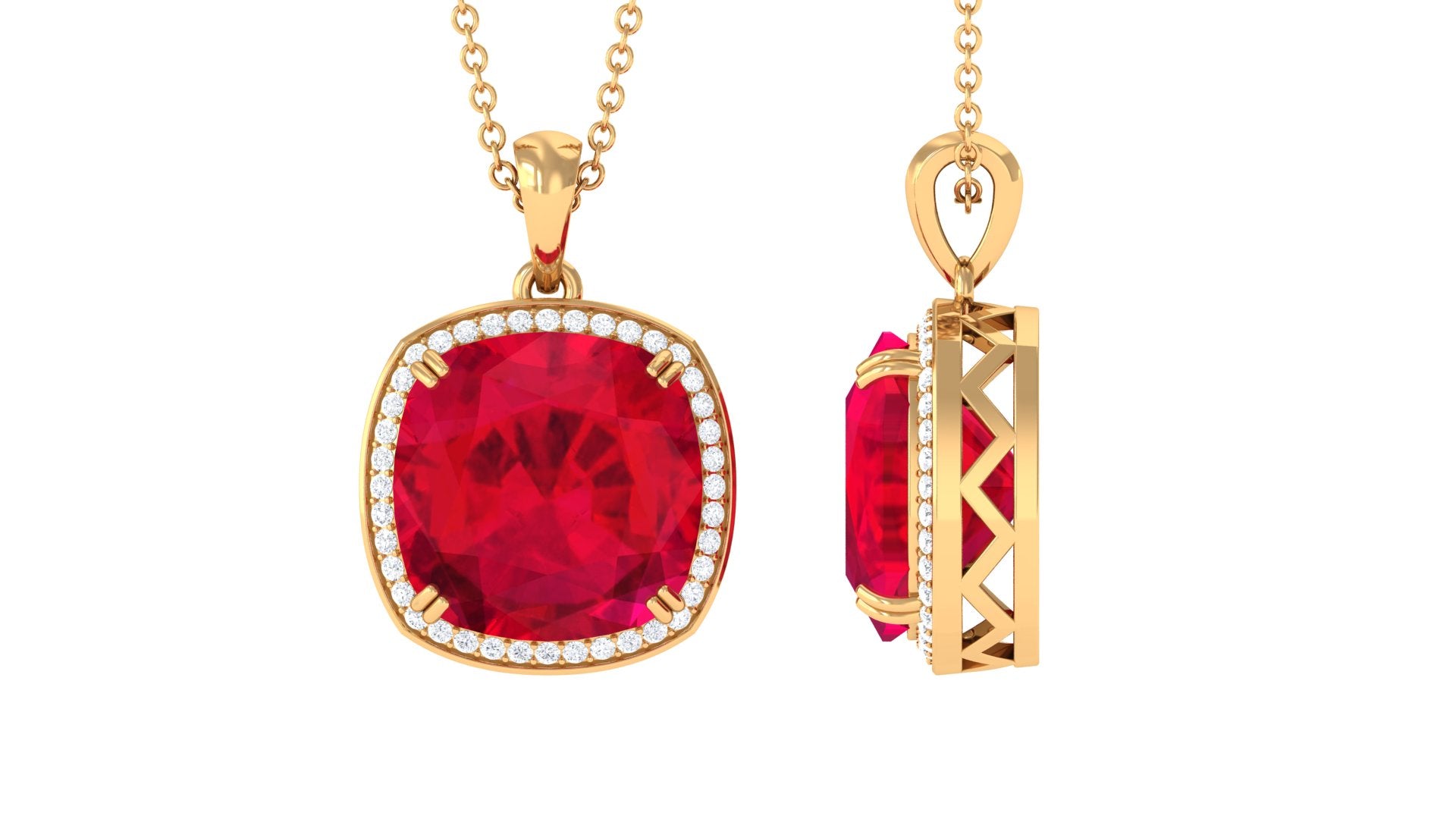 A pendant is a charm decorated with gemstones that hangs from a metal chain. While a necklace is a complete neck jewelry piece that comes with both a pendant and a chain.