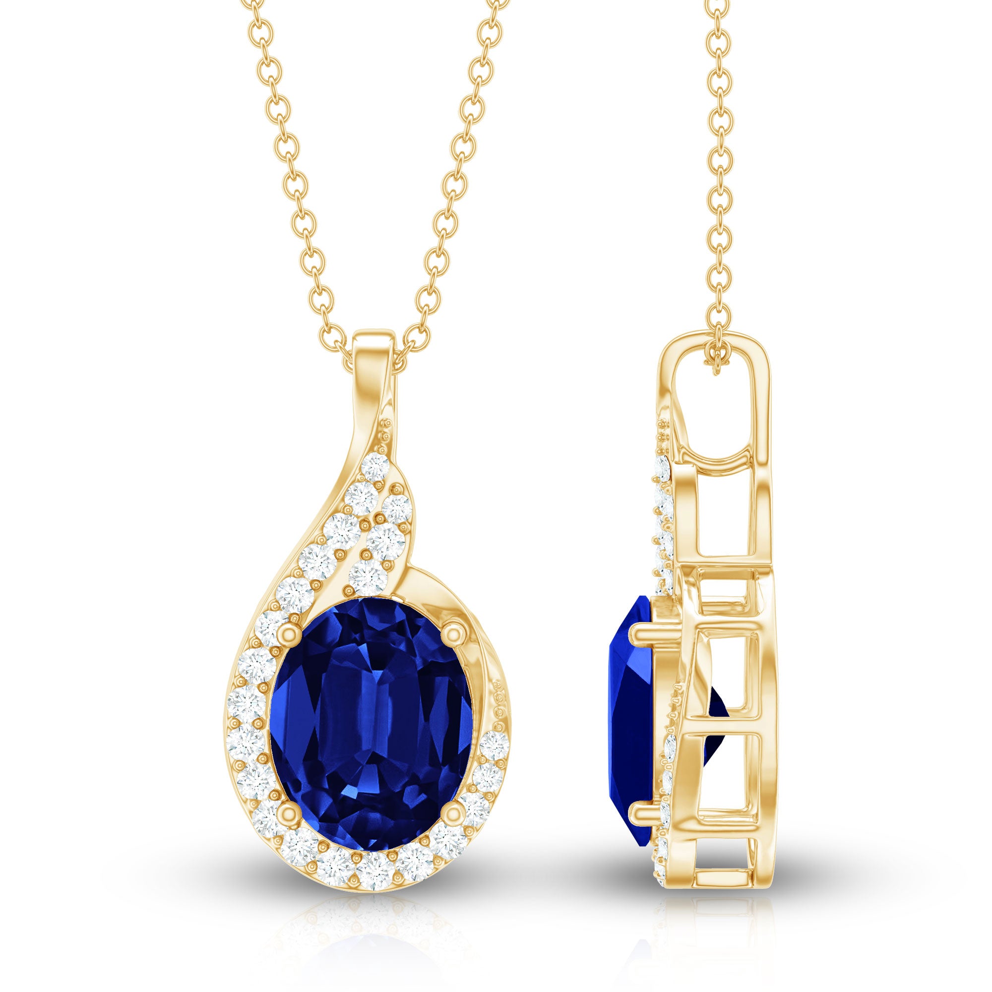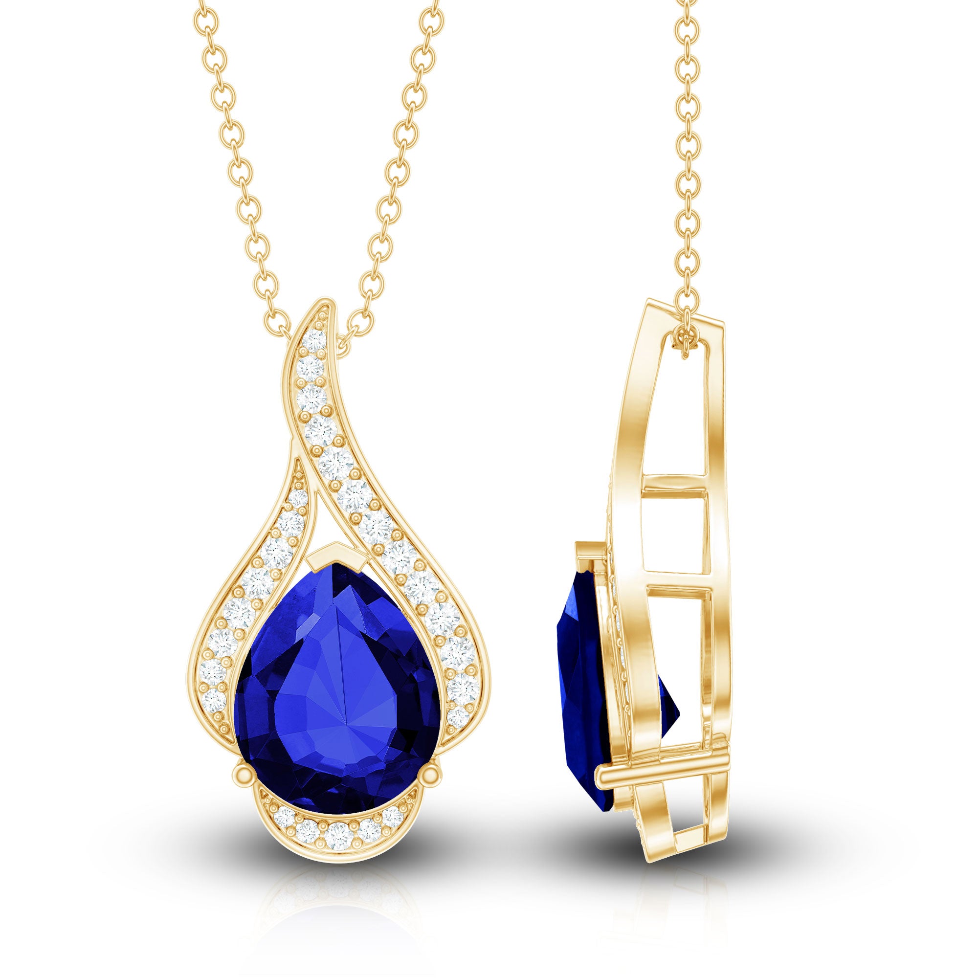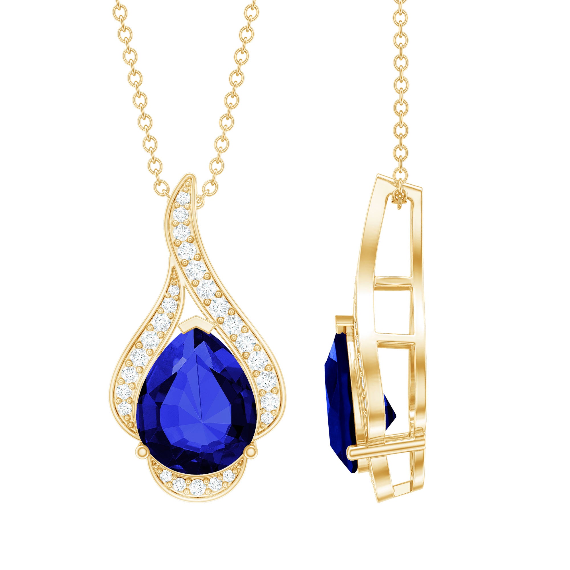 A pendant is a charm decorated with gemstones that hangs from a metal chain. While a necklace is a complete neck jewelry piece that comes with both a pendant and a chain.