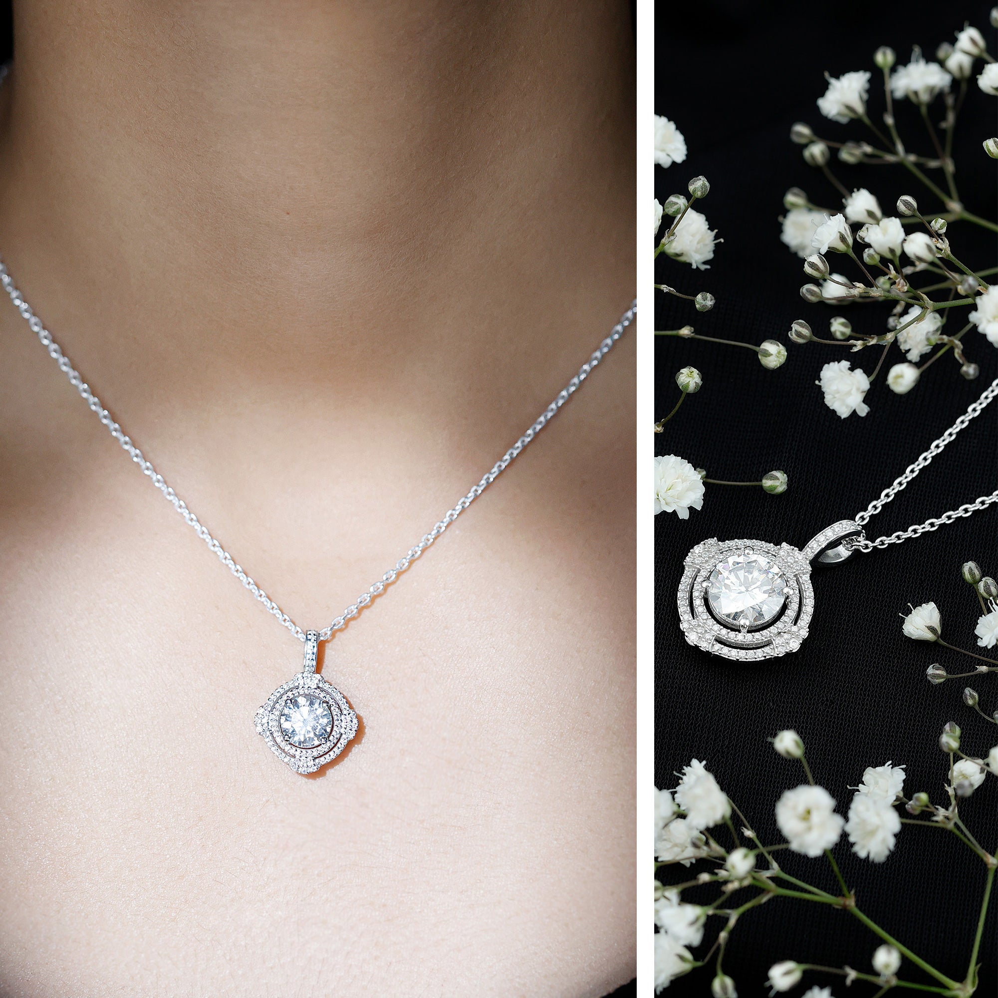 Halo Necklace: Halo necklaces are for those who love extra sparkle in their necklaces, besides the shine of single gemstone. Central gemstone is surrounded by dainty shining or colored gemstones of different shapes to make different designs. Elegant and eye-catching, these necklaces are statement pieces for your every moment.