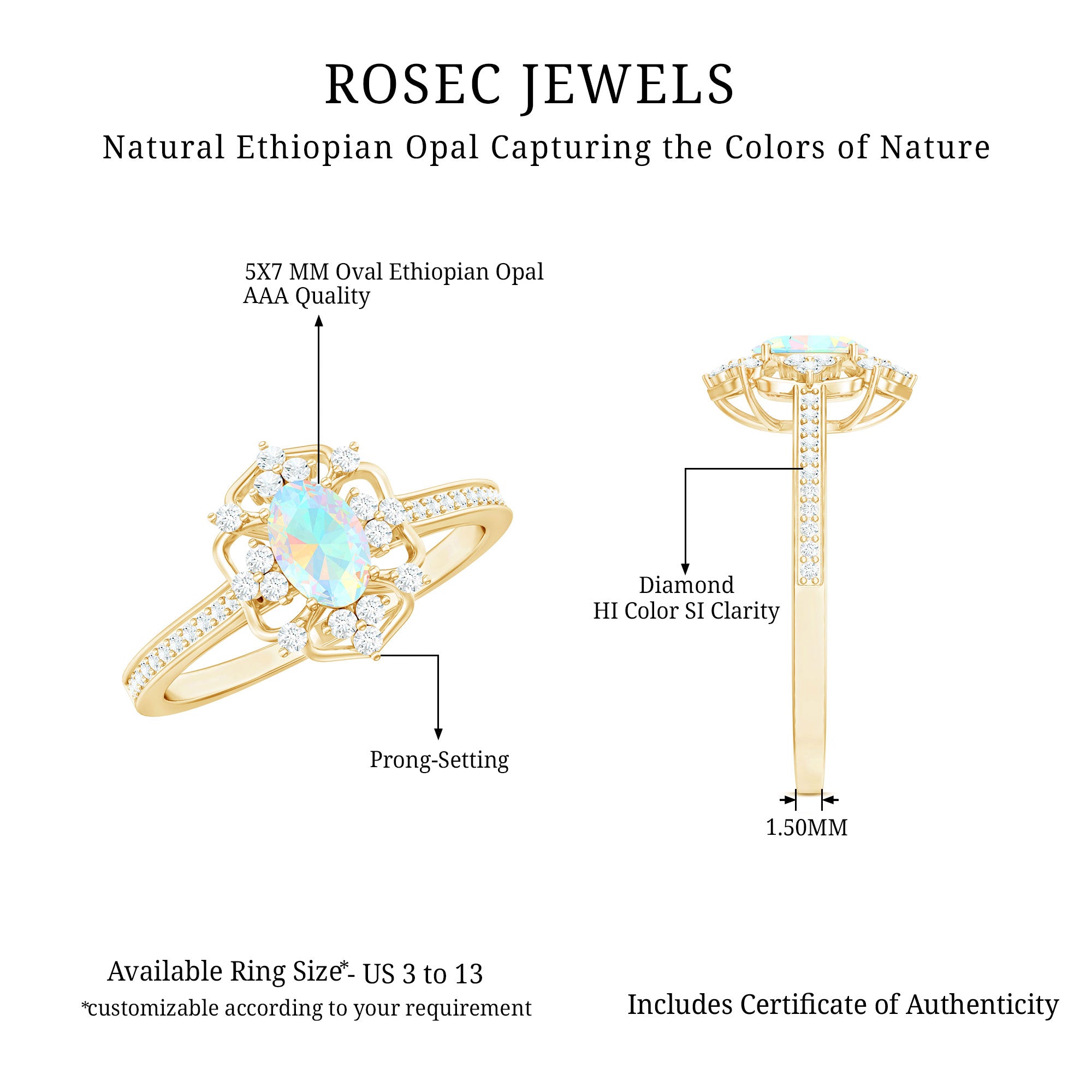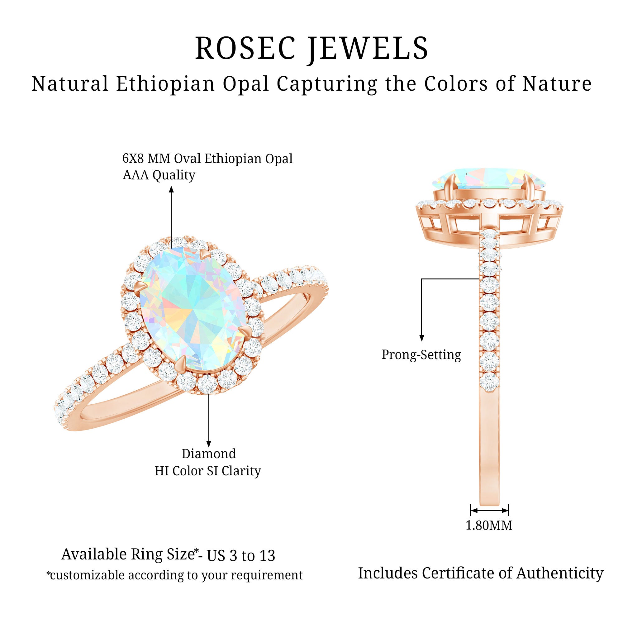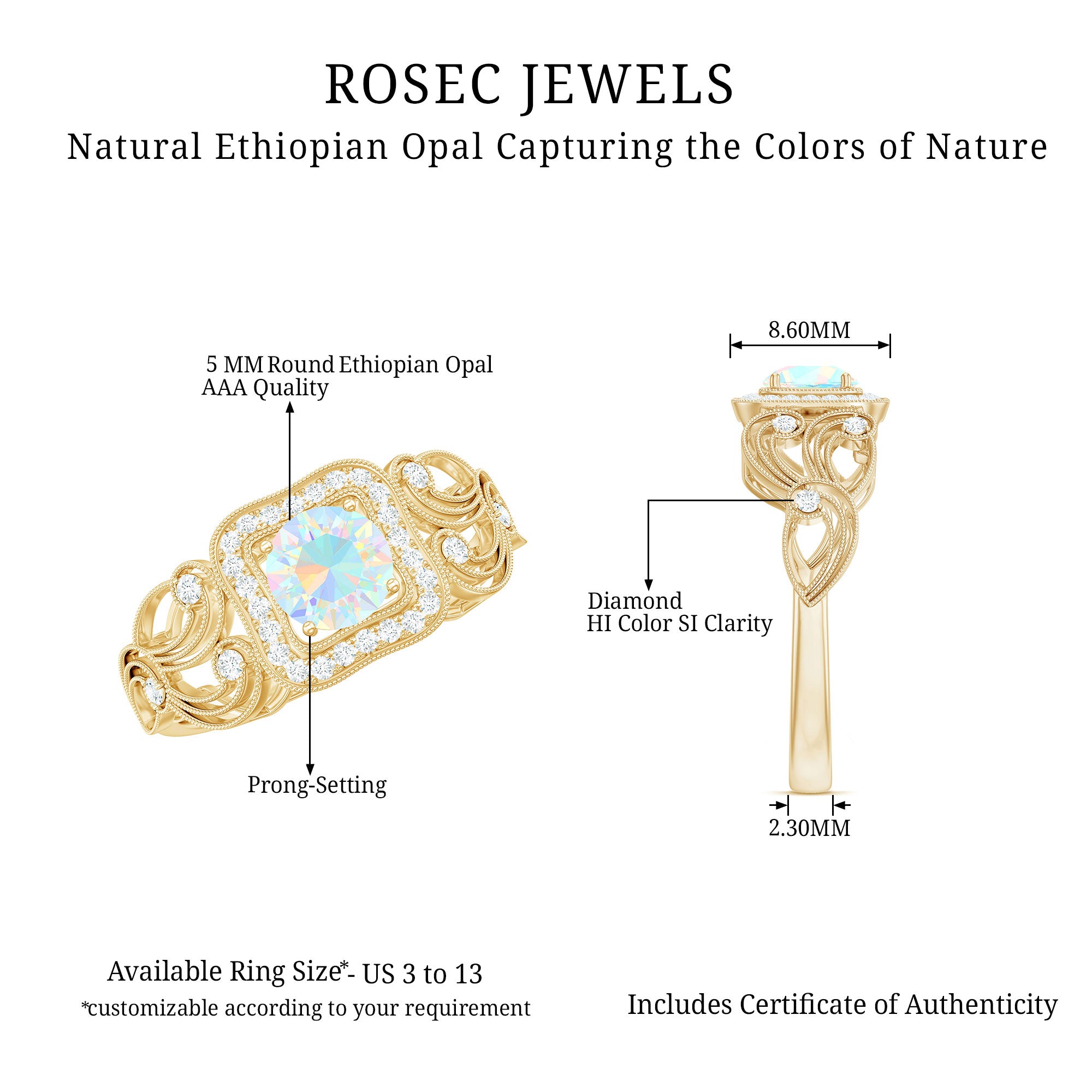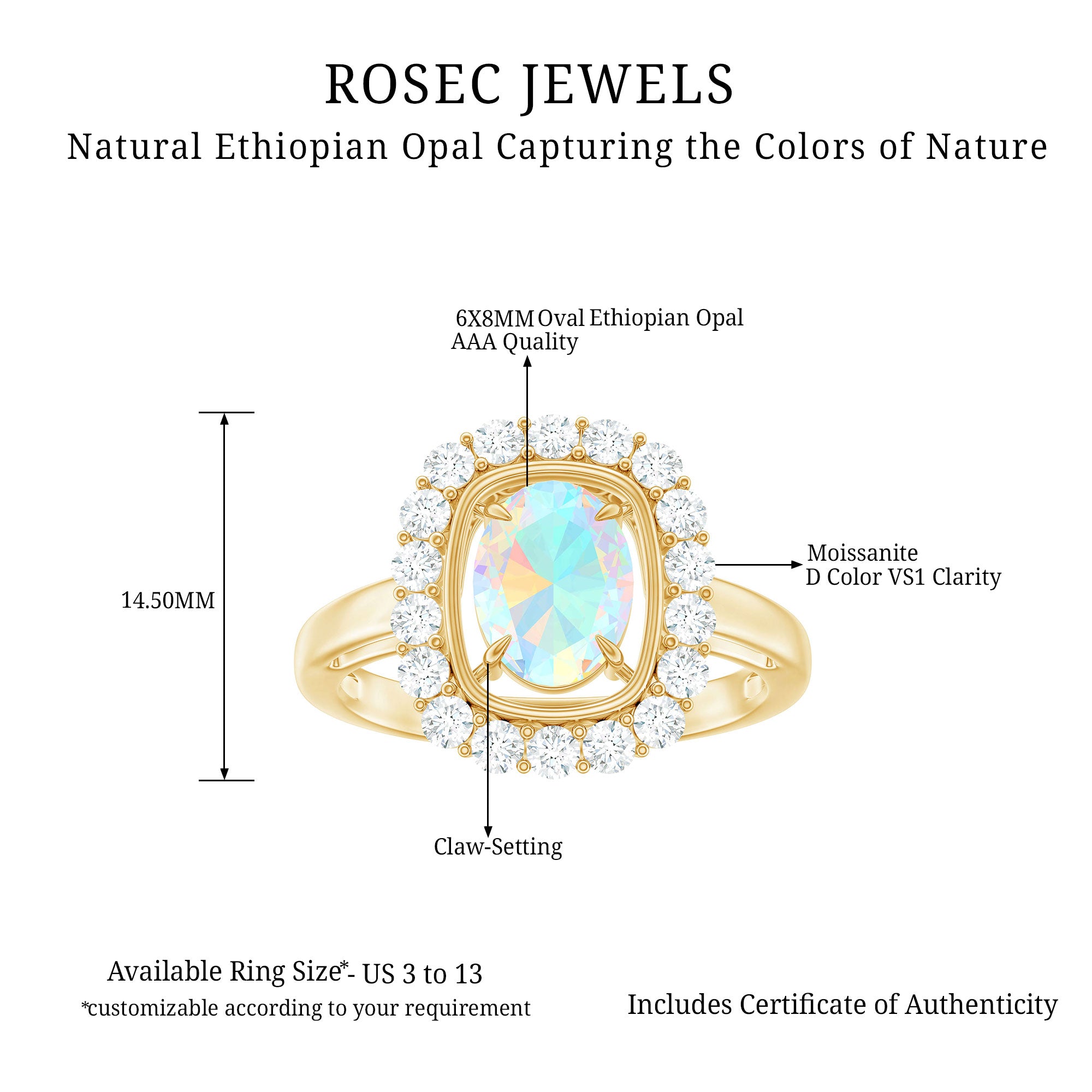 Our natural opal rings are available online at Rosec Jewels are authentic, ethically sourced, and come with a certificate. Explore the wide range and various designs of real opal rings like solitaire, halo, vintage-inspired, and others. Ethiopian opal rings have rainbow colors and look more beautiful with diamond and Moissanite.
