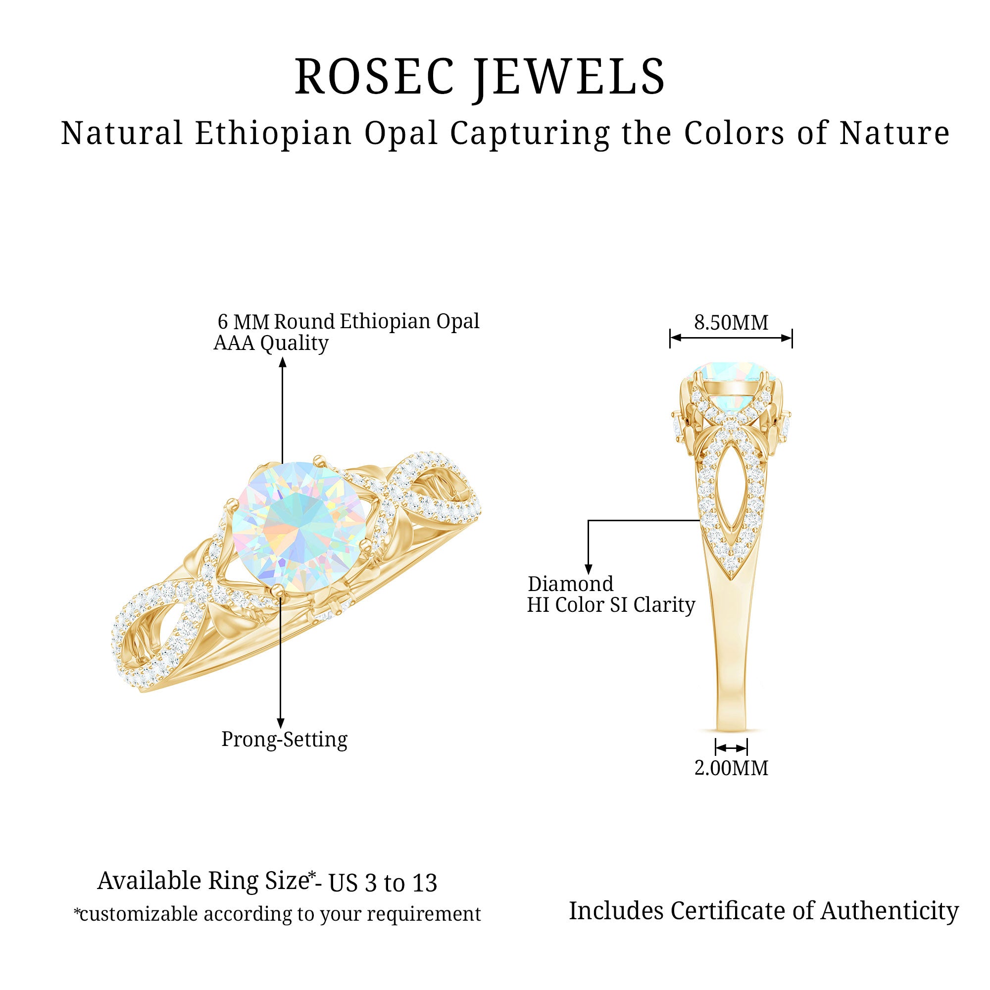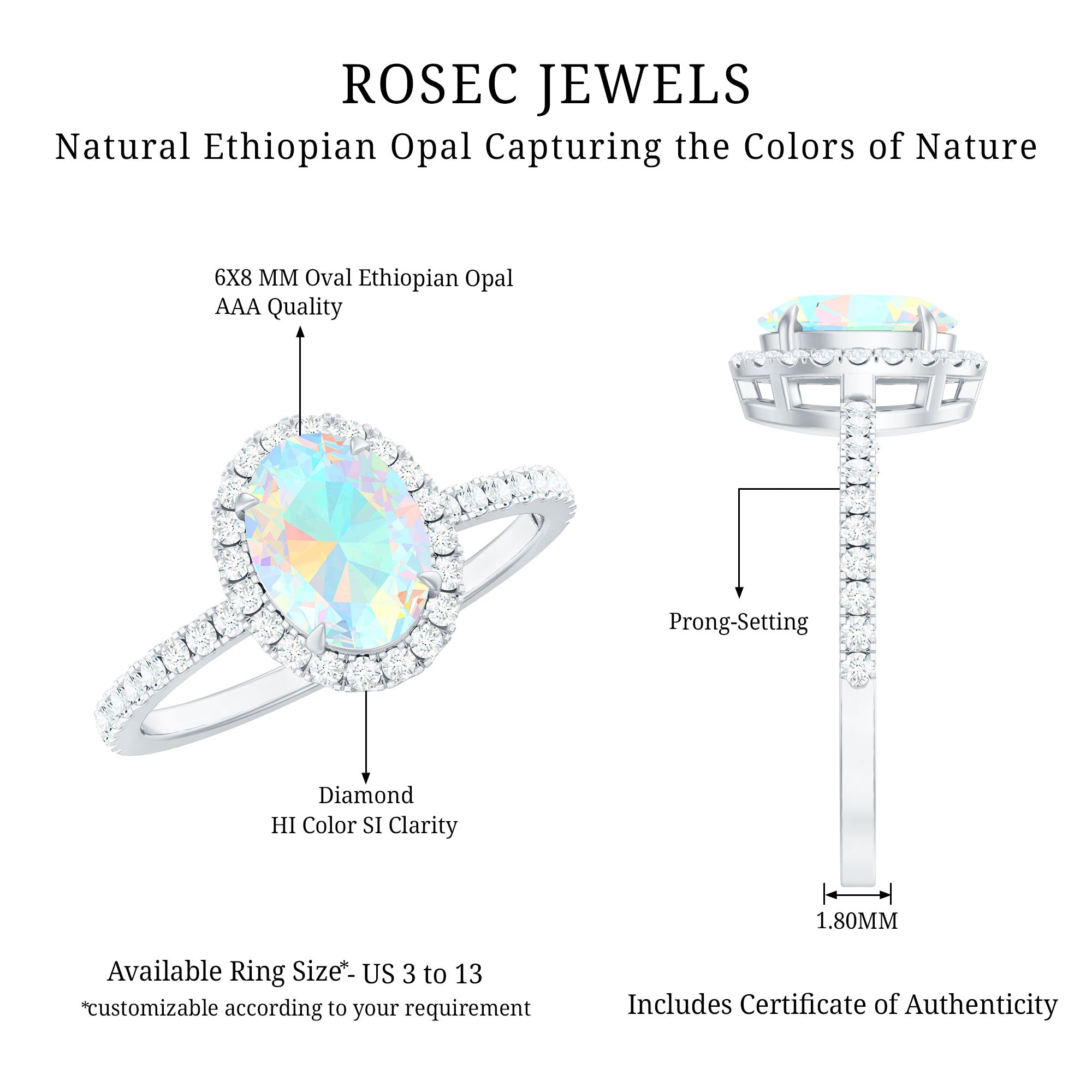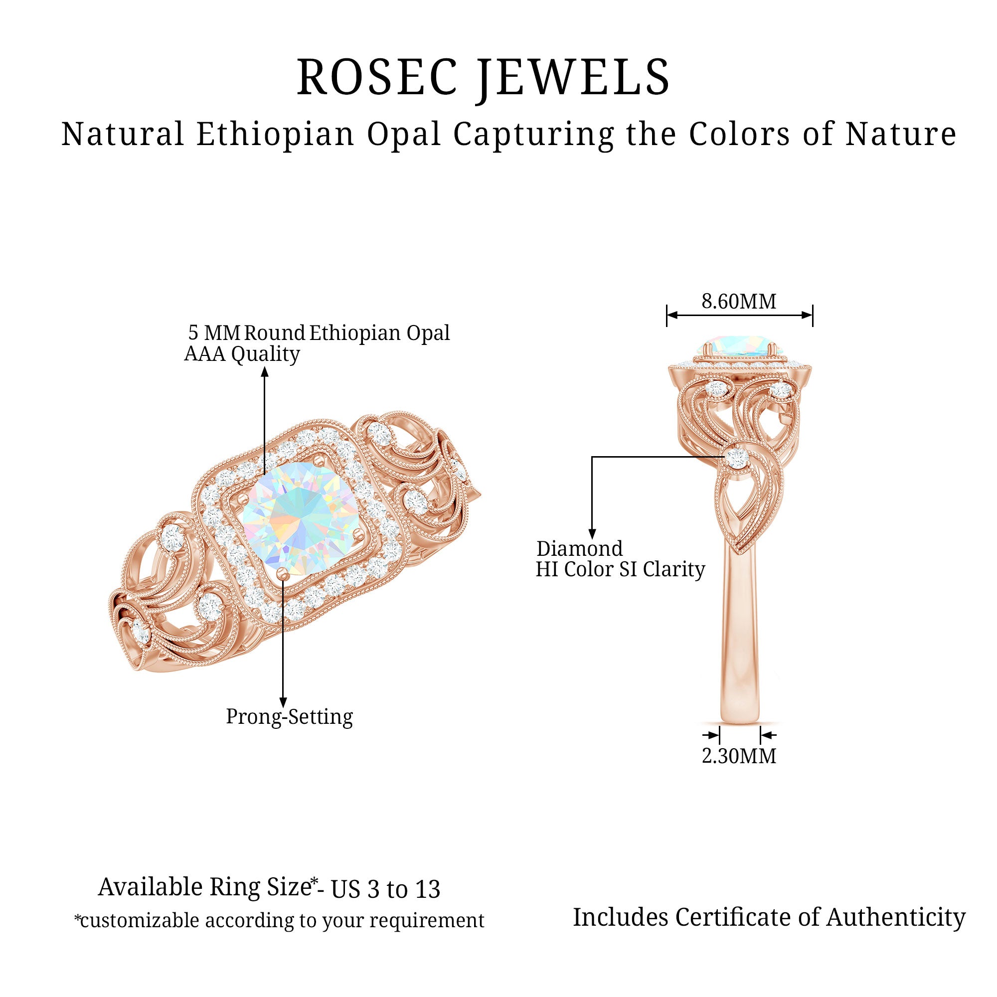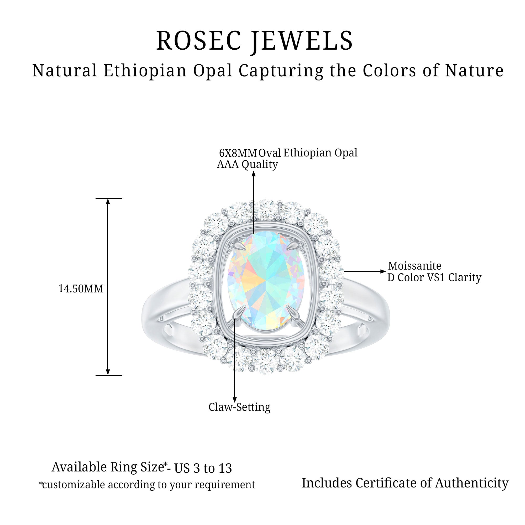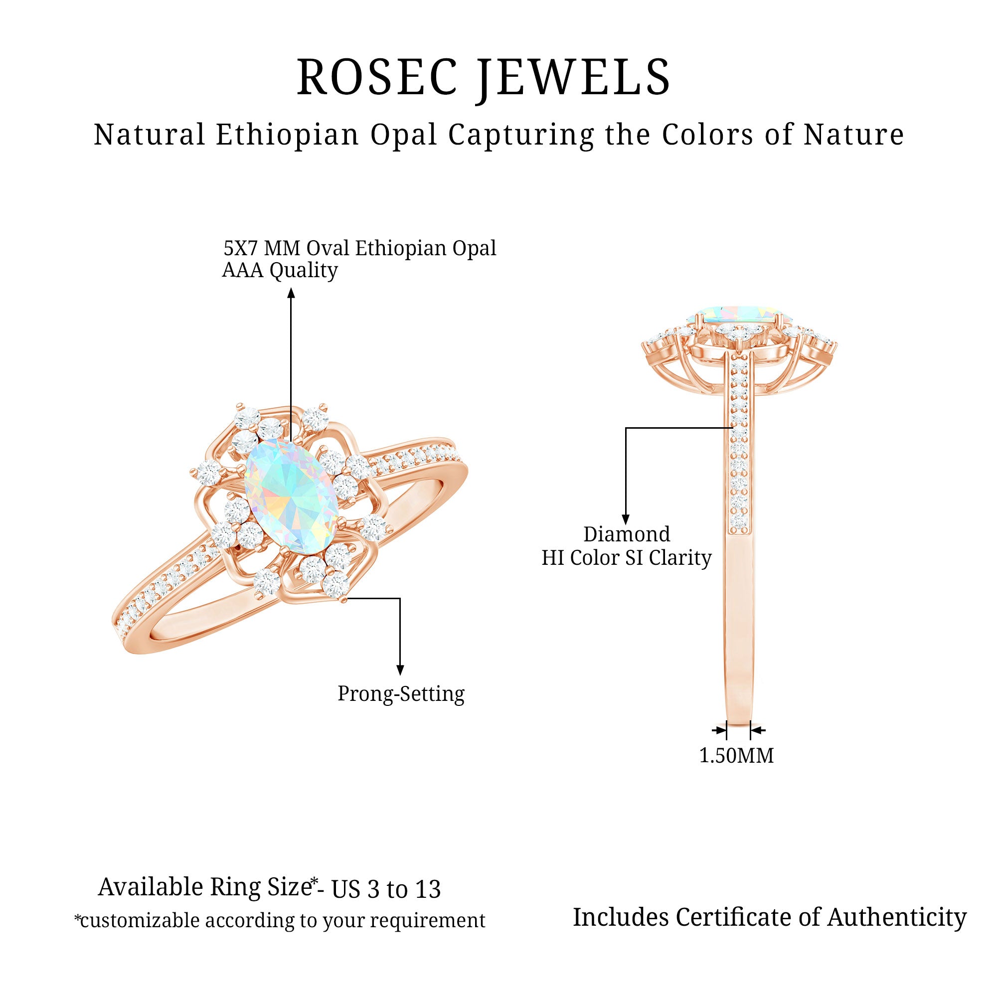 Our natural opal rings are available online at Rosec Jewels are authentic, ethically sourced, and come with a certificate. Explore the wide range and various designs of real opal rings like solitaire, halo, vintage-inspired, and others. Ethiopian opal rings have rainbow colors and look more beautiful with diamond and Moissanite.