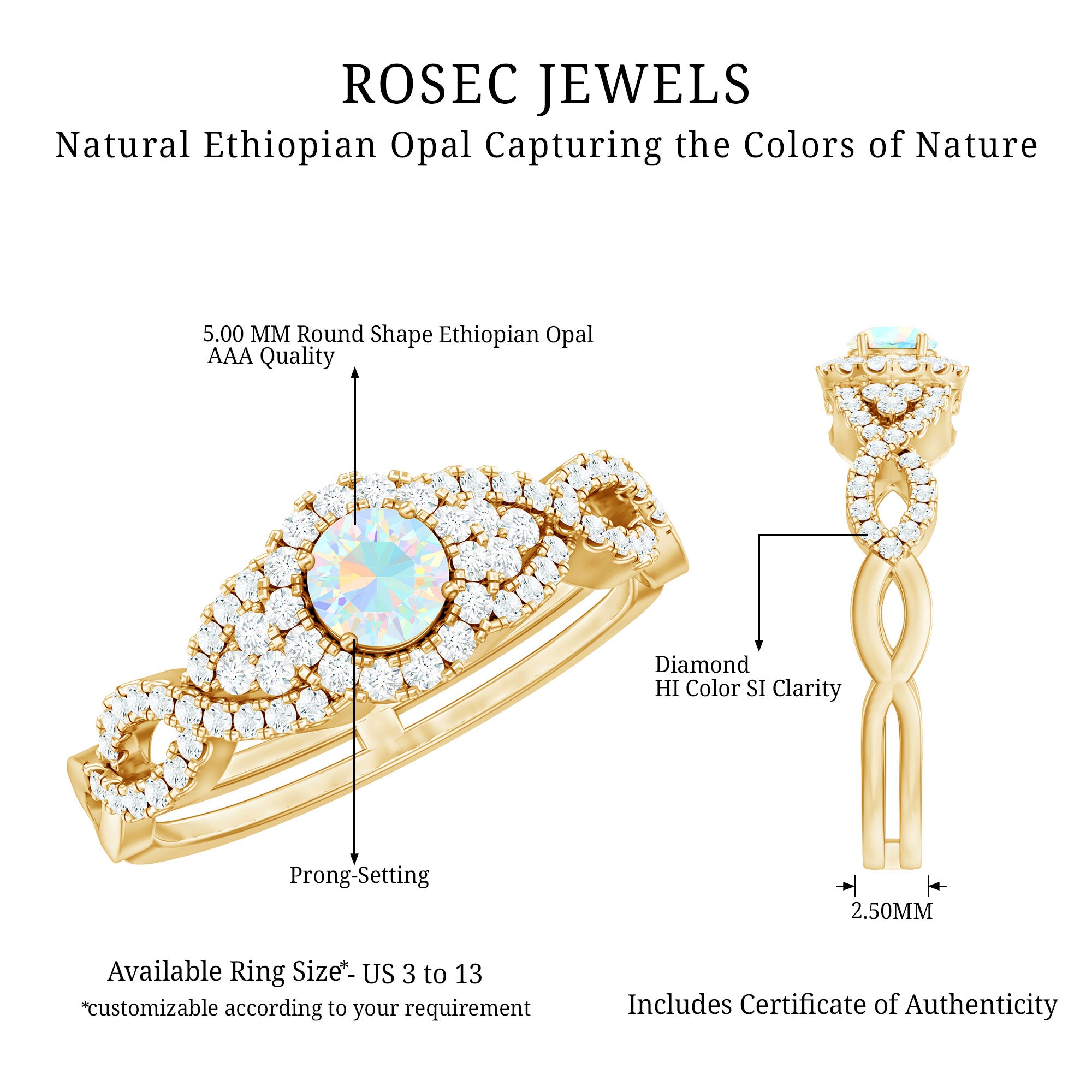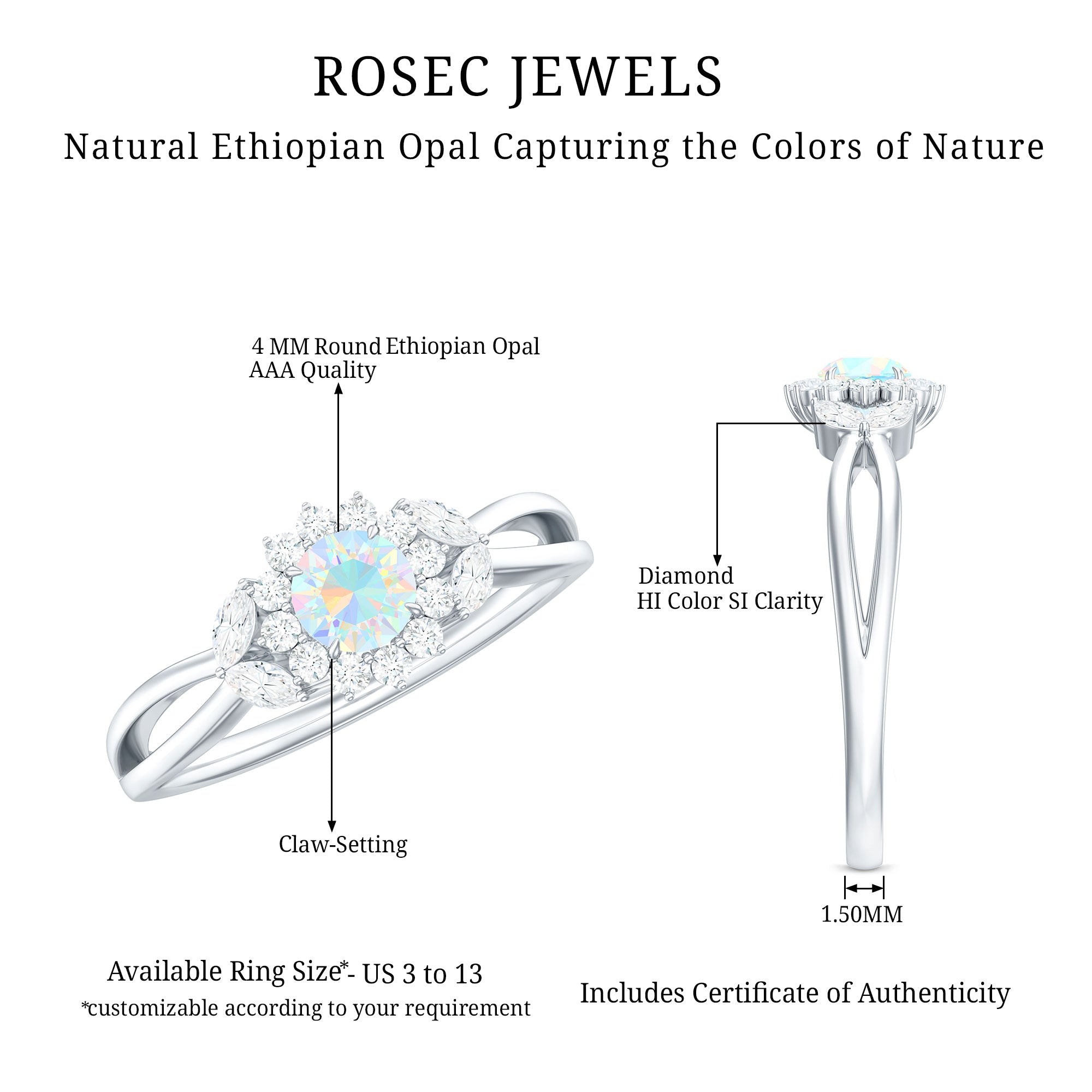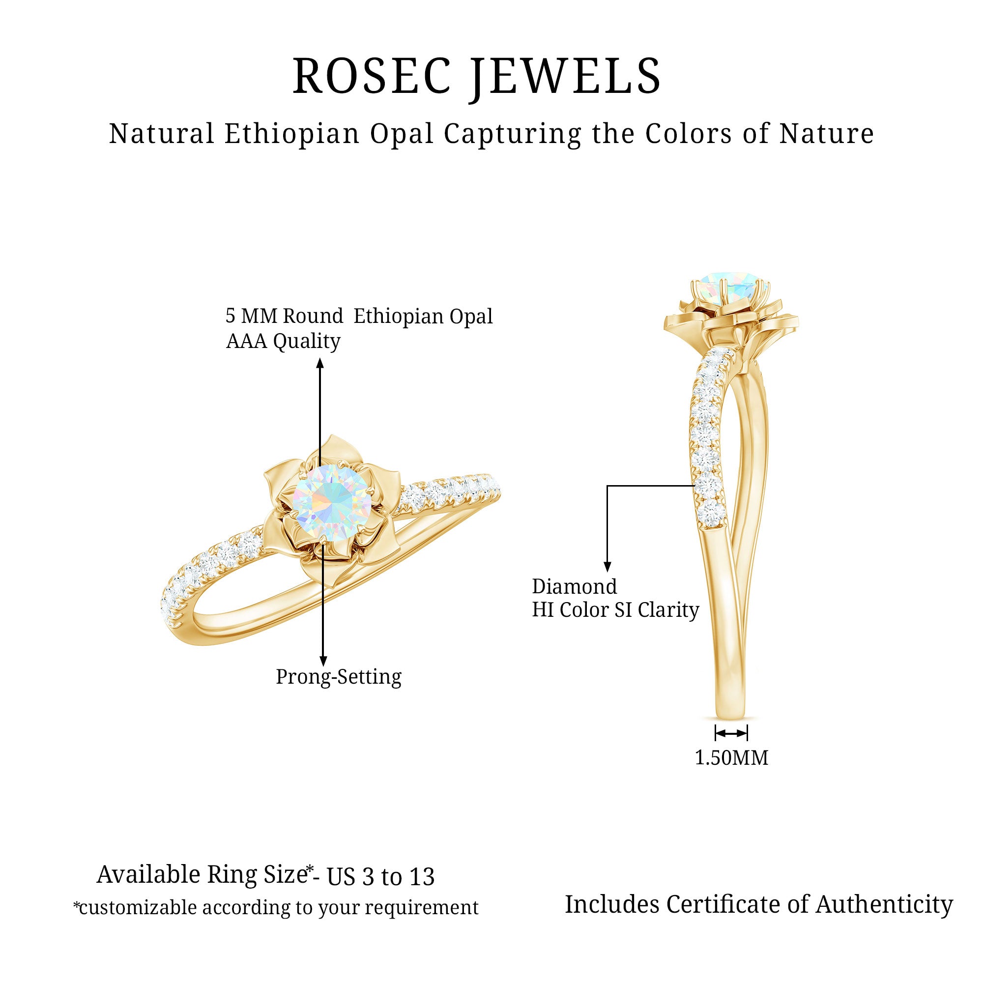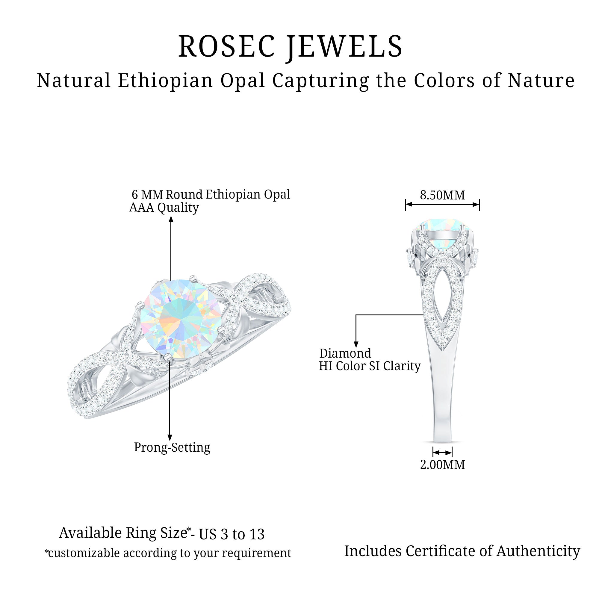 Our natural opal rings are available online at Rosec Jewels are authentic, ethically sourced, and come with a certificate. Explore the wide range and various designs of real opal rings like solitaire, halo, vintage-inspired, and others. Ethiopian opal rings have rainbow colors and look more beautiful with diamond and Moissanite.