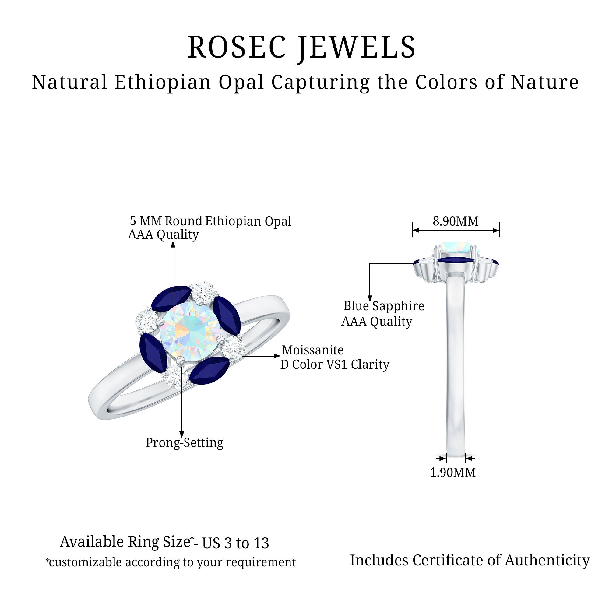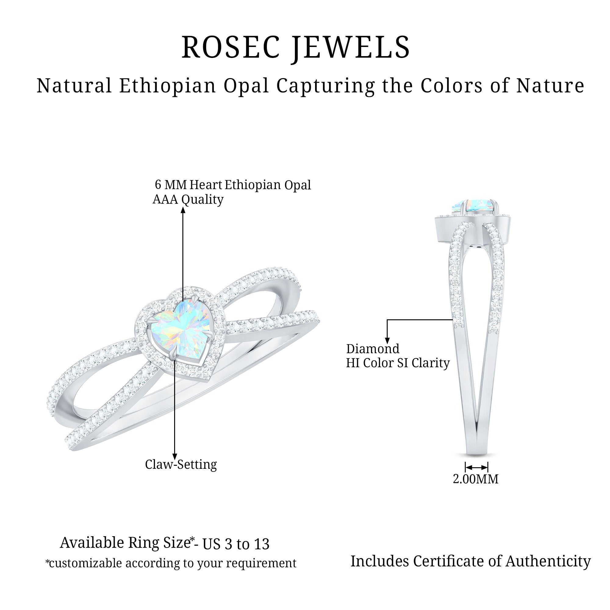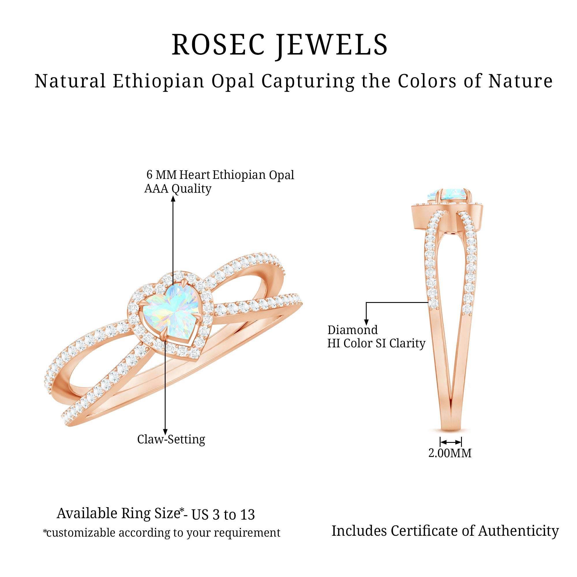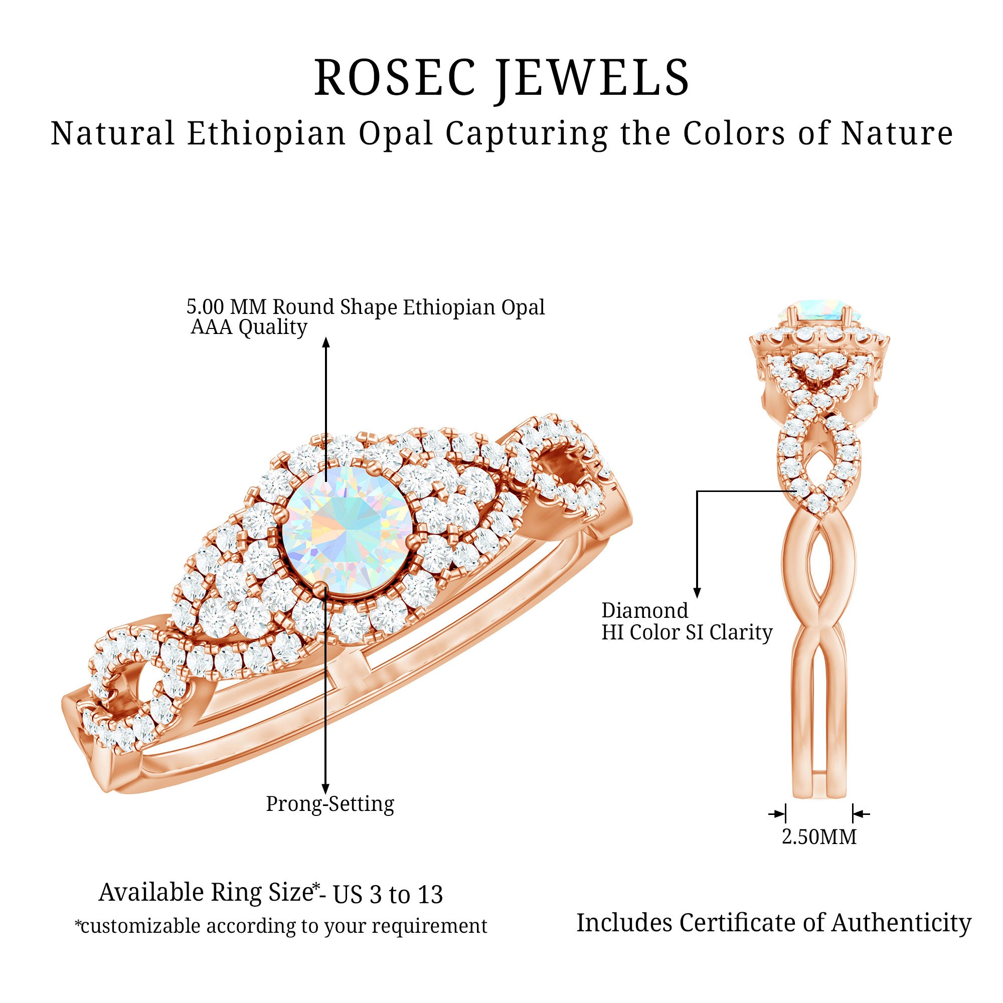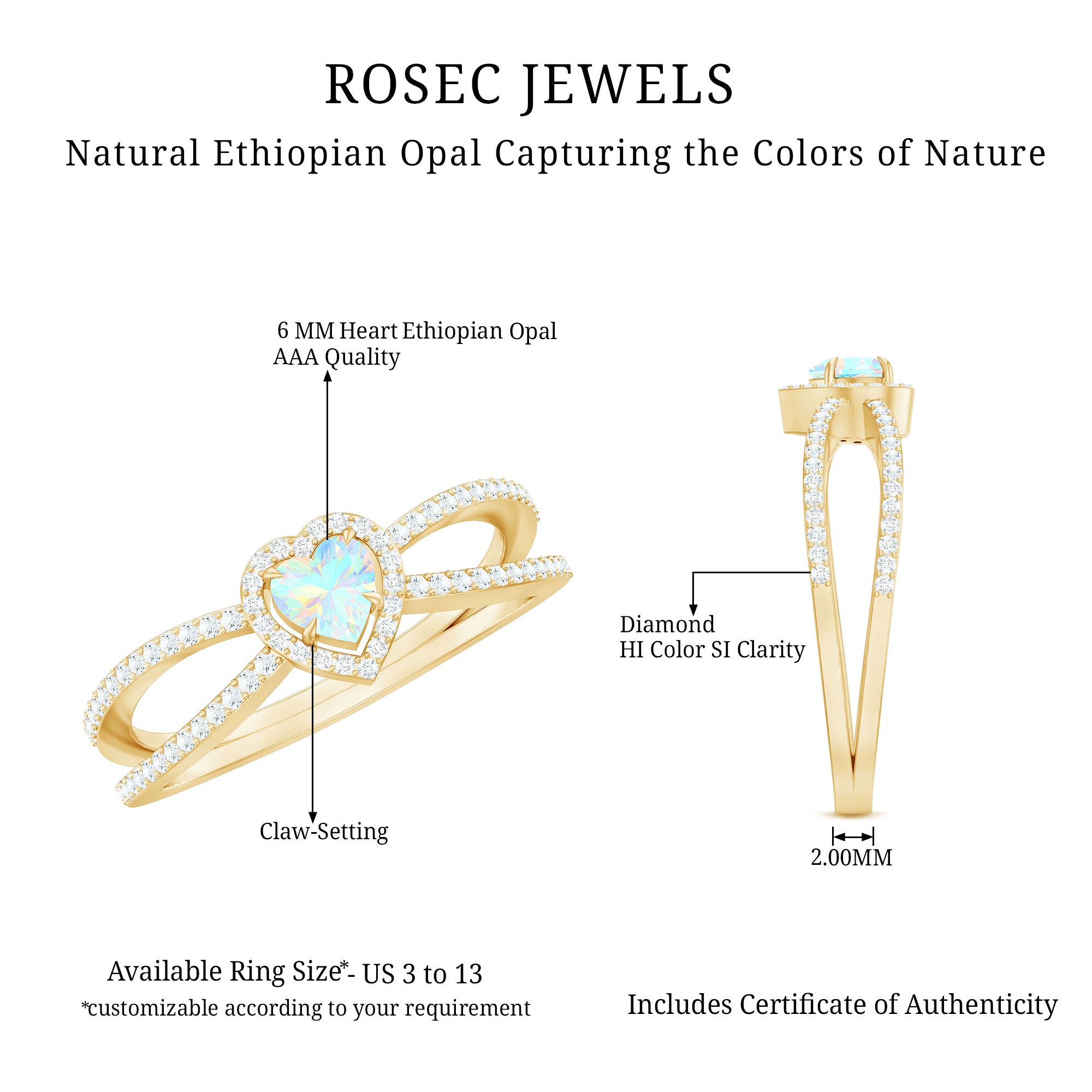 Our natural opal rings are available online at Rosec Jewels are authentic, ethically sourced, and come with a certificate. Explore the wide range and various designs of real opal rings like solitaire, halo, vintage-inspired, and others. Ethiopian opal rings have rainbow colors and look more beautiful with diamond and Moissanite.