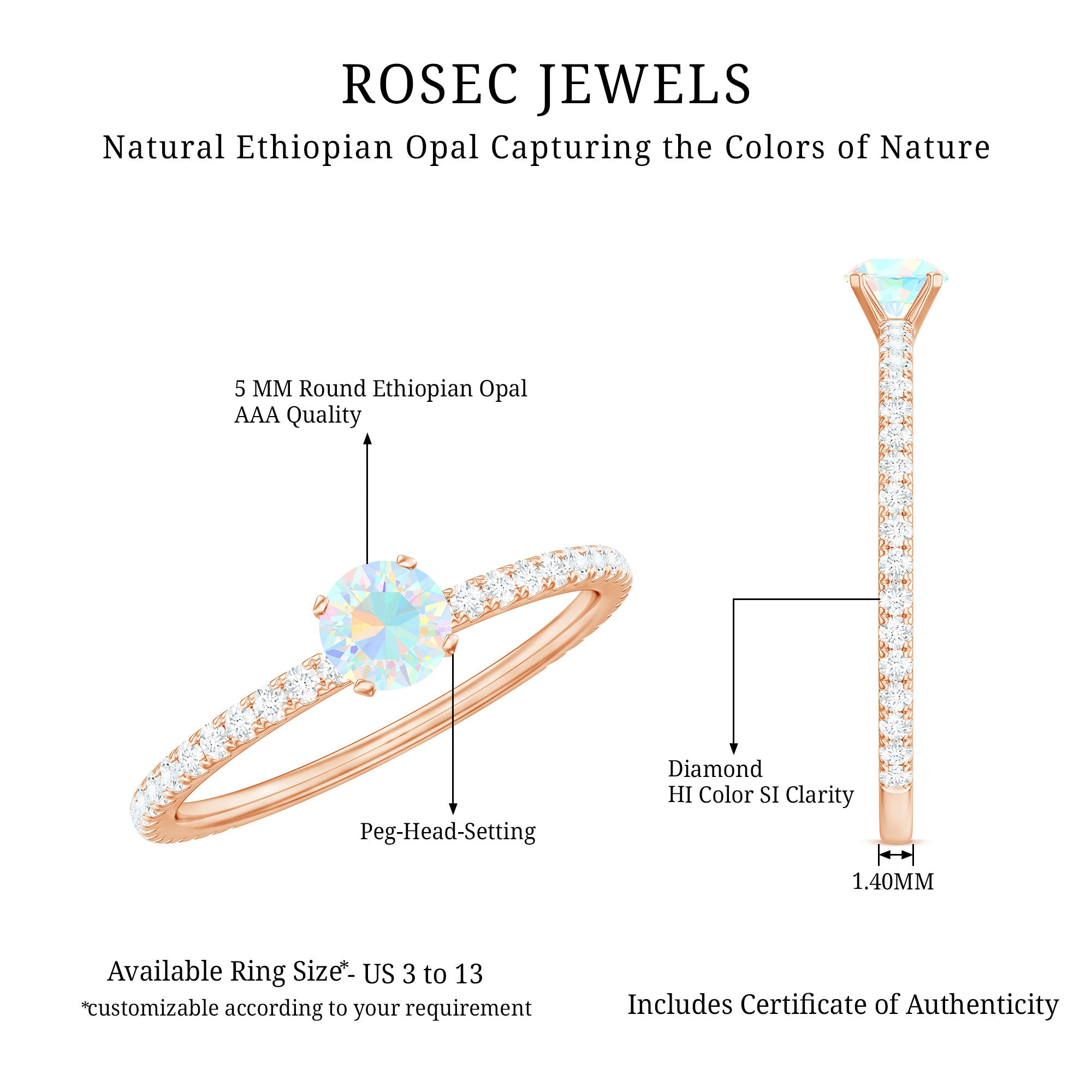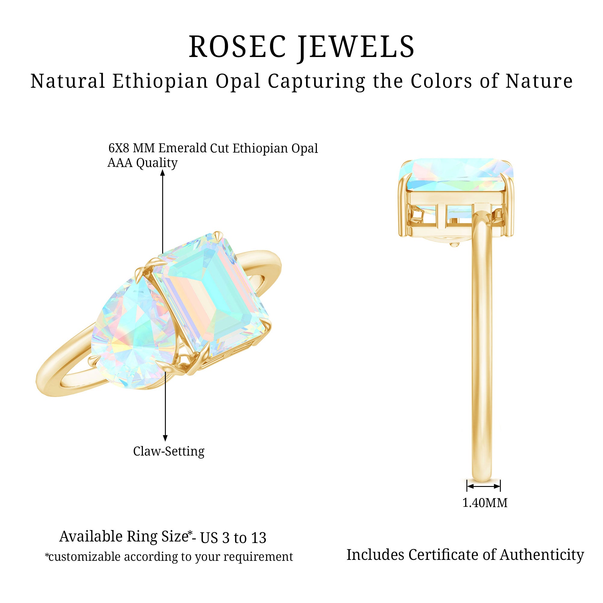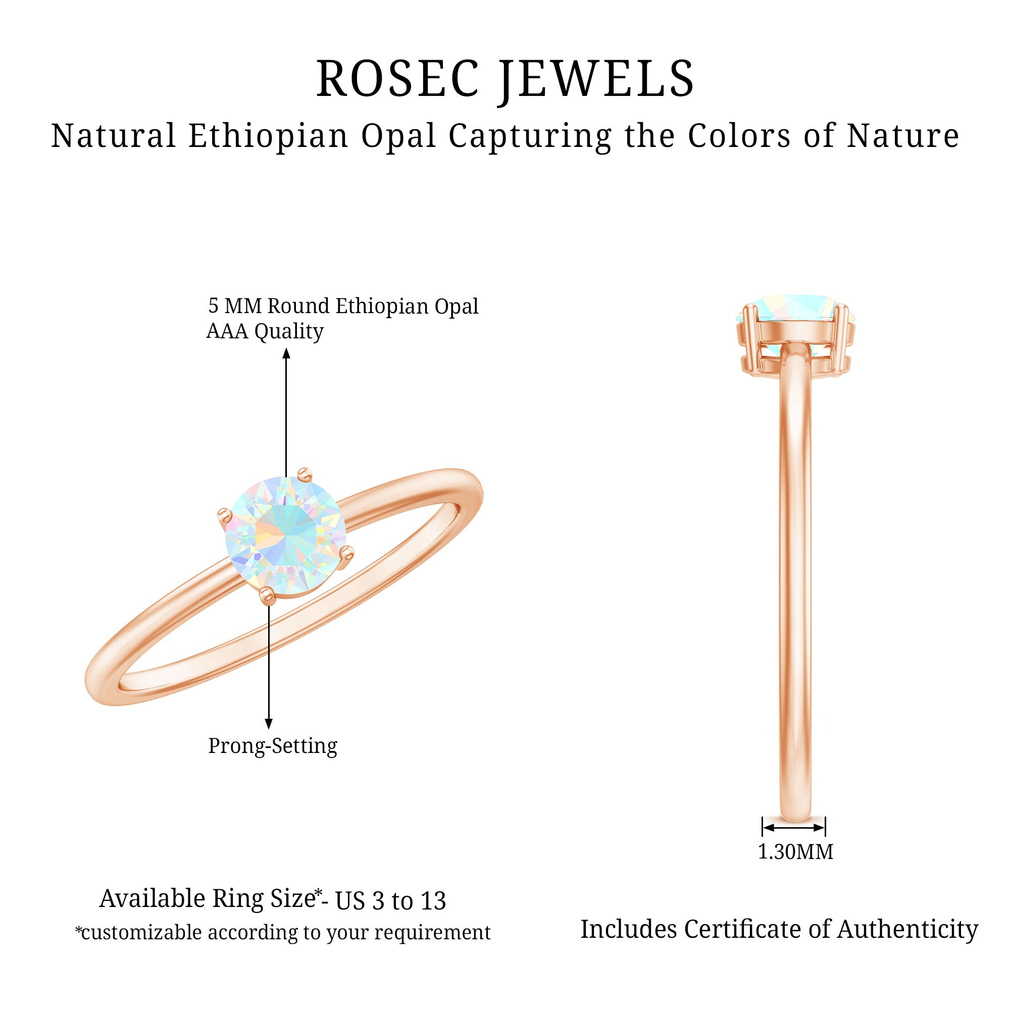 Immerse yourself in the magical world of Ethiopian opals with our stunning opal rings. Each piece is a testament to the beauty of nature and the craftsmanship of Rosec Jewels. Elevate your style and make a statement with our genuine opal rings. Shop your perfect and simple opal ring online with a certificate today!