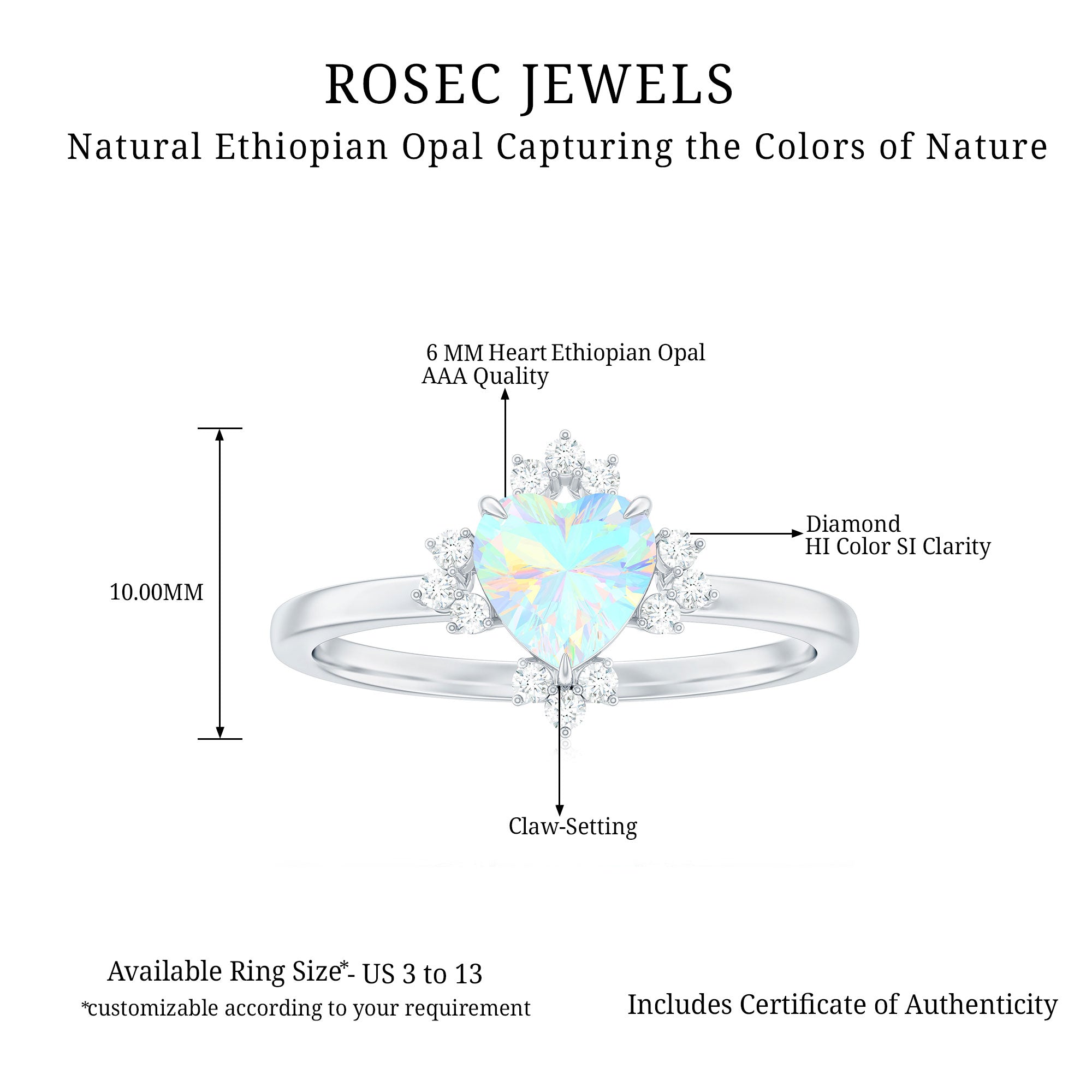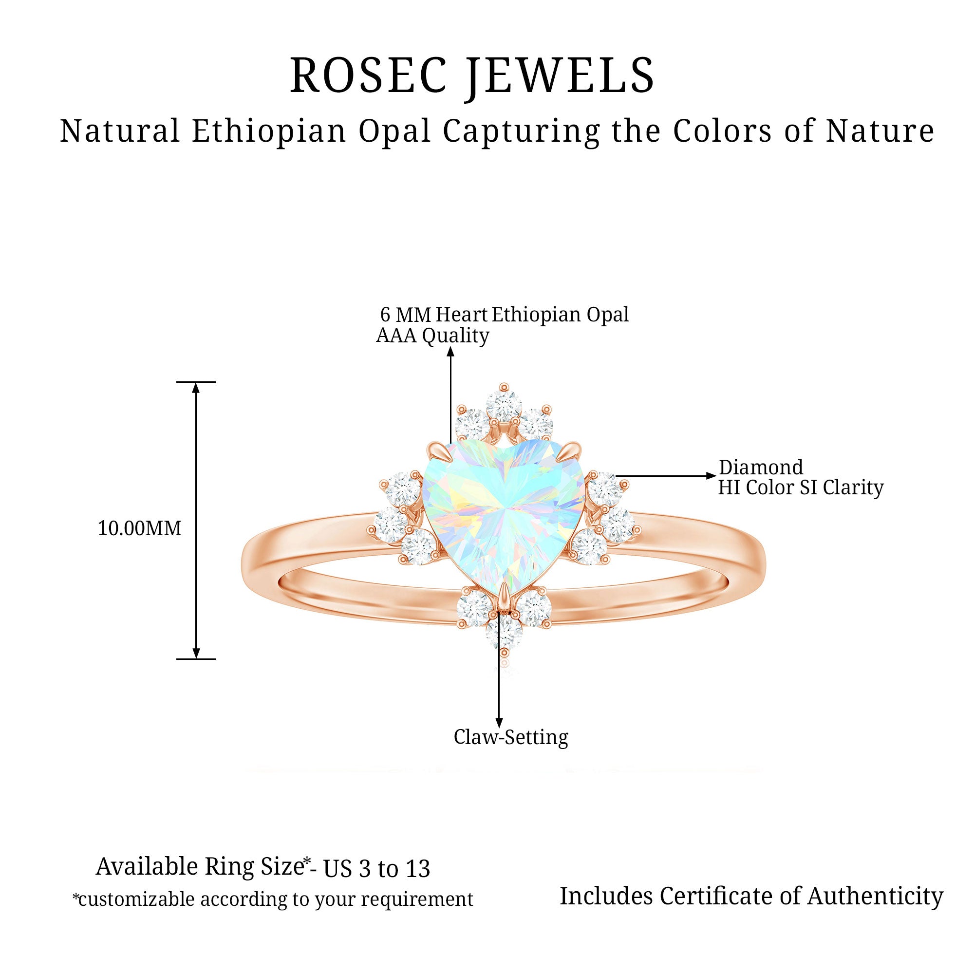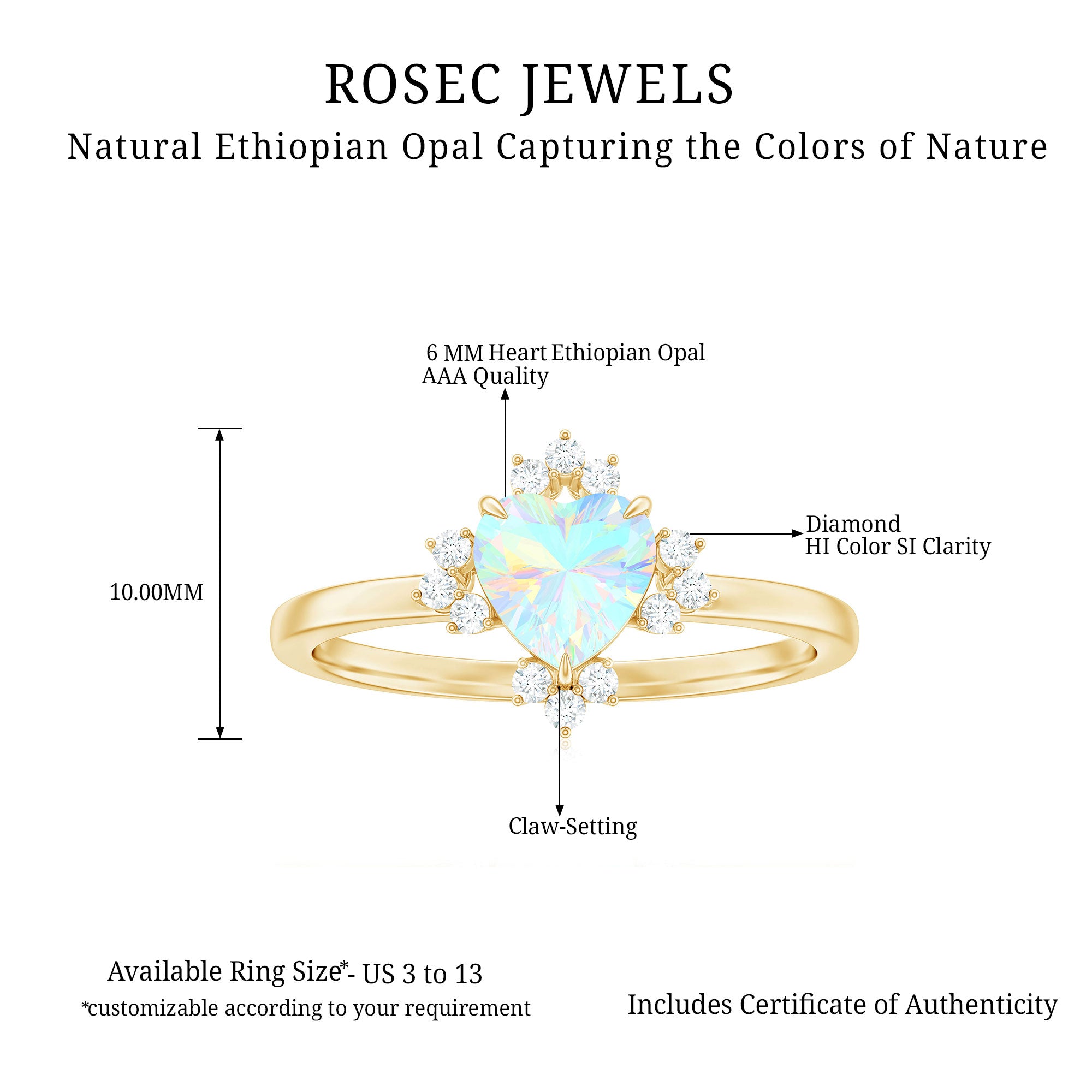 Immerse yourself in the magical world of Ethiopian opals with our stunning opal rings. Each piece is a testament to the beauty of nature and the craftsmanship of Rosec Jewels. Elevate your style and make a statement with our genuine opal rings. Shop your perfect and simple opal ring online with a certificate today!