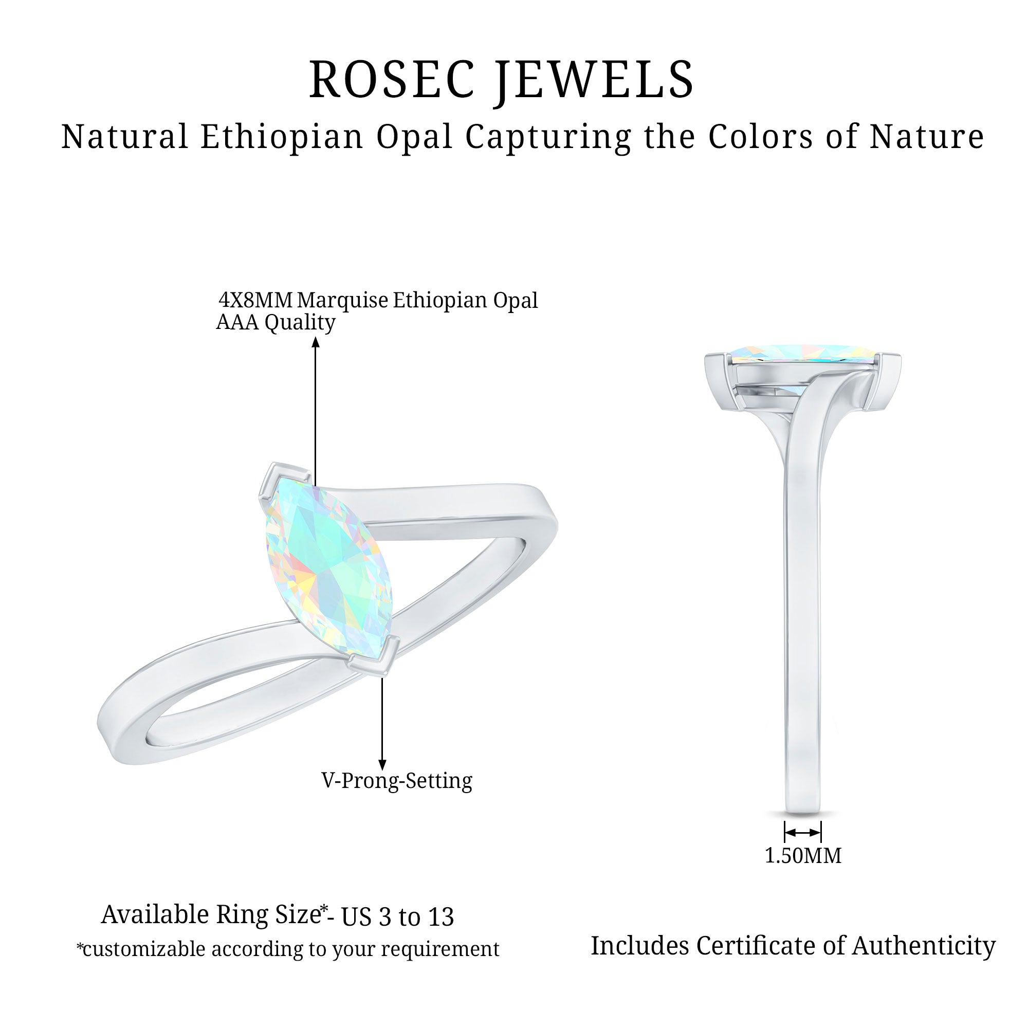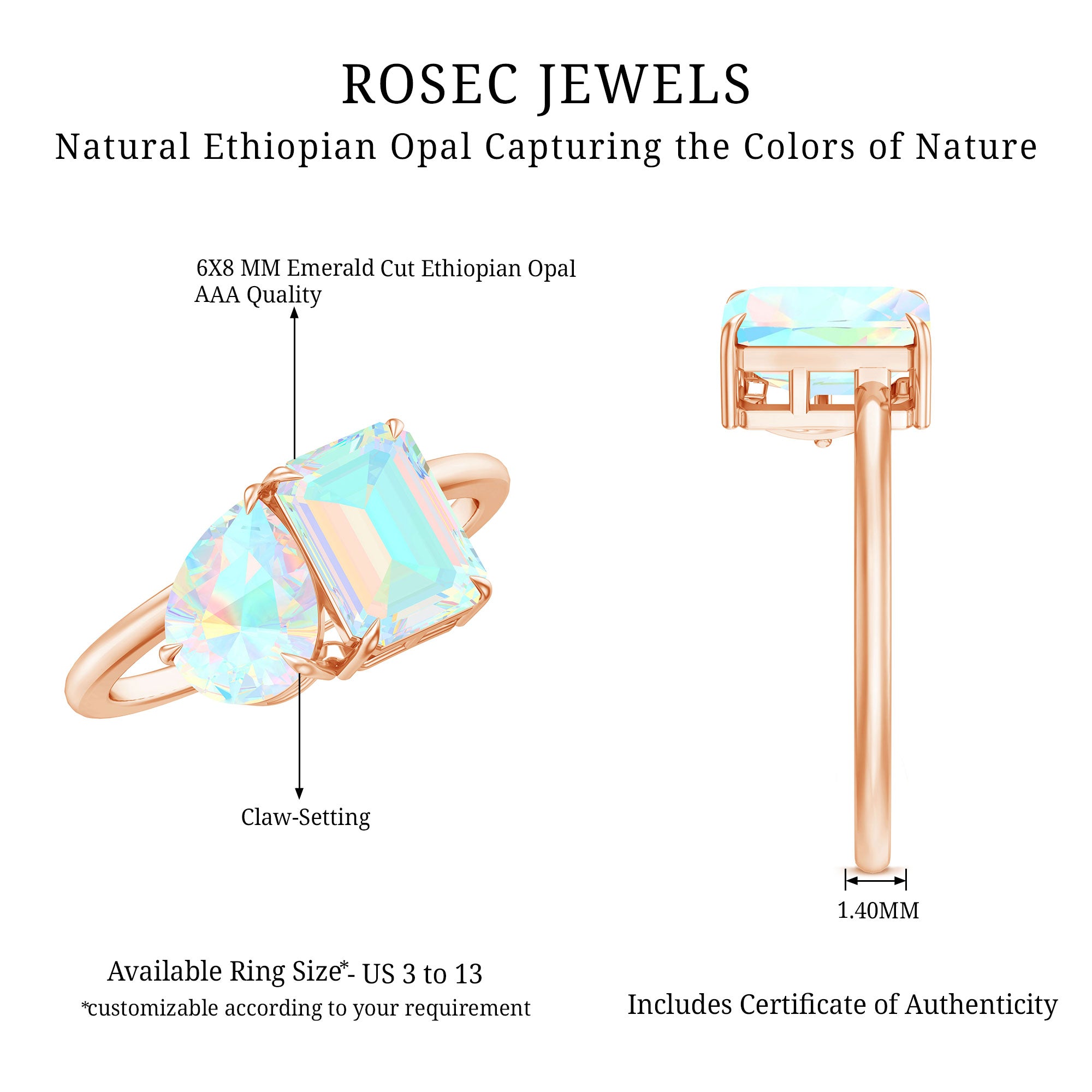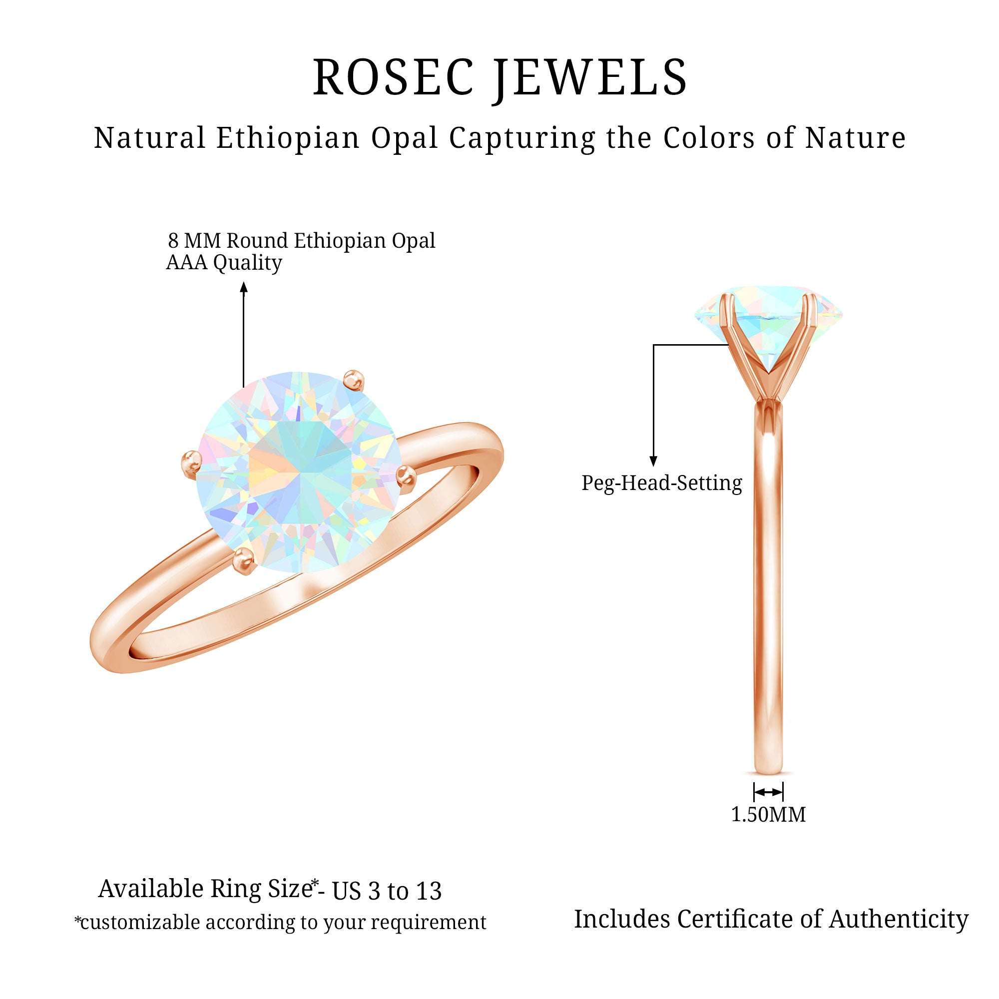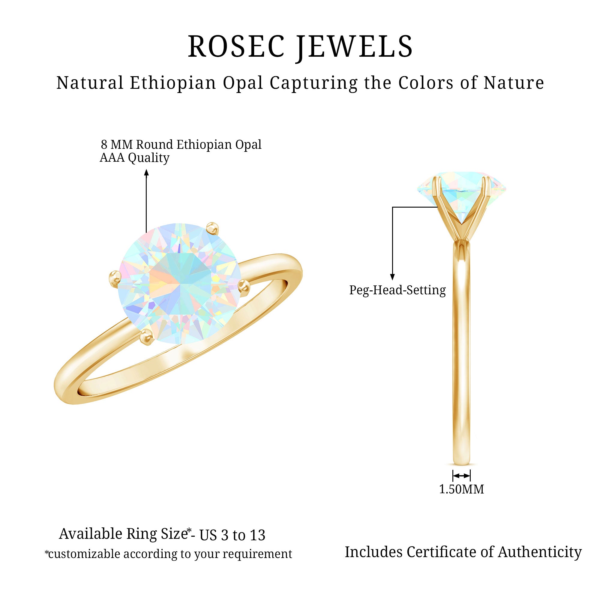 Rosec Jewels has been in the jewelry manufacturing service for a long time. We have skilled and expert jewelers who create fine pieces of handmade rings. We have a gemologist, who tests every gem carefully and always chooses only the best quality of Ethiopian opals. Our expert artists create these stunning opal rings with care and expertise.