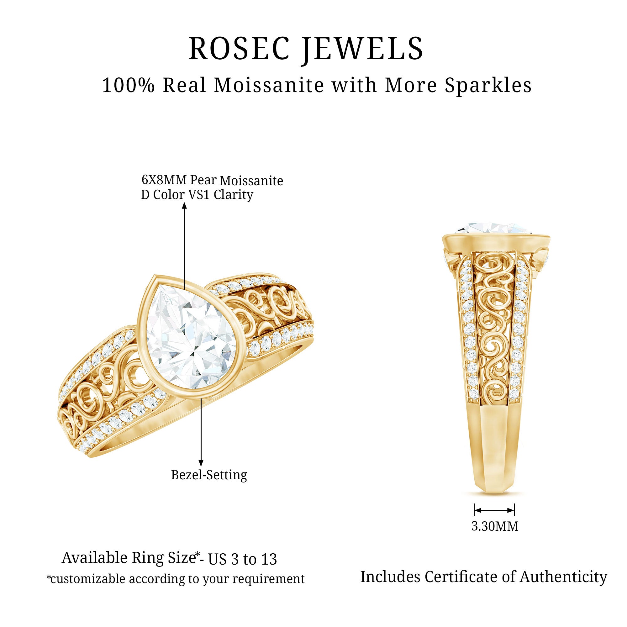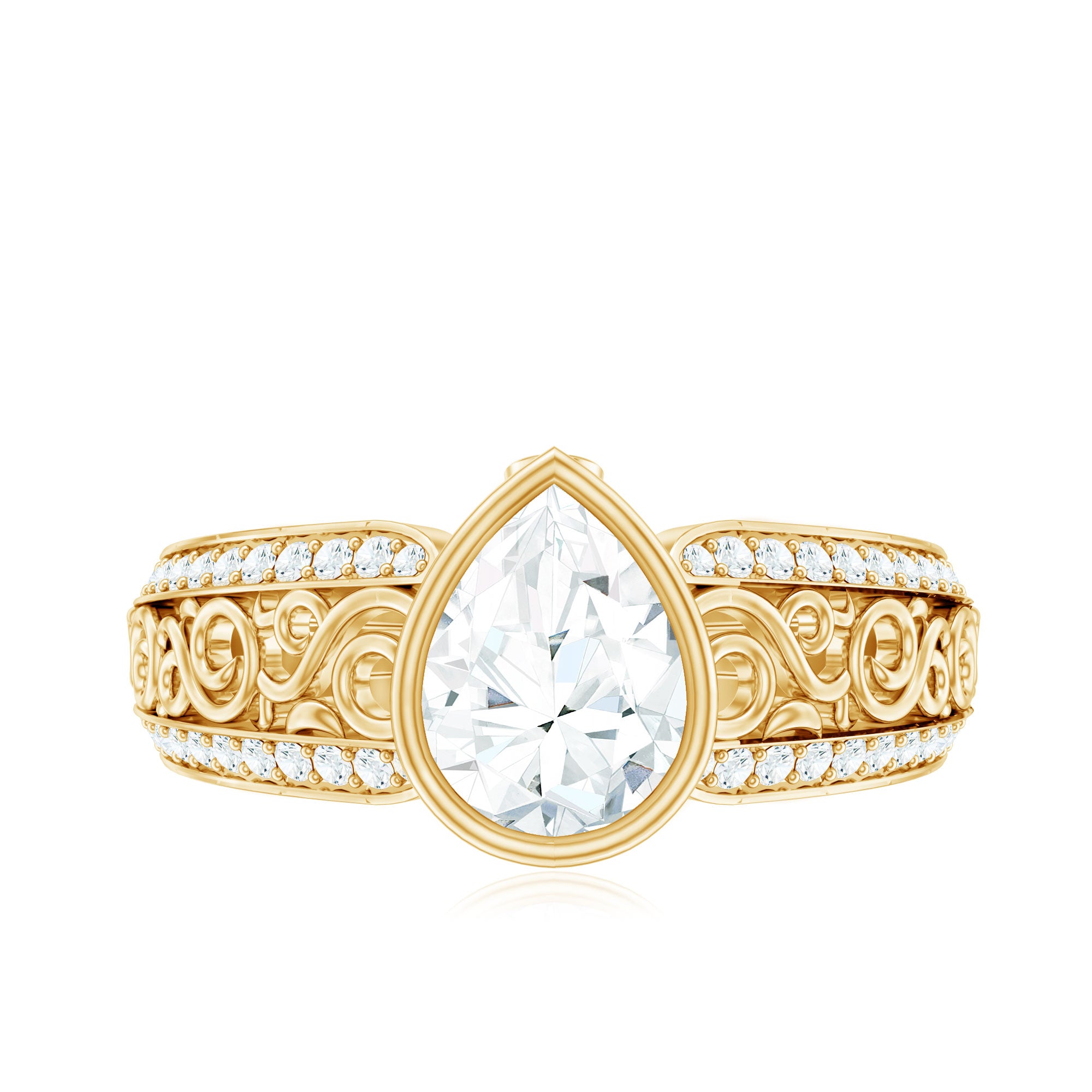 Bezel Setting: Pear engagement rings in bezel setting are among the top choices. As the most delicate pointed tip of the gemstone is wrapped in the metal offering complete protection. This setting helps prevent damage and avoids snagging on clothes, making a teardrop engagement ring a practical choice for everyday wear.