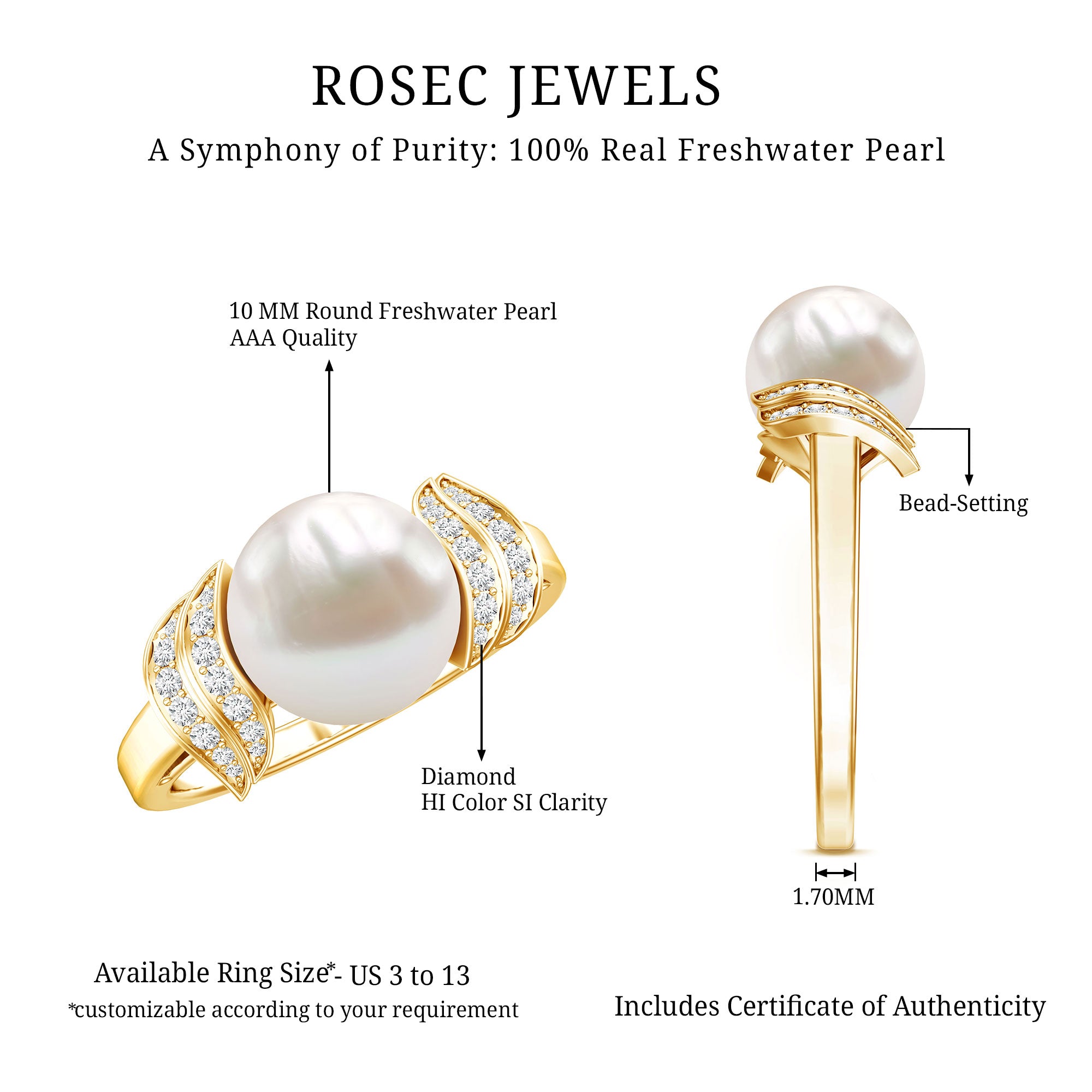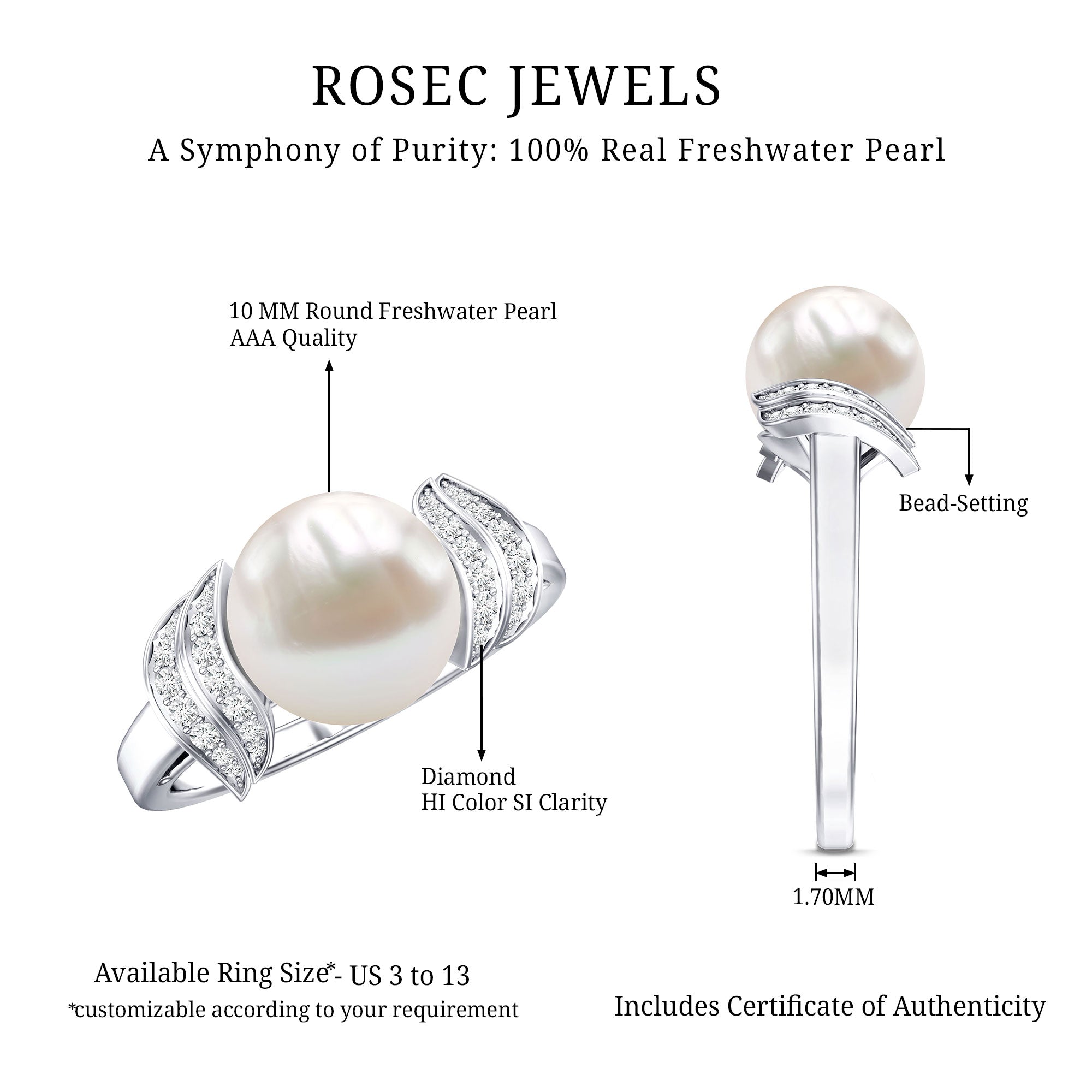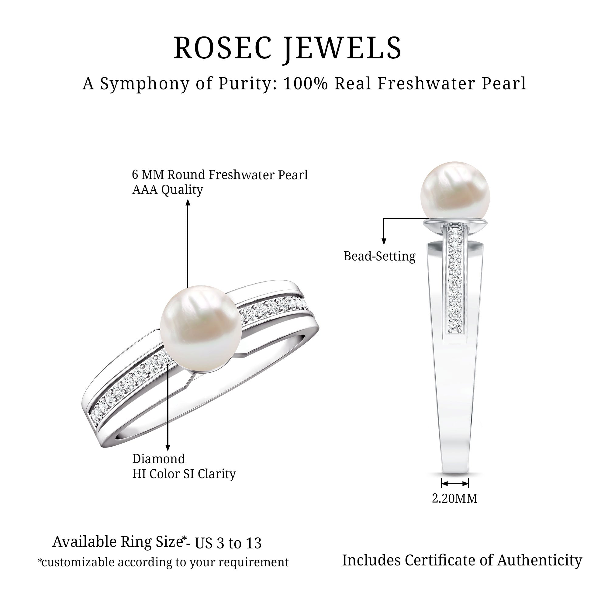 Freshwater Pearl Solitaire Rings: - Features a single pearl, set to grab the attention as a centerpiece. Our freshwater pearl solitaire rings are sought-after for their refinement and simplicity. Typically, solitaire pearl rings crafted in metal bands like white gold, yellow gold, and sterling silver, create timeless elegance for wearers.