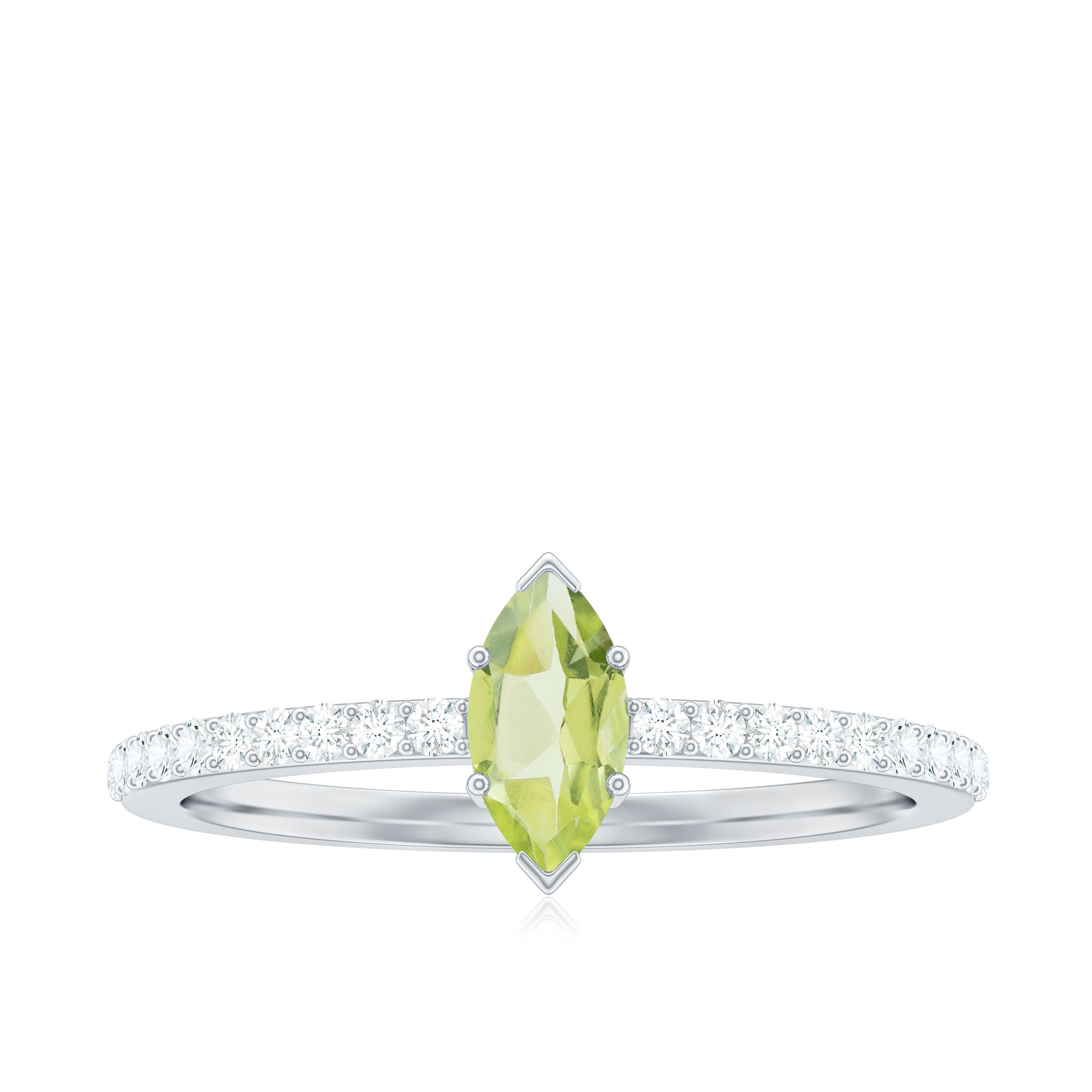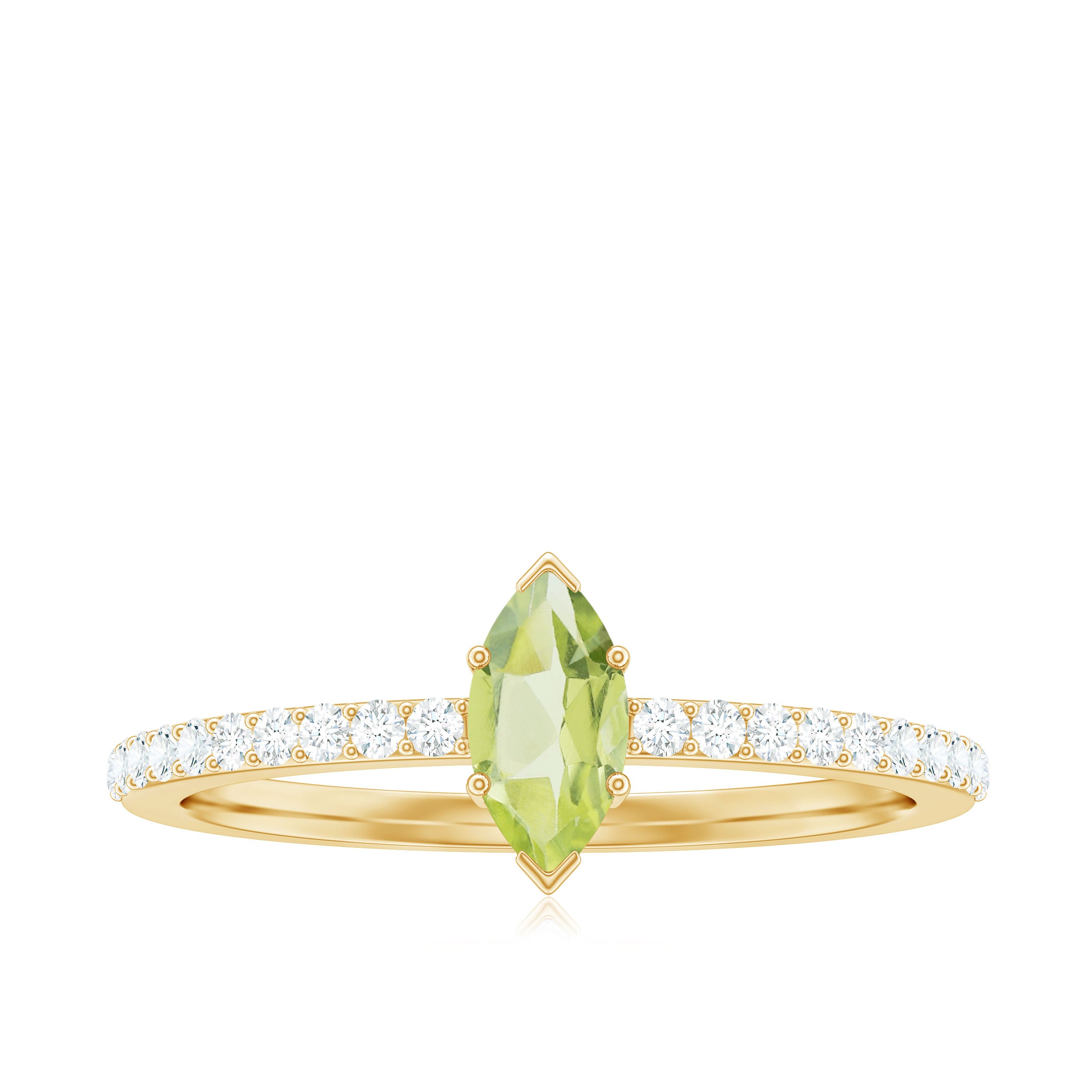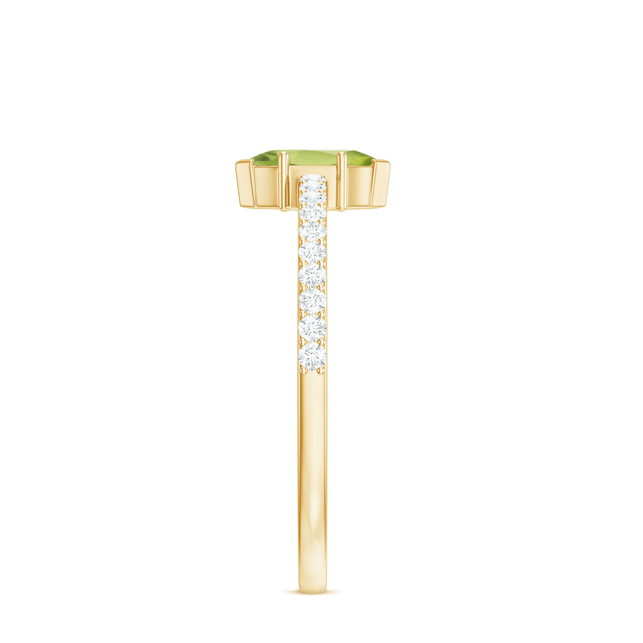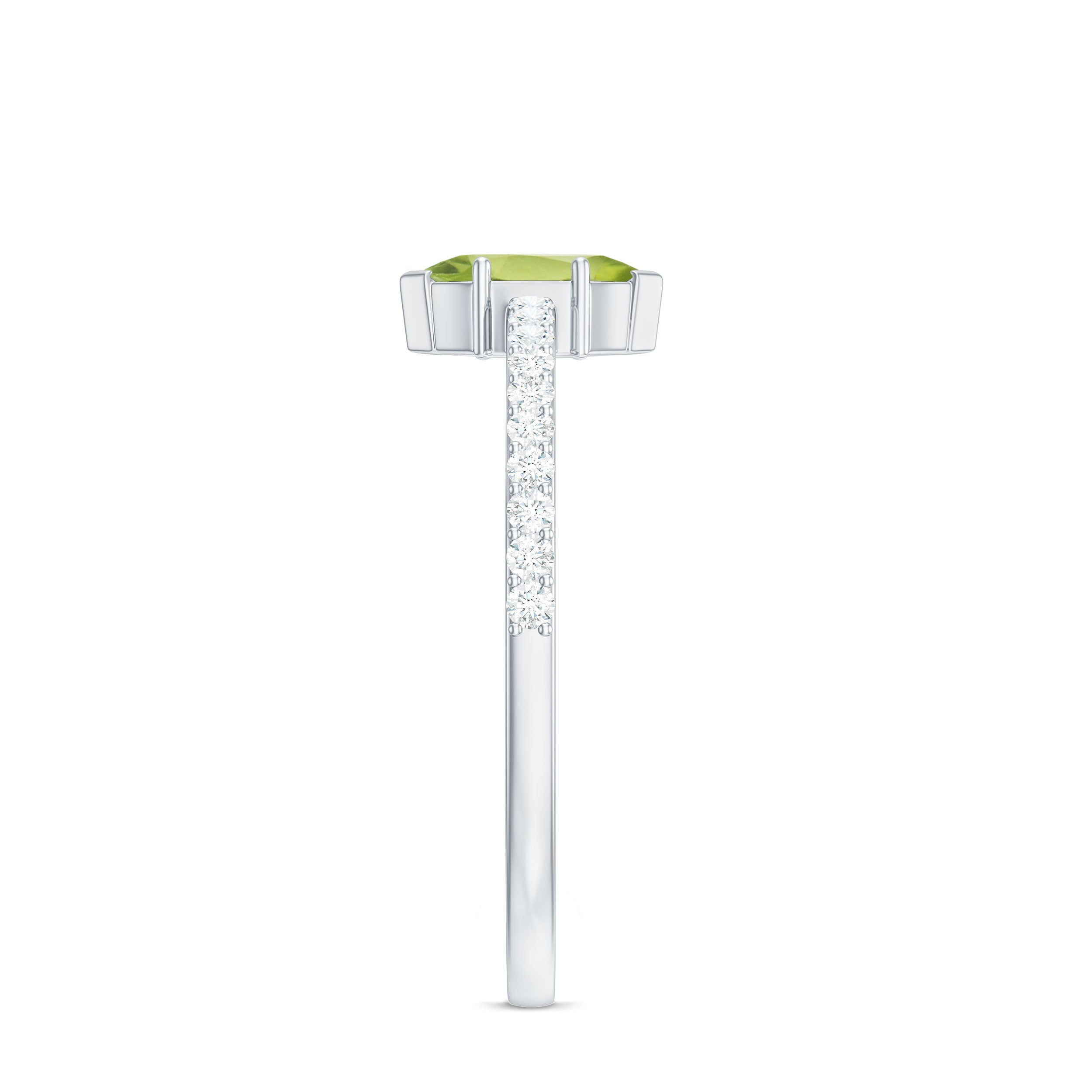 Held in high regard as one of the most classic Peridot Engagement Rings out there, it is characterized by a solo centerpiece of Peridot that steals the limelight. It can also be labeled as the most versatile ring style since the Peridot Solitaire offers you a sea of options in terms of aesthetics, be it the classic Round Peridot Rings offering a traditional aesthetic, the ones fashioned with Pear, Marquise, and Princess exuding an unconventional touch, or Asscher and Emerald Cut Peridot Rings for that perfect vintage vibe.