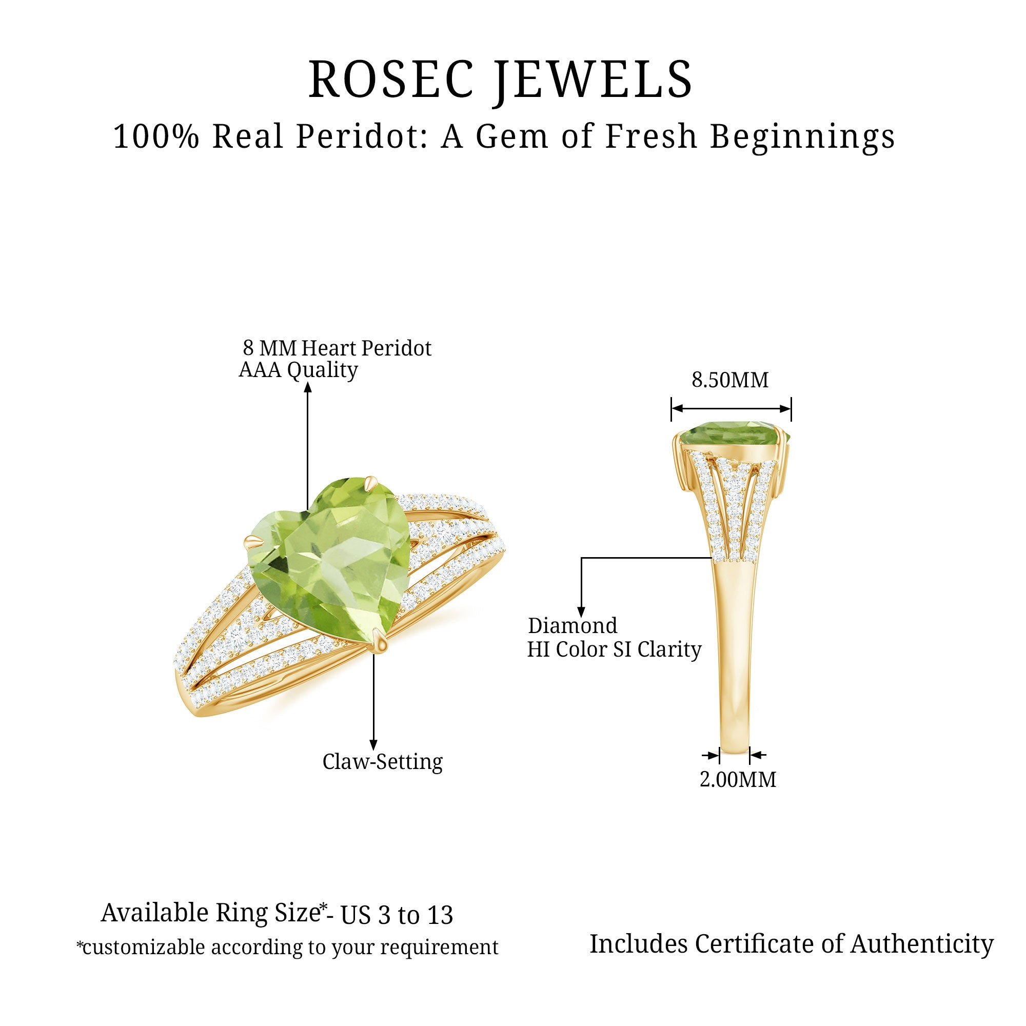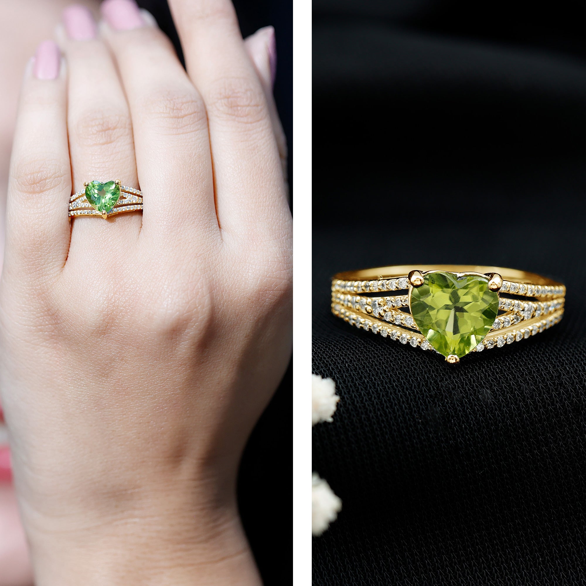 Held in high regard as one of the most classic Peridot Engagement Rings out there, it is characterized by a solo centerpiece of Peridot that steals the limelight. It can also be labeled as the most versatile ring style since the Peridot Solitaire offers you a sea of options in terms of aesthetics, be it the classic Round Peridot Rings offering a traditional aesthetic, the ones fashioned with Pear, Marquise, and Princess exuding an unconventional touch, or Asscher and Emerald Cut Peridot Rings for that perfect vintage vibe.