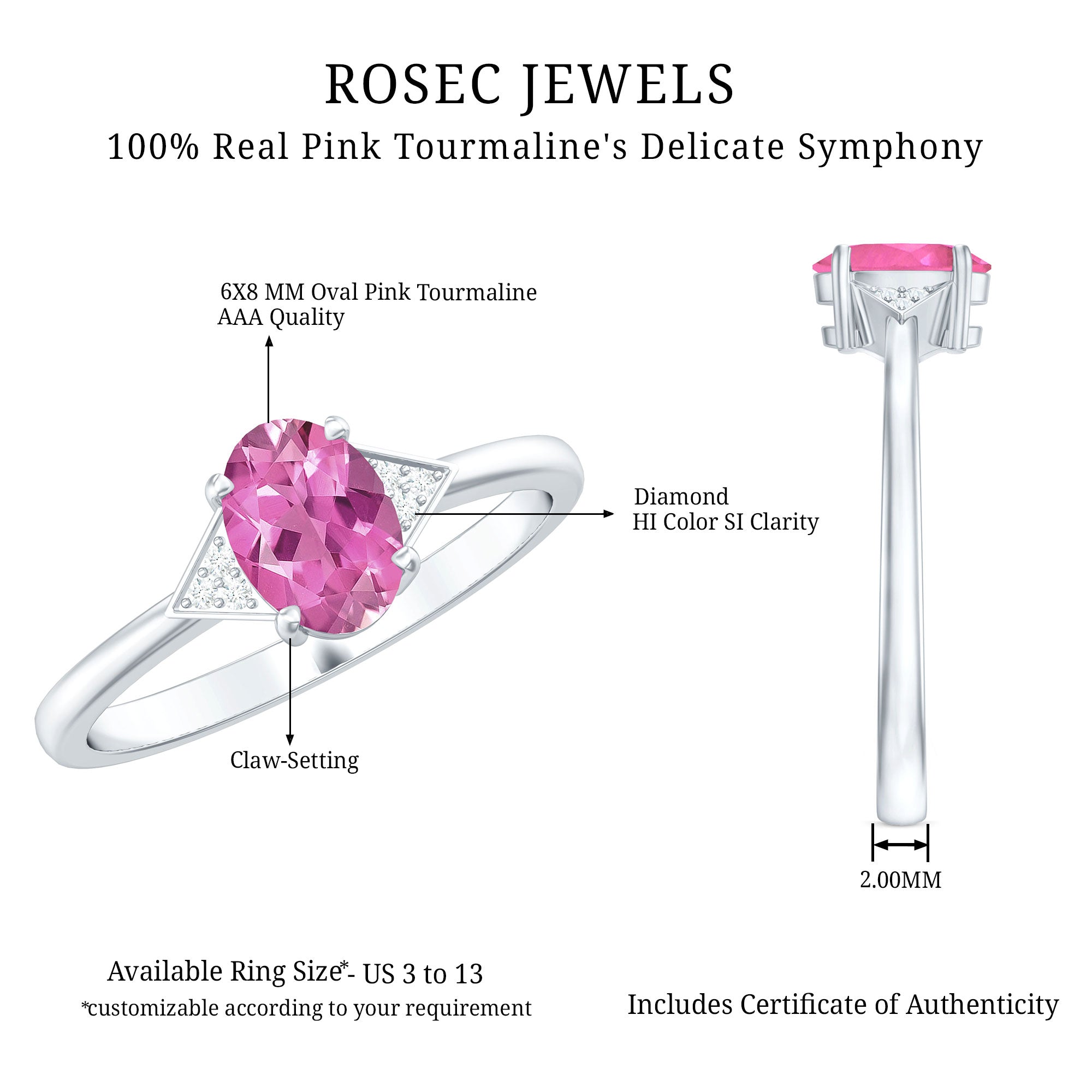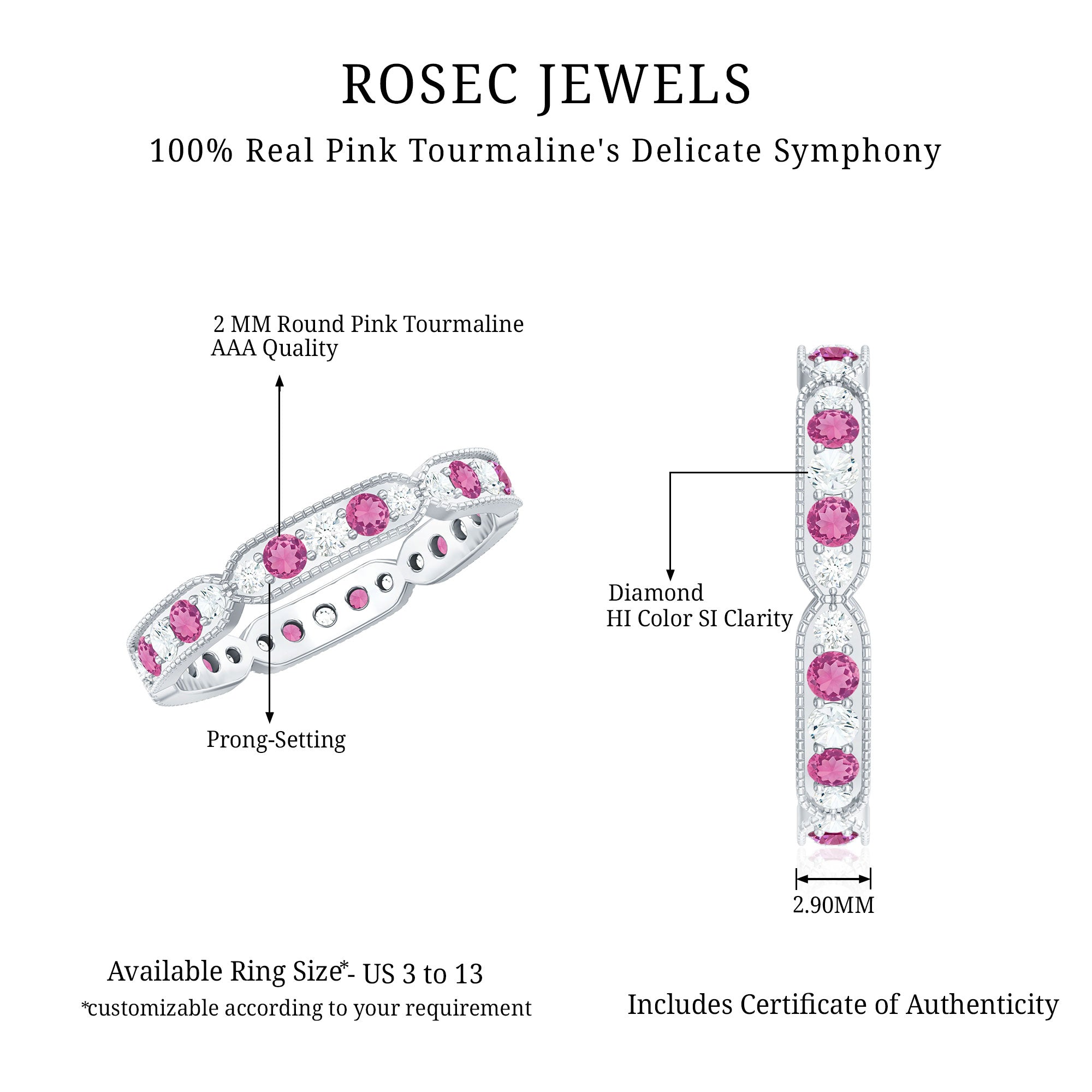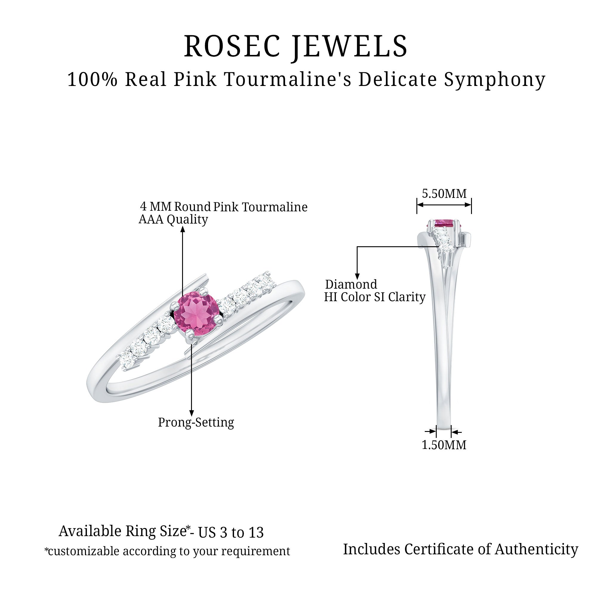 Unlike its specific symbolism, a Pink Tourmaline Promise Ring isn’t defined by a set style. It could be a Classic Pink Tourmaline Solitaire Ring that is relatively understated thanks to its dainty size of 4 MM. Or to lend a decorative visual appeal, it could be accentuated with side-stones of Diamond/Moissanite, floral or nature-inspired detailing, or even meaningful infinity motifs.