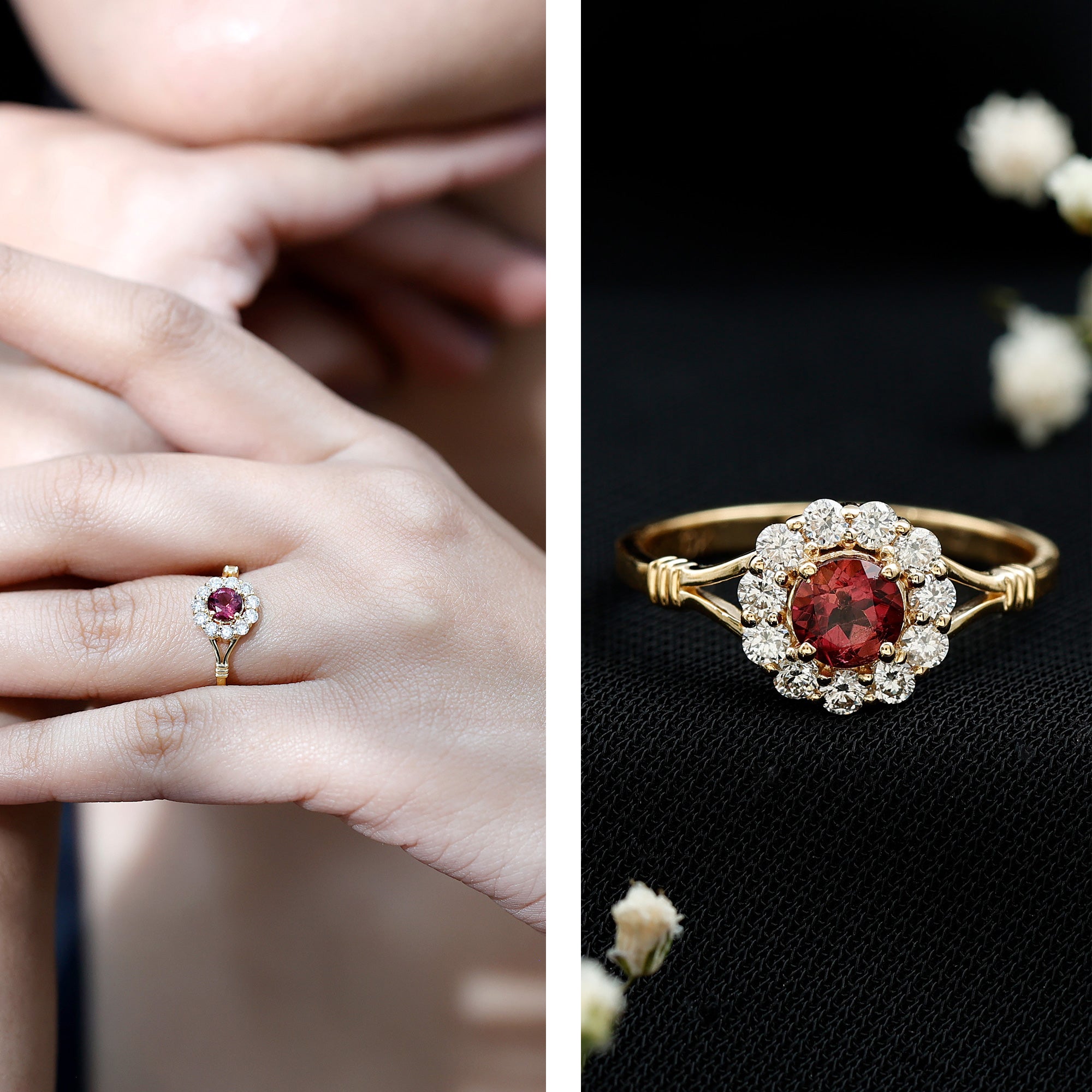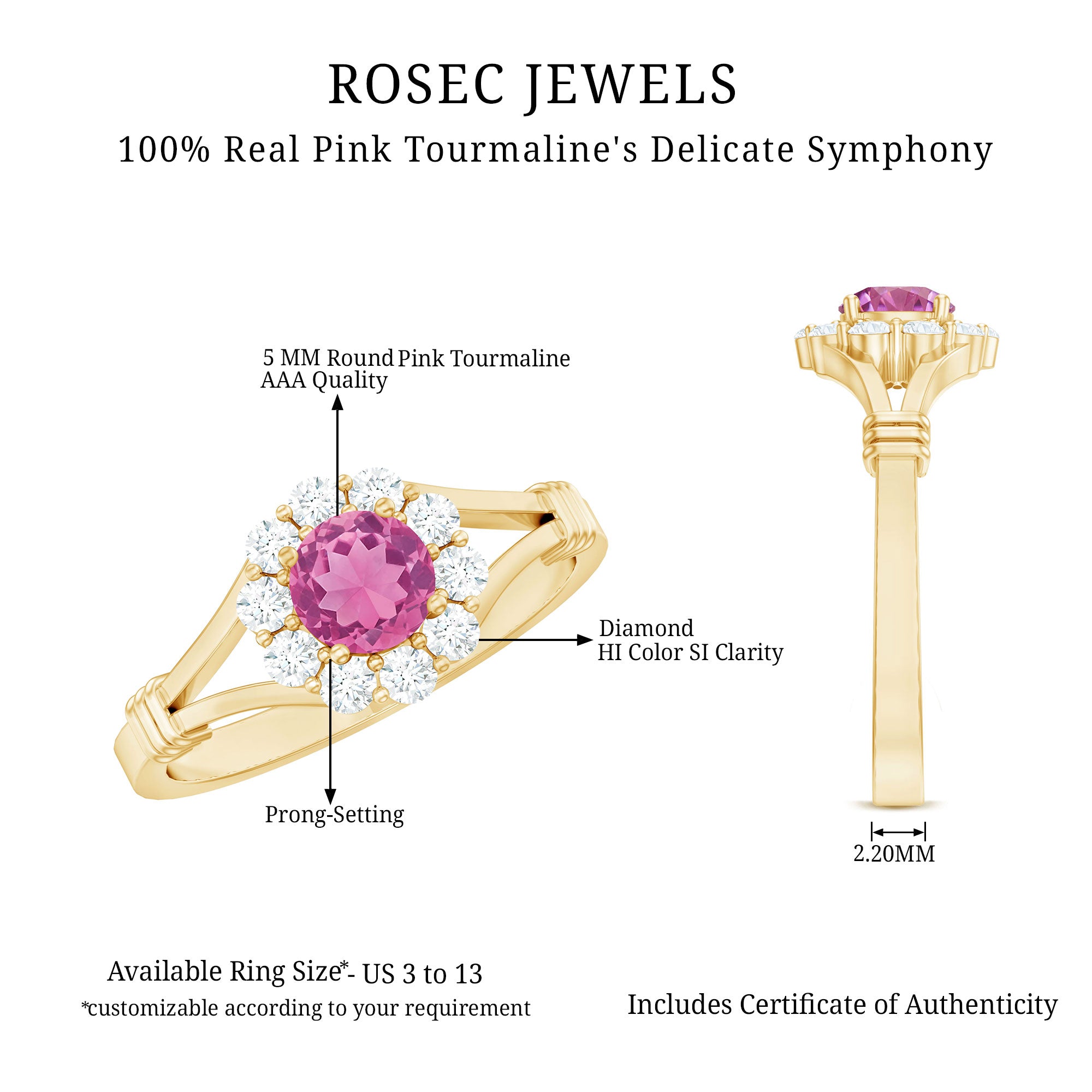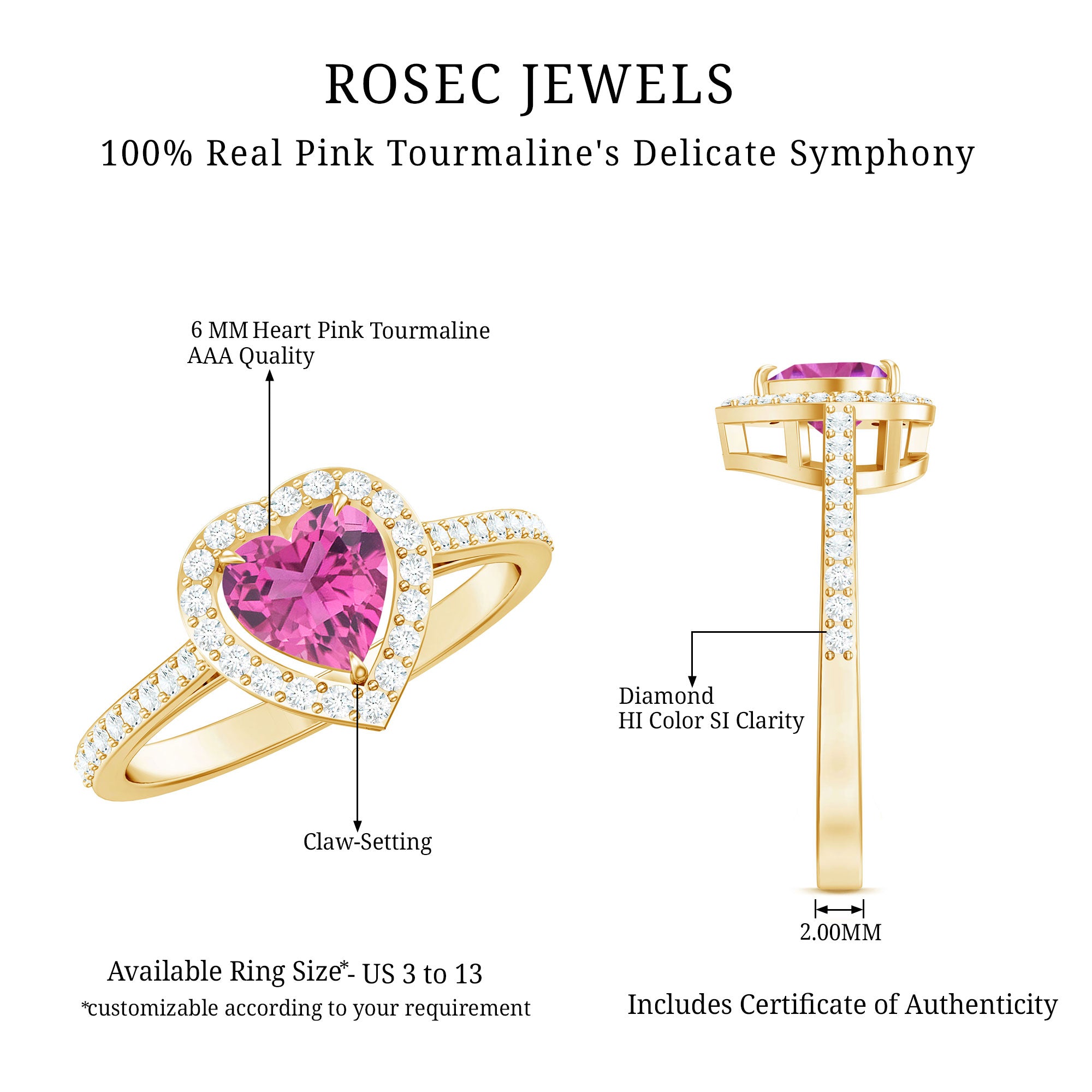 Each ring is crafted in your choice of metal tone that exudes different aesthetics. While a White Gold Pink Tourmaline Ring speaks to an understated sense of style, the one fashioned in yellow gold resonates with conventional aesthetics.On the other hand, a Pink Tourmaline Rose Gold Ring appears fascinatingly feminine with its blush-gold appeal complementing the pink hue of Tourmaline.