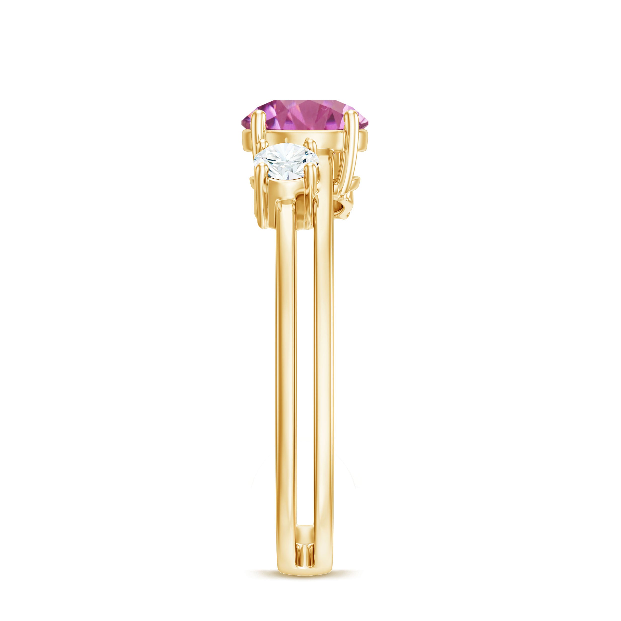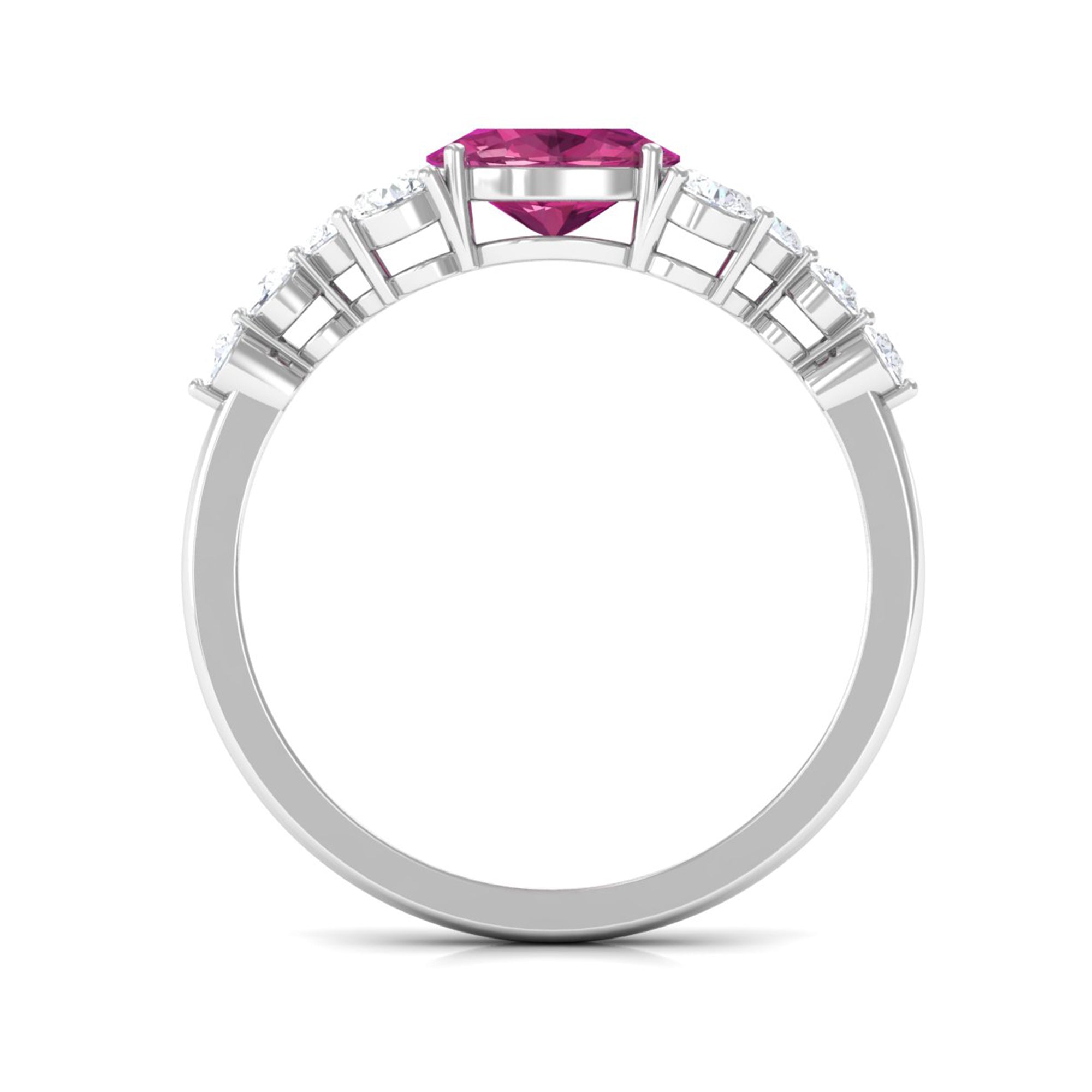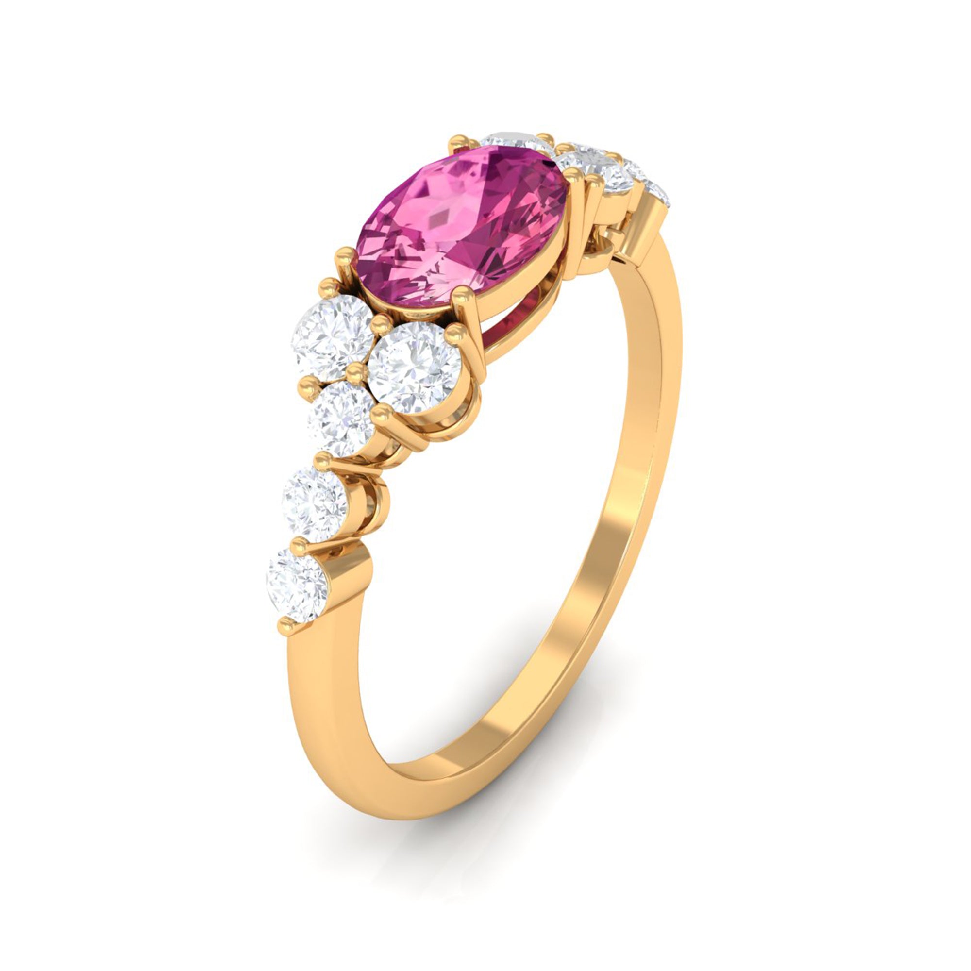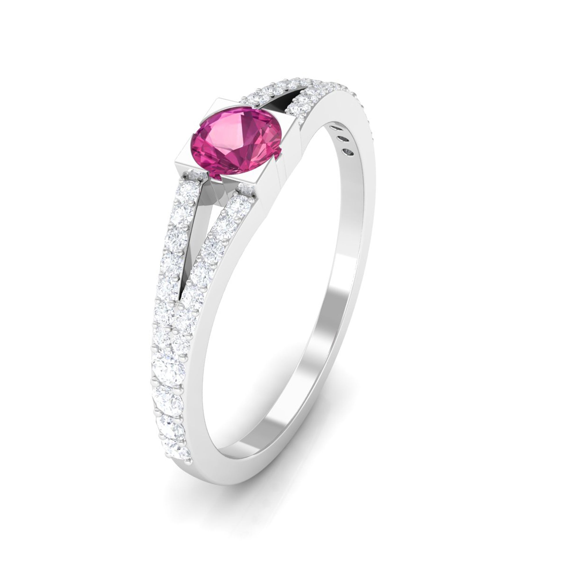 Lending an edgy appeal to the Simple Solitaire Style, this ring style is characterized by a parade of Diamond/Moissanite all around the Pink Tourmaline. The Halo doesn’t just brighten up the look of your Pretty Pink Center Stone but also helps it stand out by lending it an illusion of a bigger size. For those who fancy some sparkles in their emblem of love, it makes for a beautiful Pink Tourmaline Engagement Ring.
