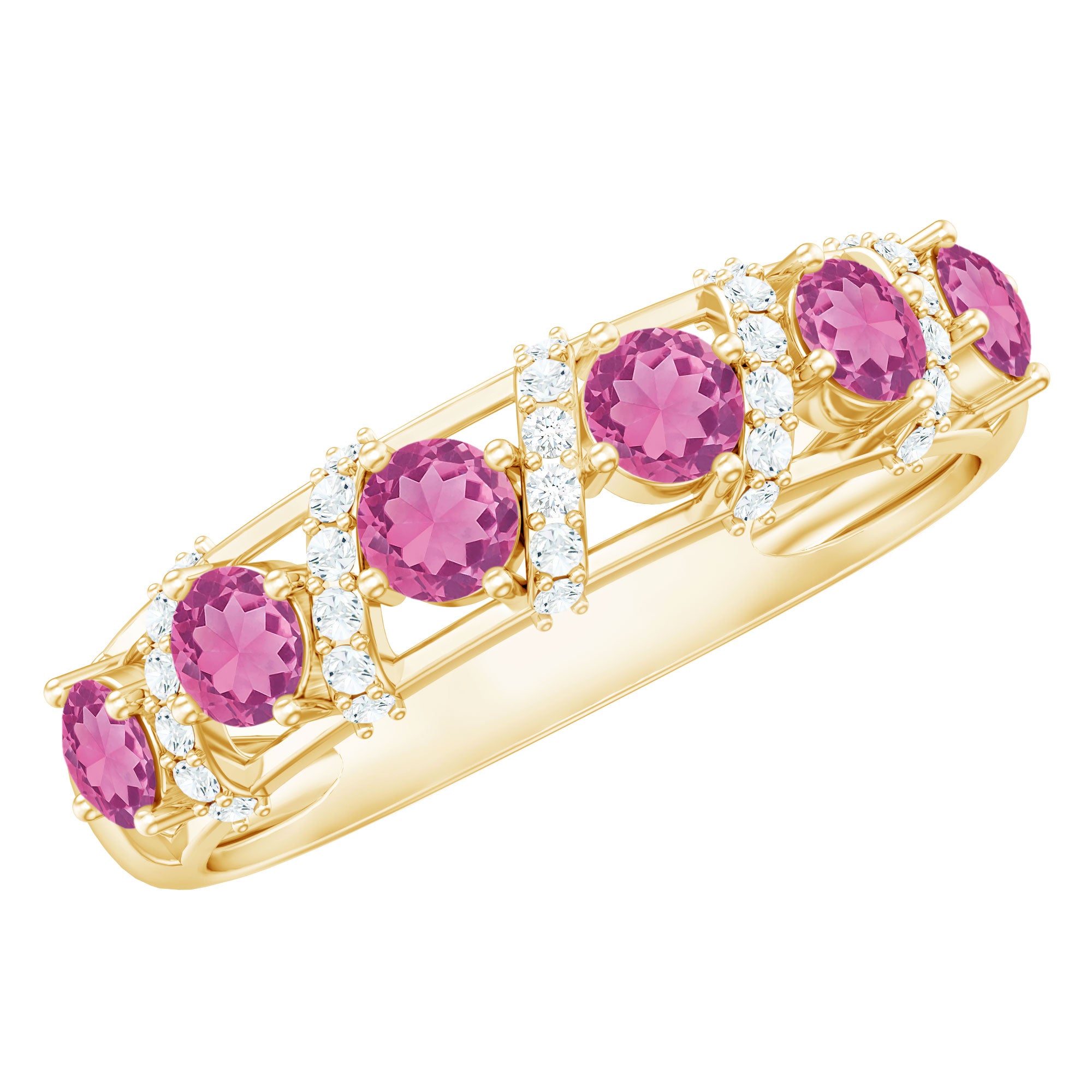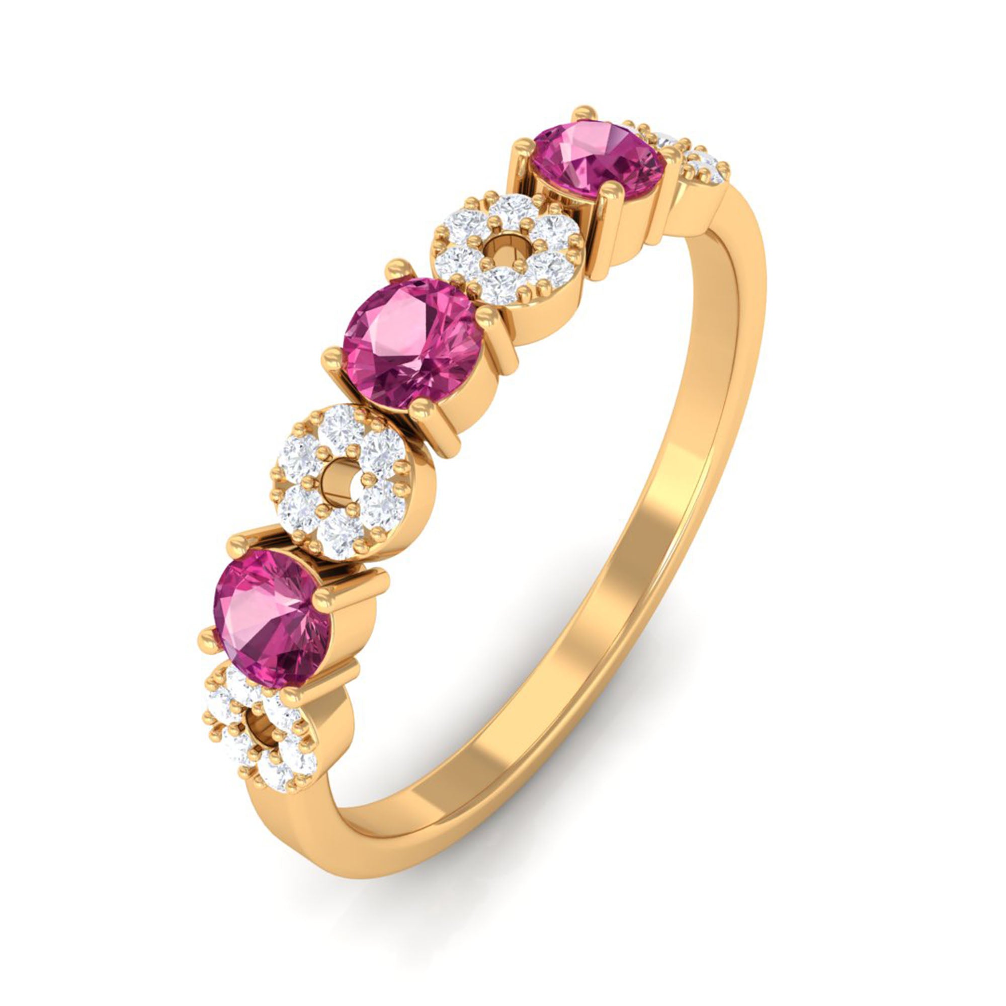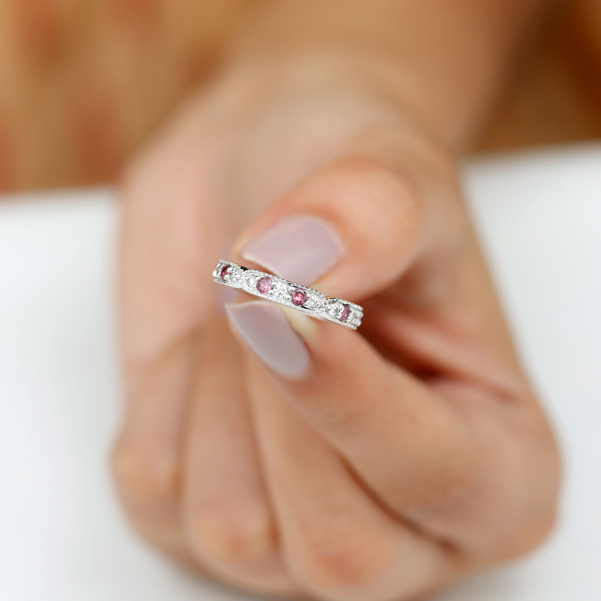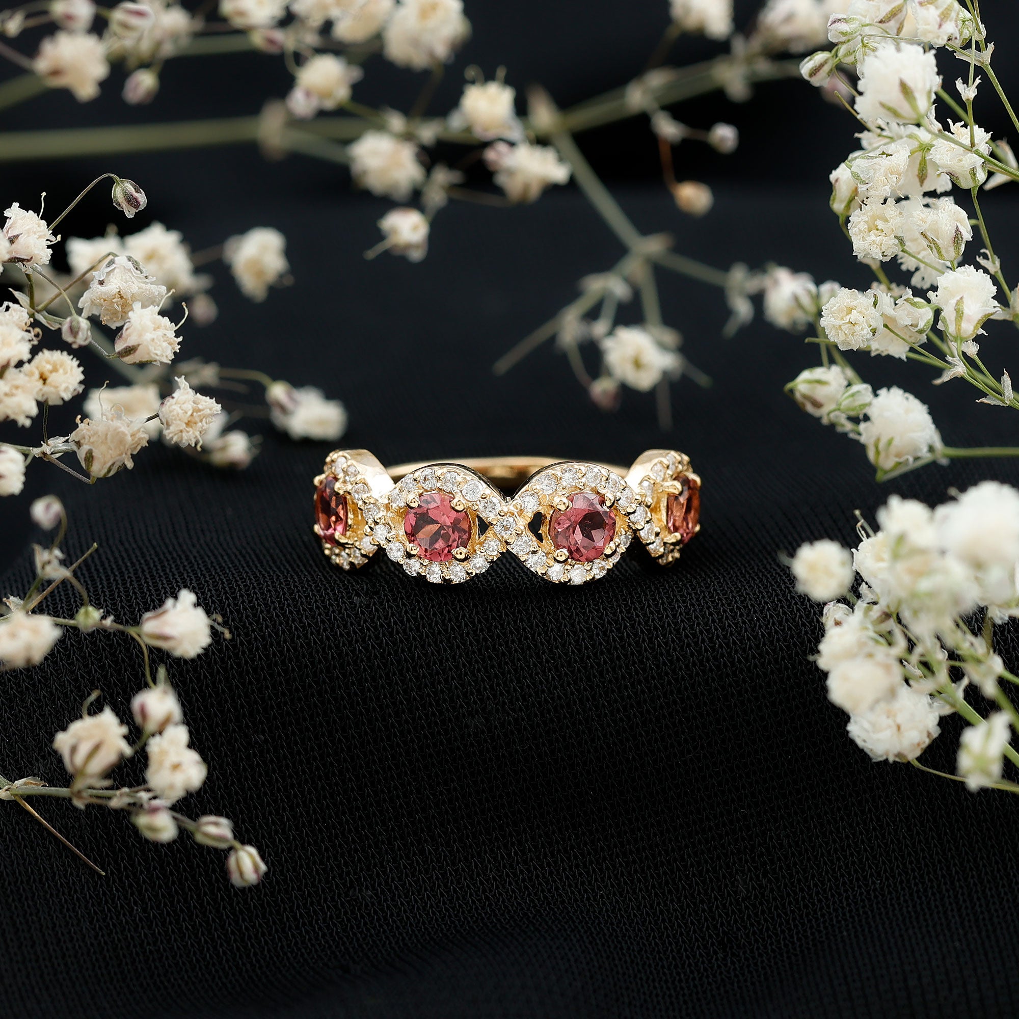 Similar to the eternity, a Pink Tourmaline Wedding Ring is adorned with identical-looking stones of Pink Tourmaline in an endless pattern. But the distinctive part is that thanks to the many styles it comes in, you’re facilitated with a world of options. It ranges from a Simple Pink Tourmaline Band Ring to ones decorated with Floating Halo, Vintage Detailings, or even a triple-row Pink Tourmaline Gold Ring.