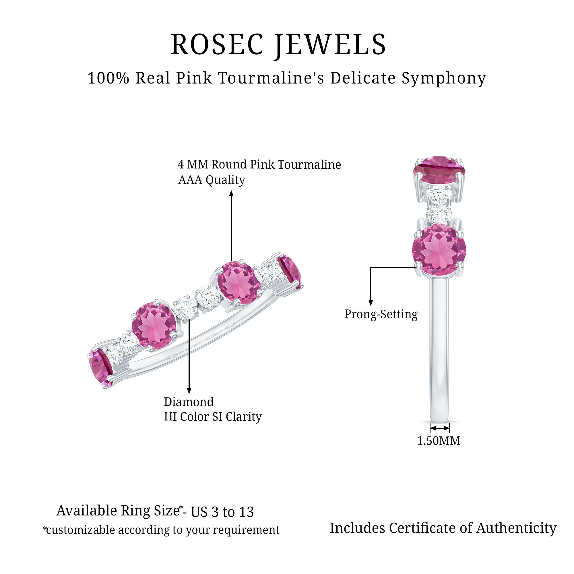 - Color: Pink tourmaline ranges from pale light pink to bright hot pink to curate amazing pink tourmaline wedding rings.