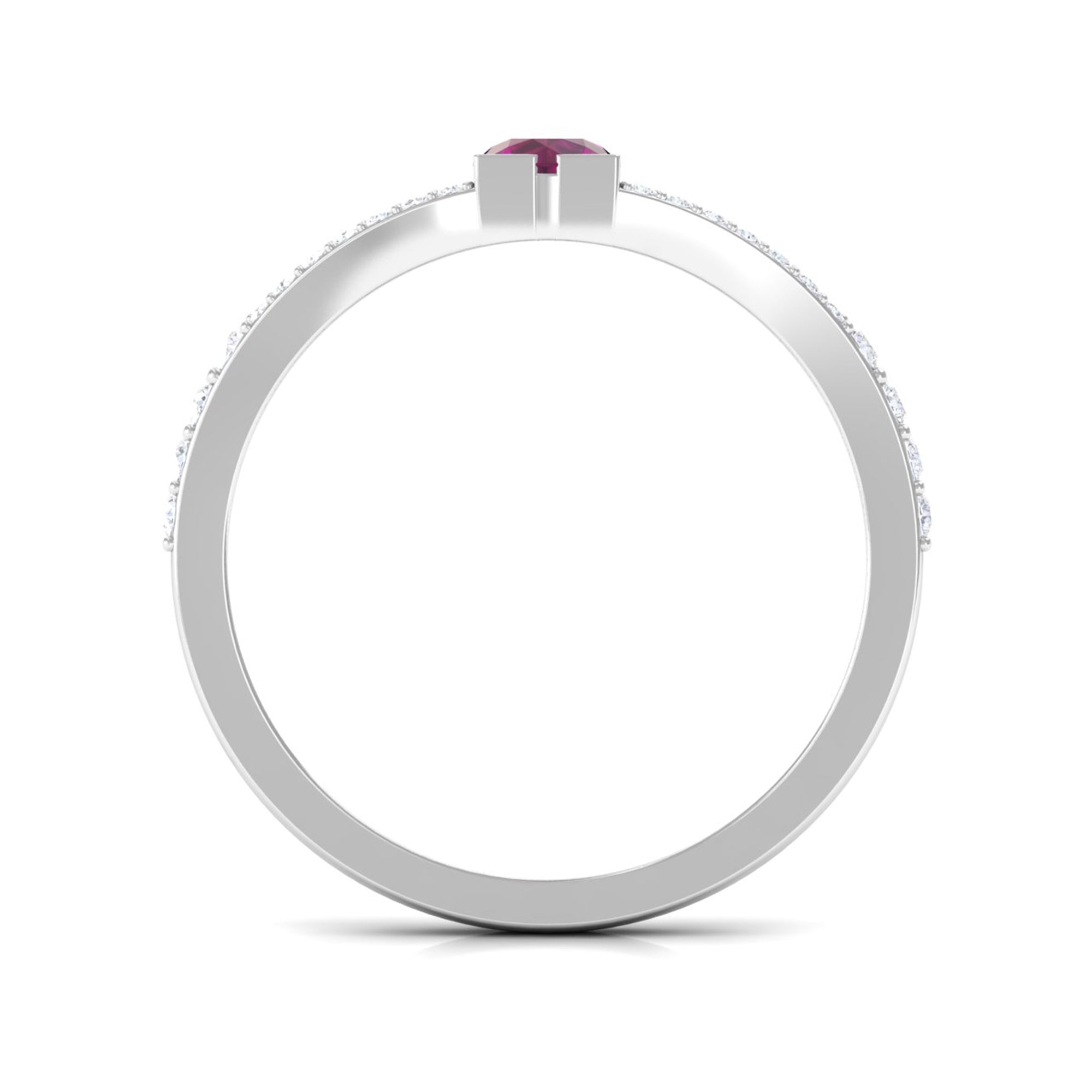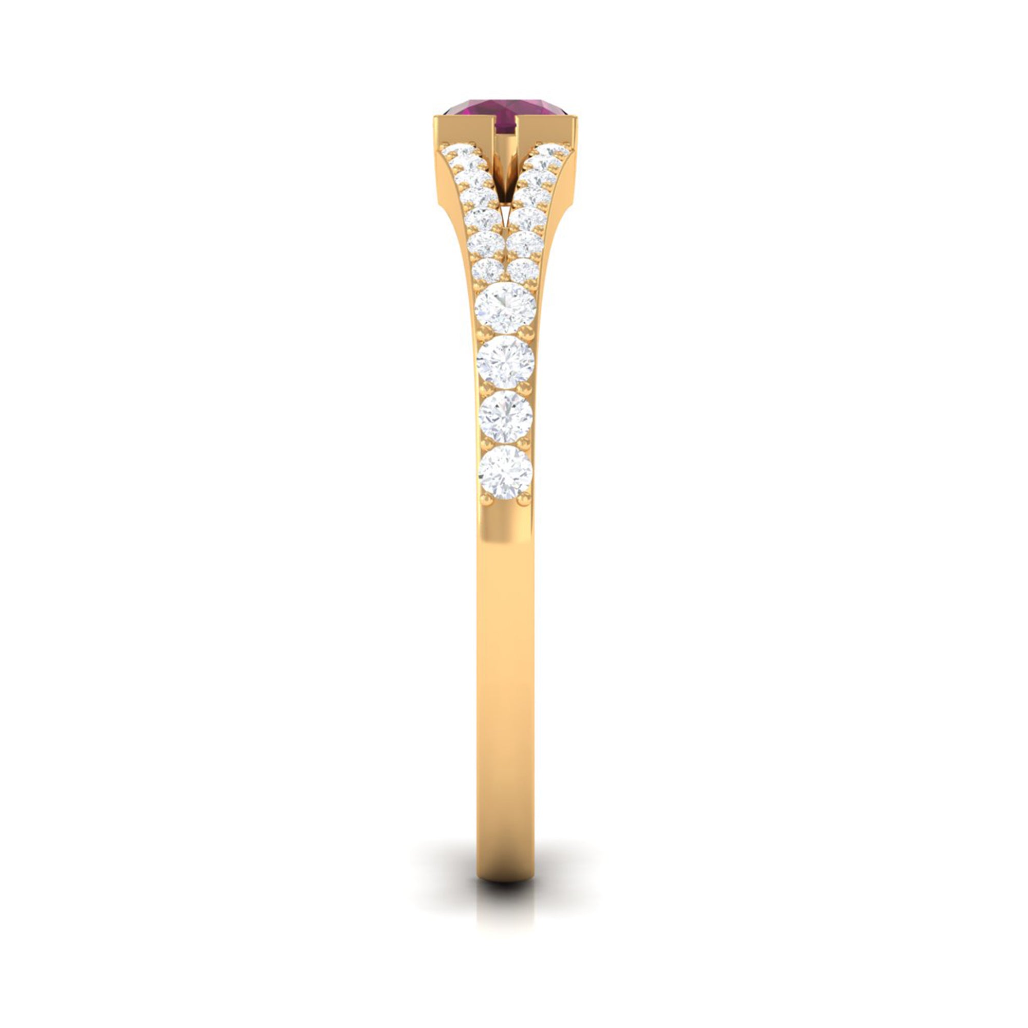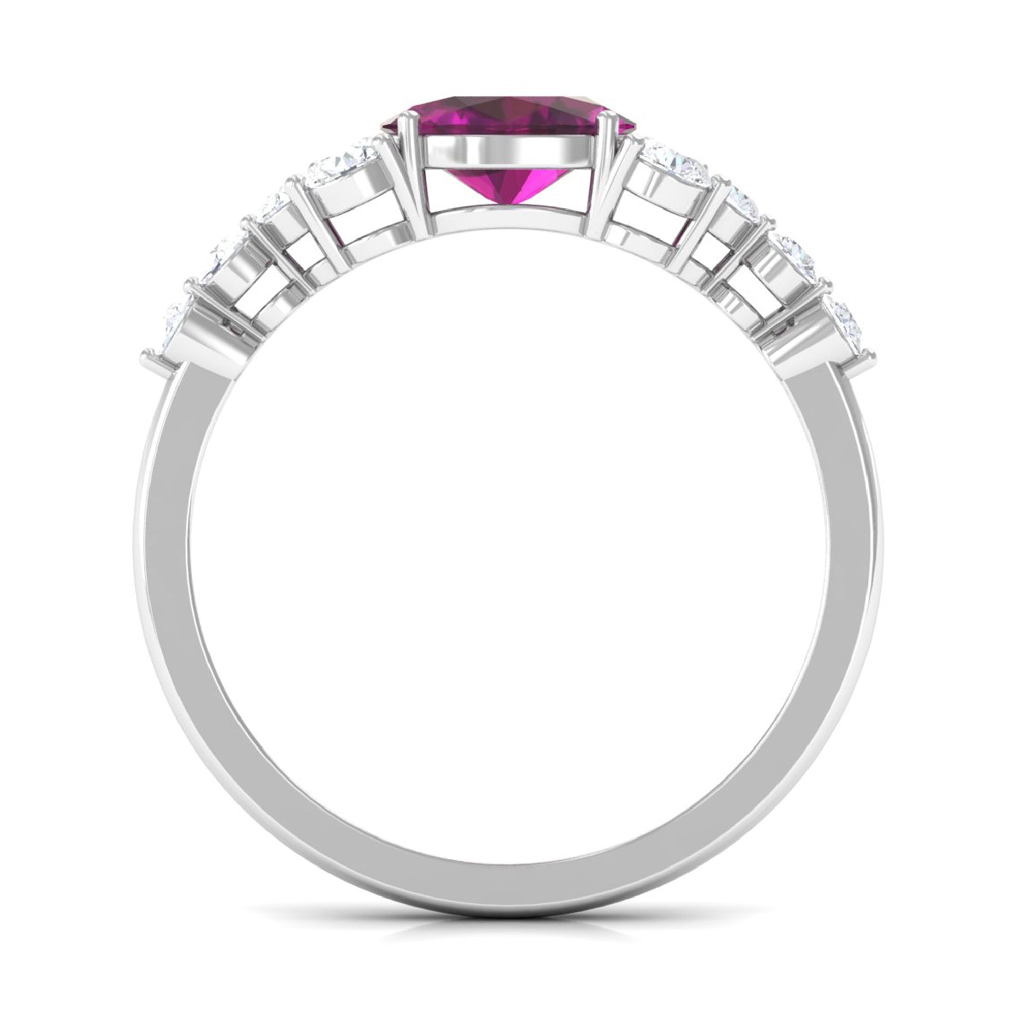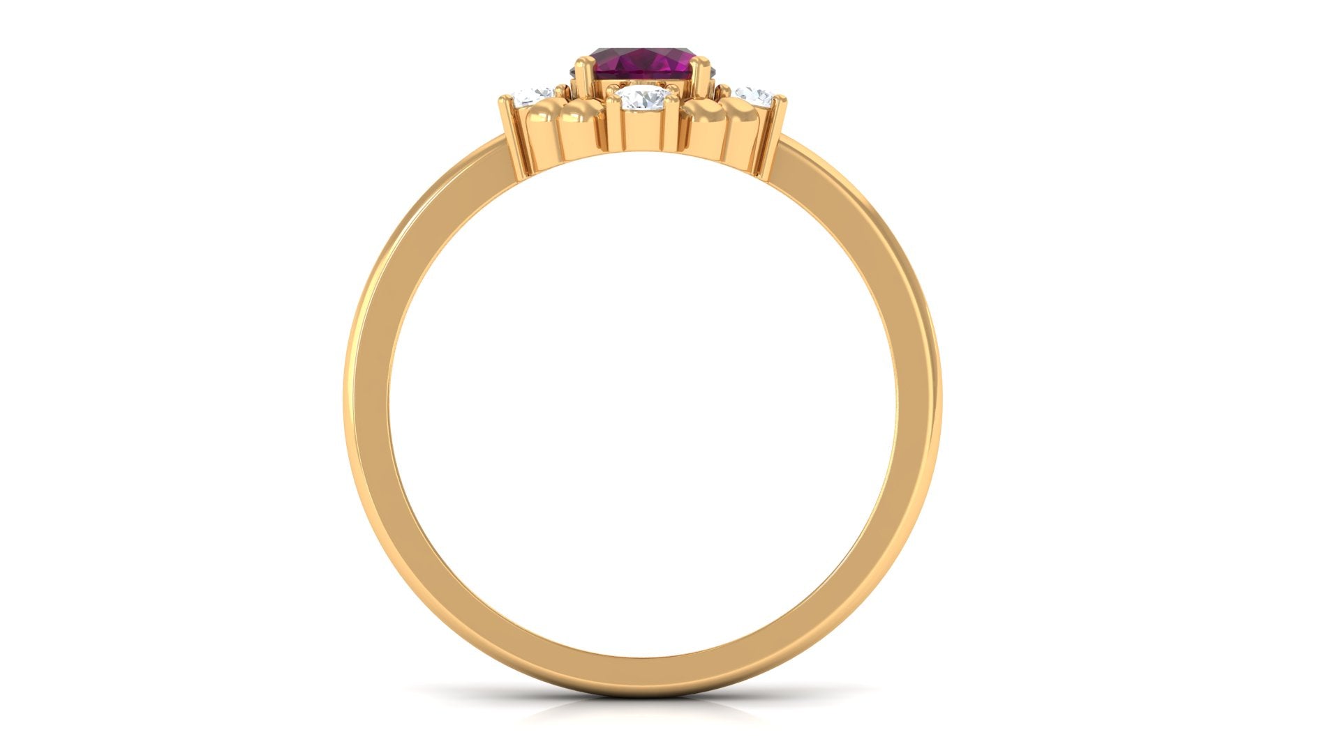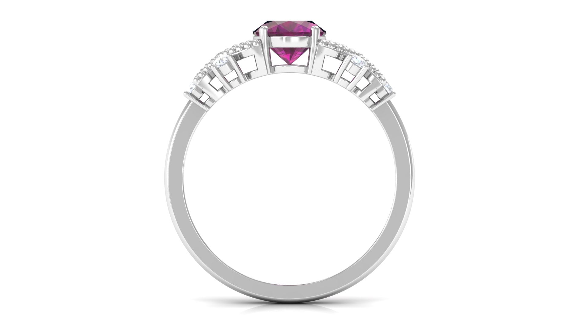Adorned with the Single Stone of Rhodolite that takes all the center stage, a Rhodolite Solitaire Ring is the go-to choice of ring style. The Rhodolite Solitaire here is at least 6 MM in size. Despite its understated style, this ring style pleases many senses of style, which makes it a highly versatile Rhodolite Engagement Ring. For a classic aesthetic, a Round Cut Rhodolite Ring works best. While for a fancier aesthetic, nothing better than a ring fashioned in princess, marquise, or pear-cut Rhodolite. If you fancy a vintage vibe, you won’t find a better pick than a Rhodolite Ring adorned with Asscher, Emerald, or Cushion Cut.