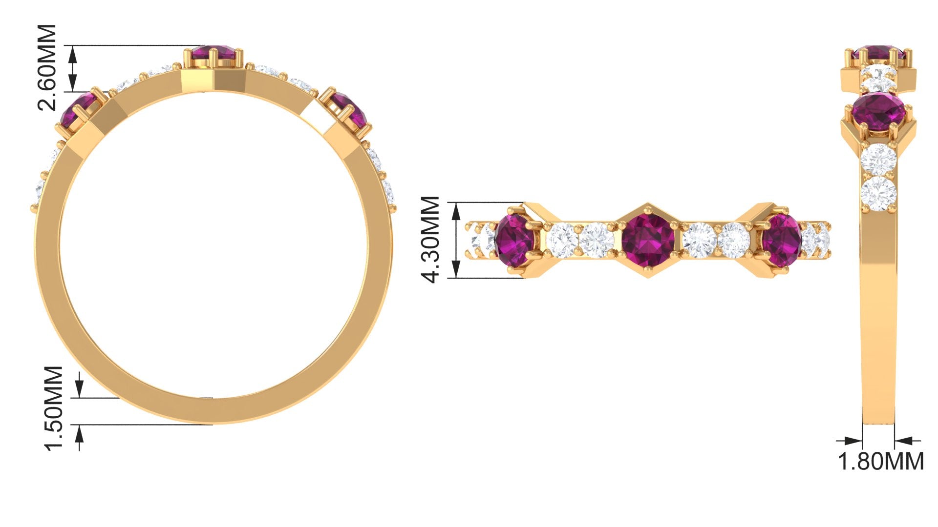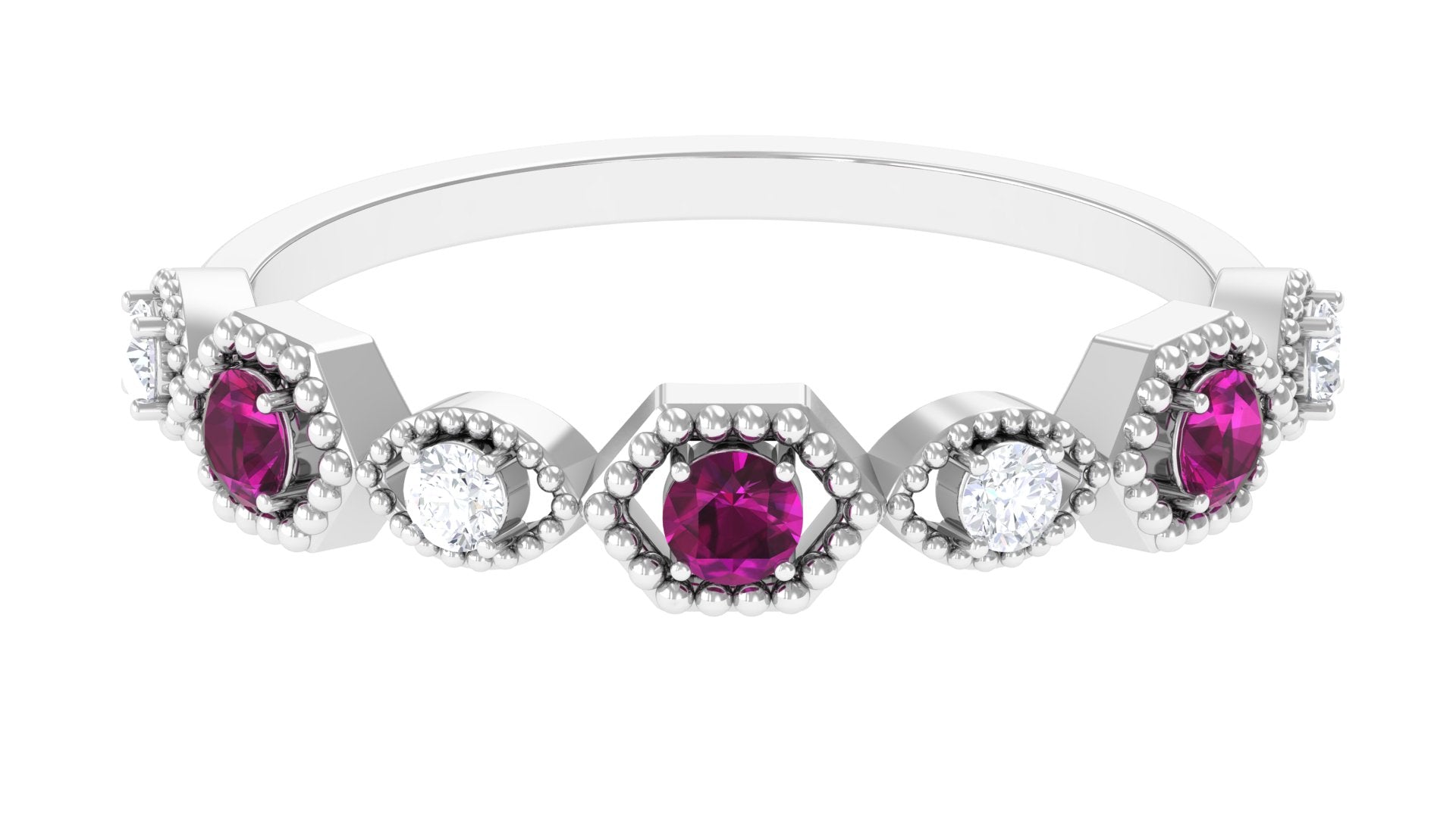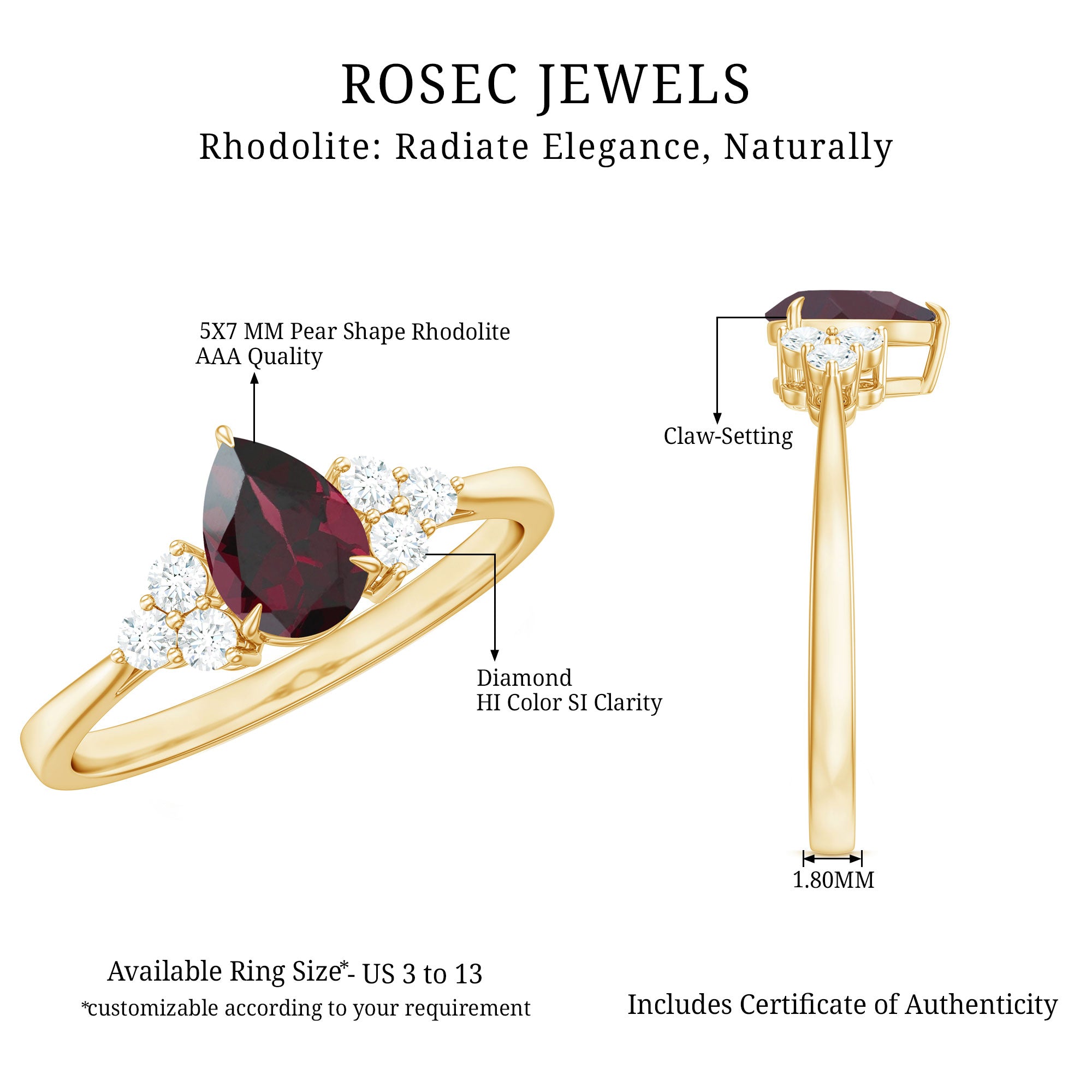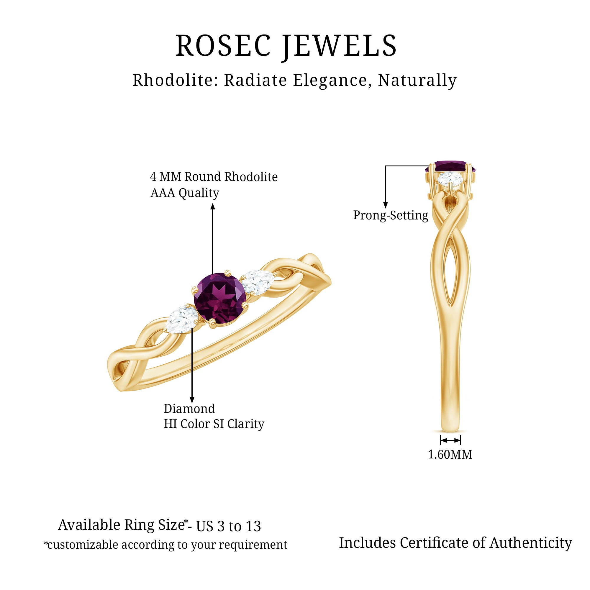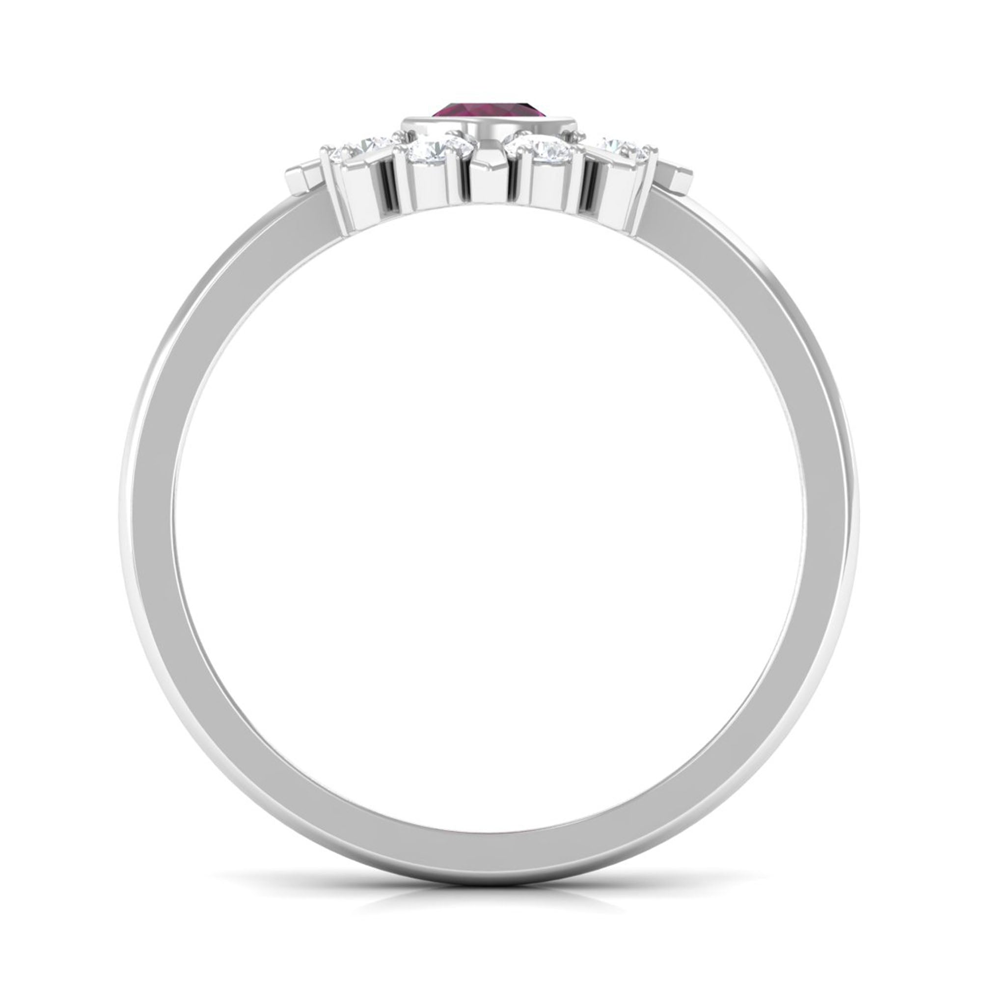 Adorned with the Single Stone of Rhodolite that takes all the center stage, a Rhodolite Solitaire Ring is the go-to choice of ring style. The Rhodolite Solitaire here is at least 6 MM in size. Despite its understated style, this ring style pleases many senses of style, which makes it a highly versatile Rhodolite Engagement Ring. For a classic aesthetic, a Round Cut Rhodolite Ring works best. While for a fancier aesthetic, nothing better than a ring fashioned in princess, marquise, or pear-cut Rhodolite. If you fancy a vintage vibe, you won’t find a better pick than a Rhodolite Ring adorned with Asscher, Emerald, or Cushion Cut.