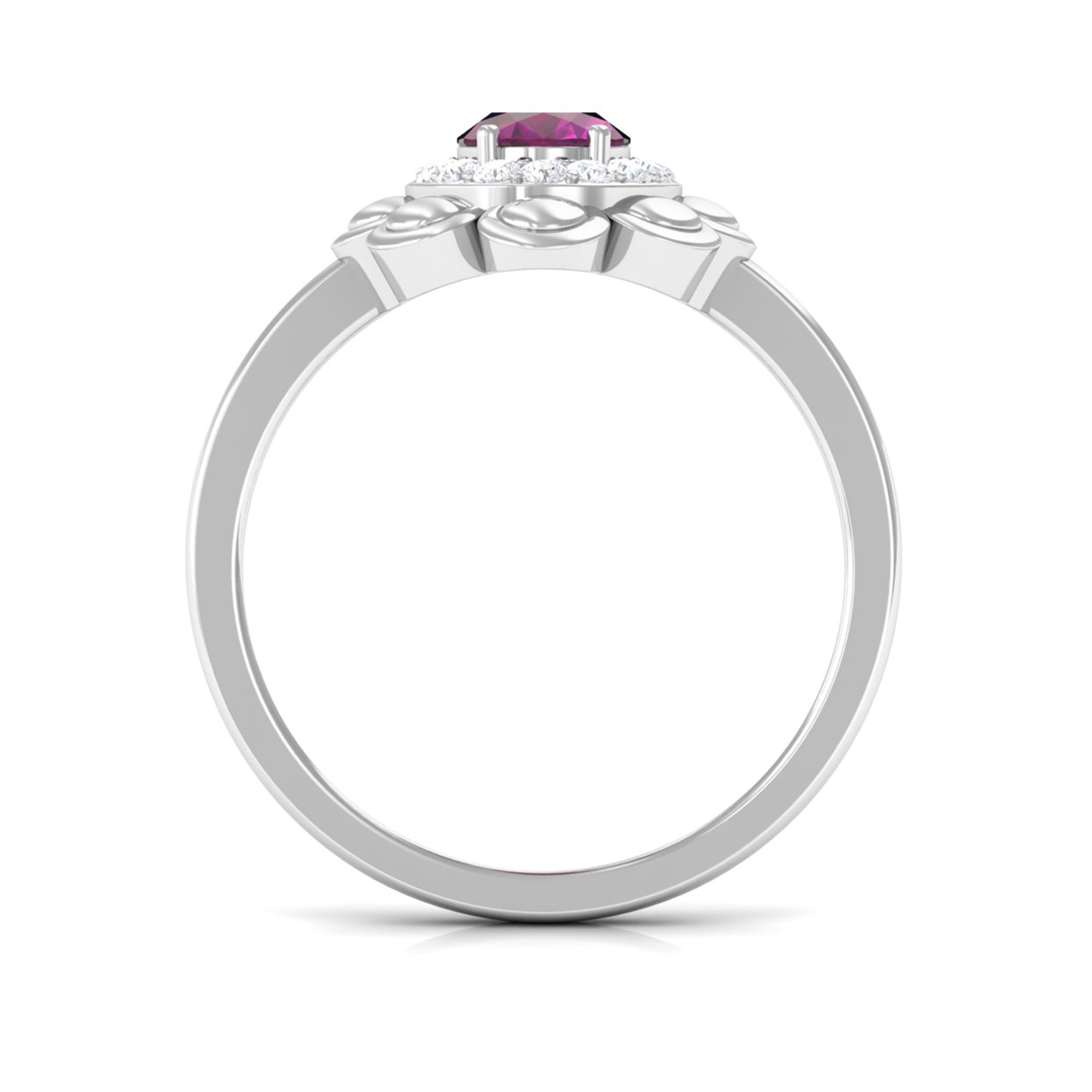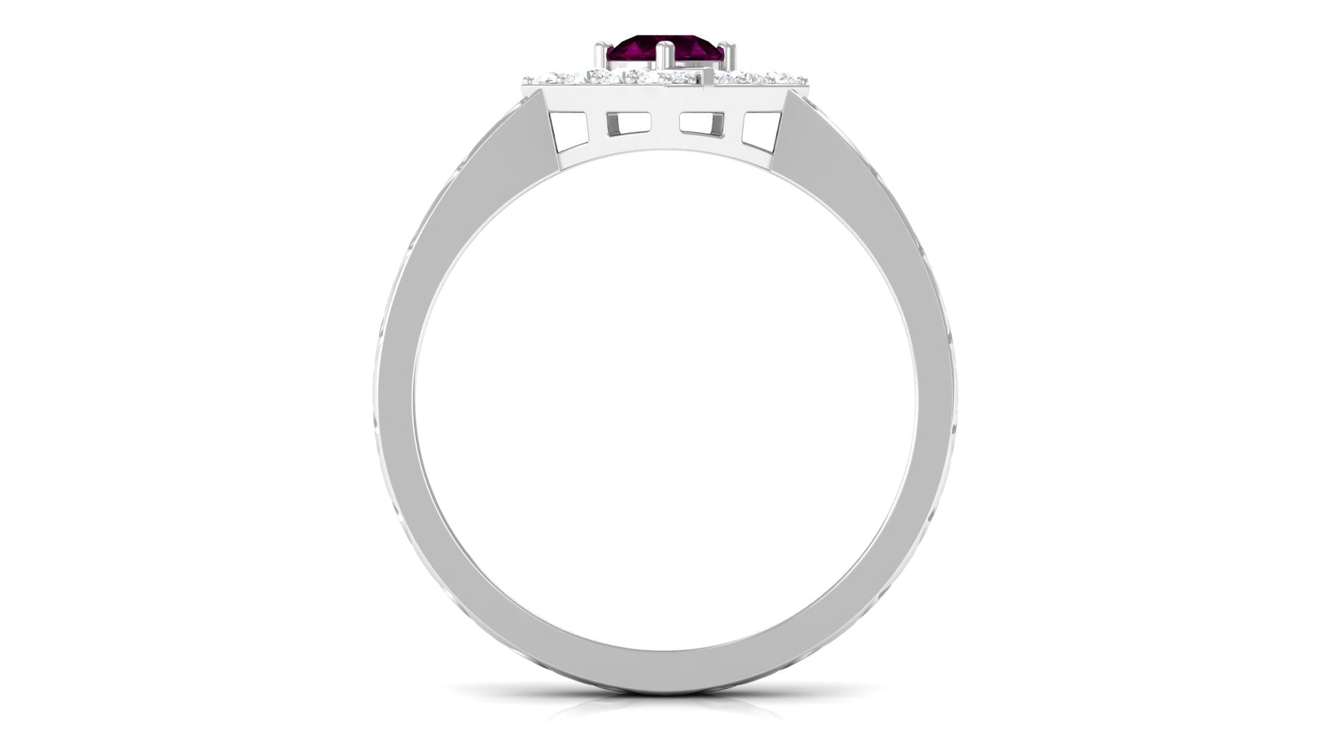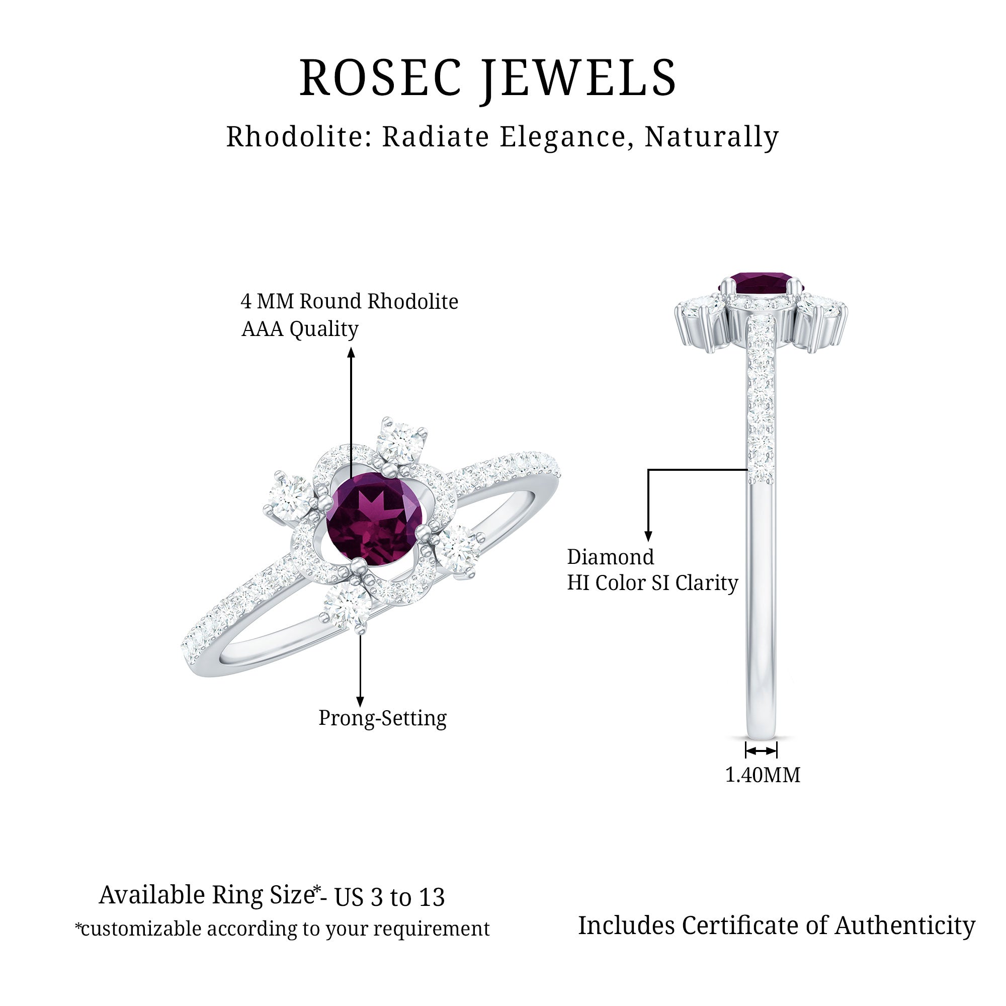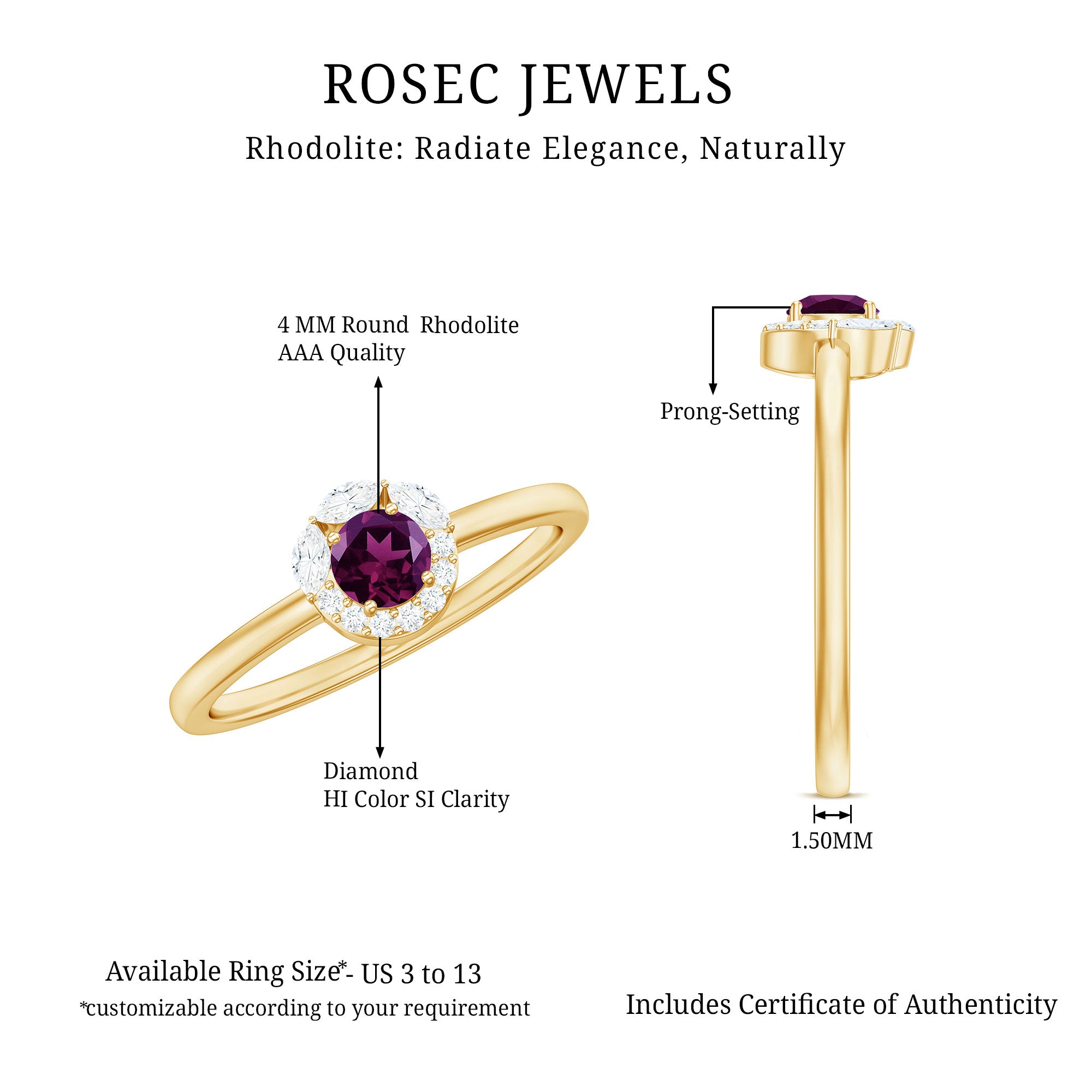 When the center stone of Rhodolite is adorned with a sparkling parade of Diamond/Moissanite all around, it is referred to as a Rhodolite Halo Ring. The Halo lends an interesting aesthetic appeal to the otherwise classic Rhodolite Solitaire Ring. Not to forget- it also makes the Rhodolite appear larger than its actual size.