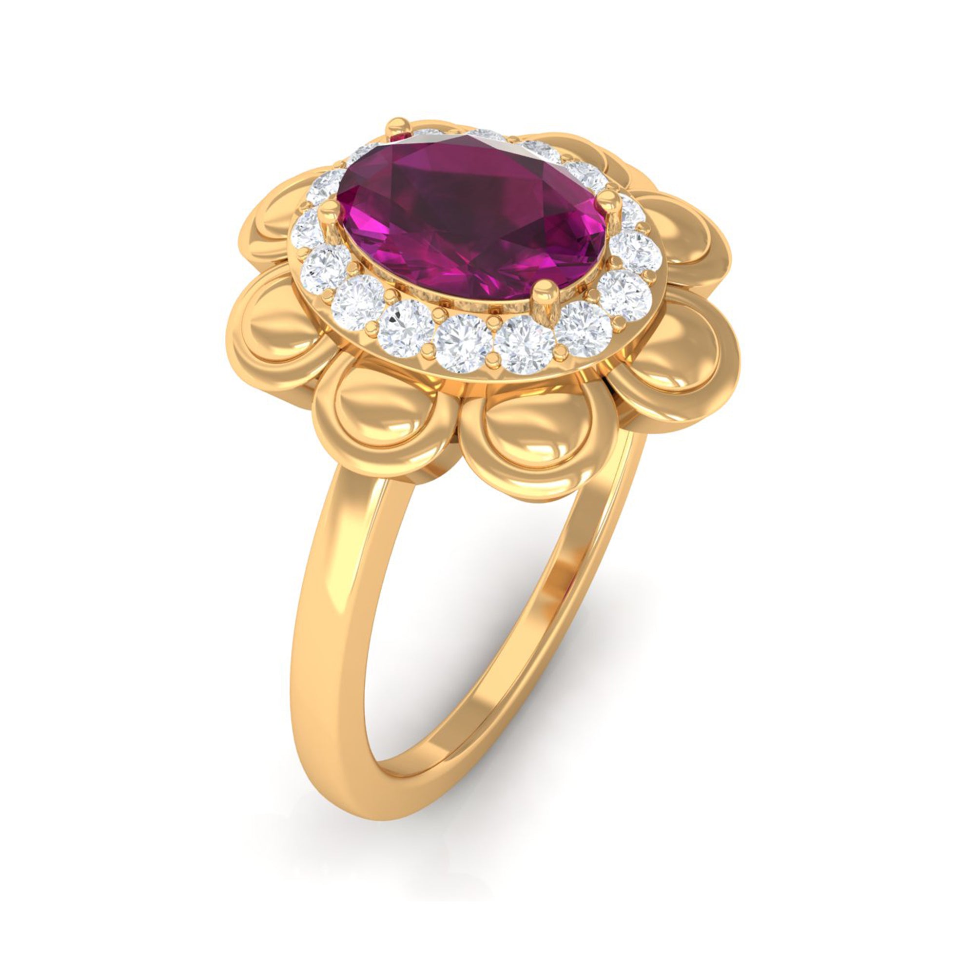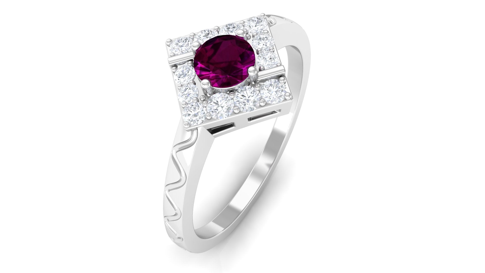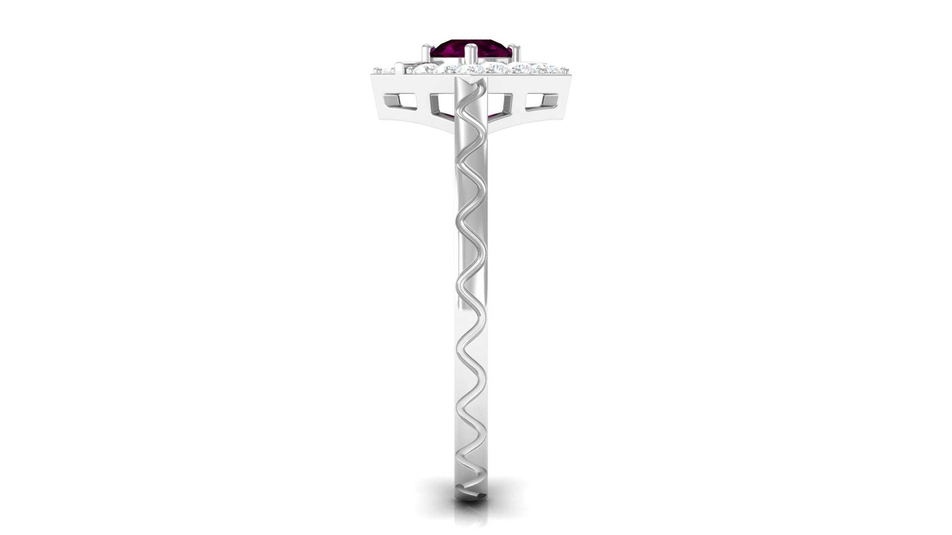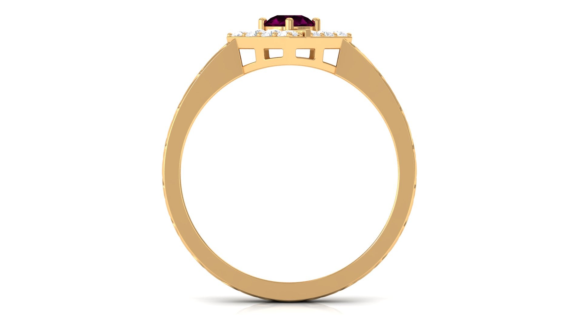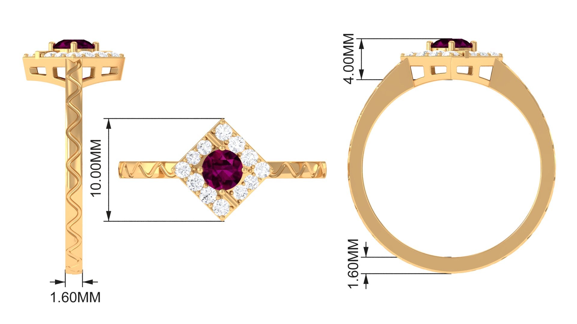 When the center stone of Rhodolite is adorned with a sparkling parade of Diamond/Moissanite all around, it is referred to as a Rhodolite Halo Ring. The Halo lends an interesting aesthetic appeal to the otherwise classic Rhodolite Solitaire Ring. Not to forget- it also makes the Rhodolite appear larger than its actual size.