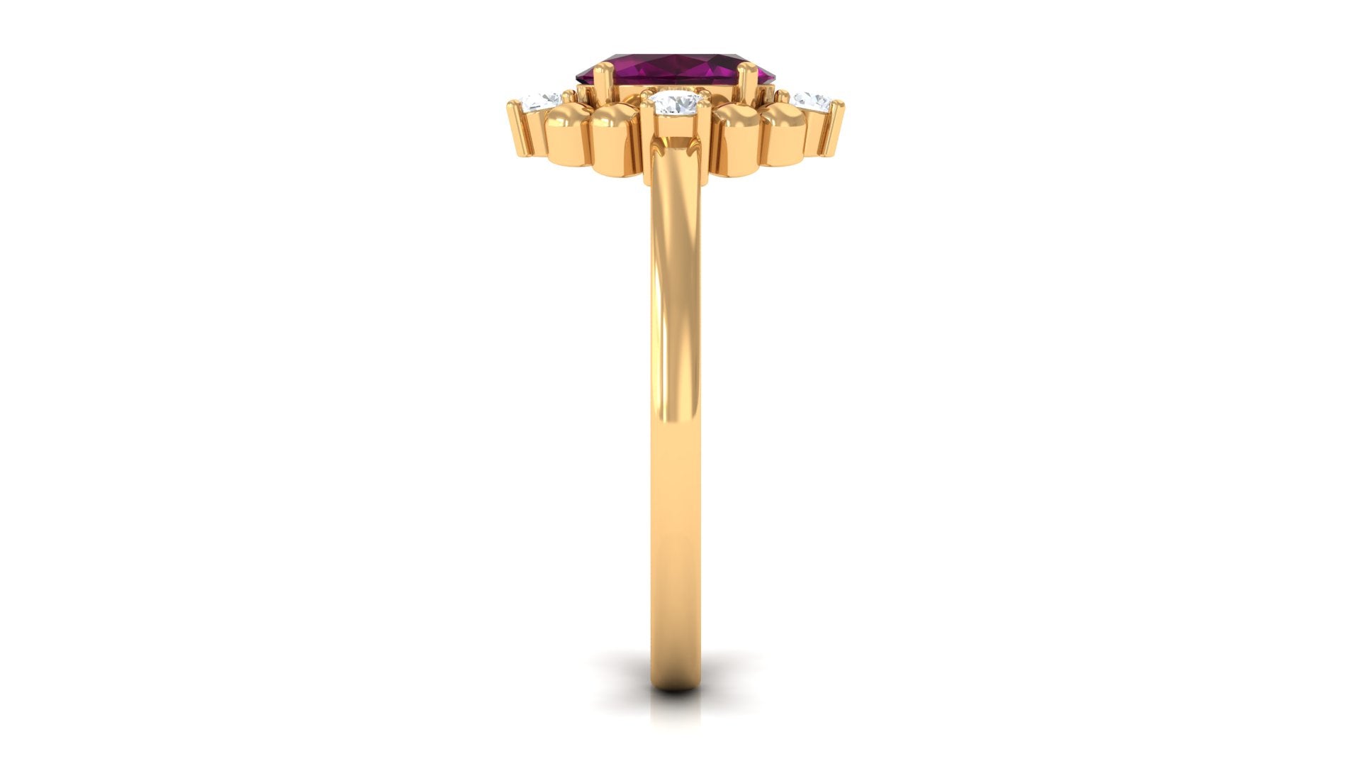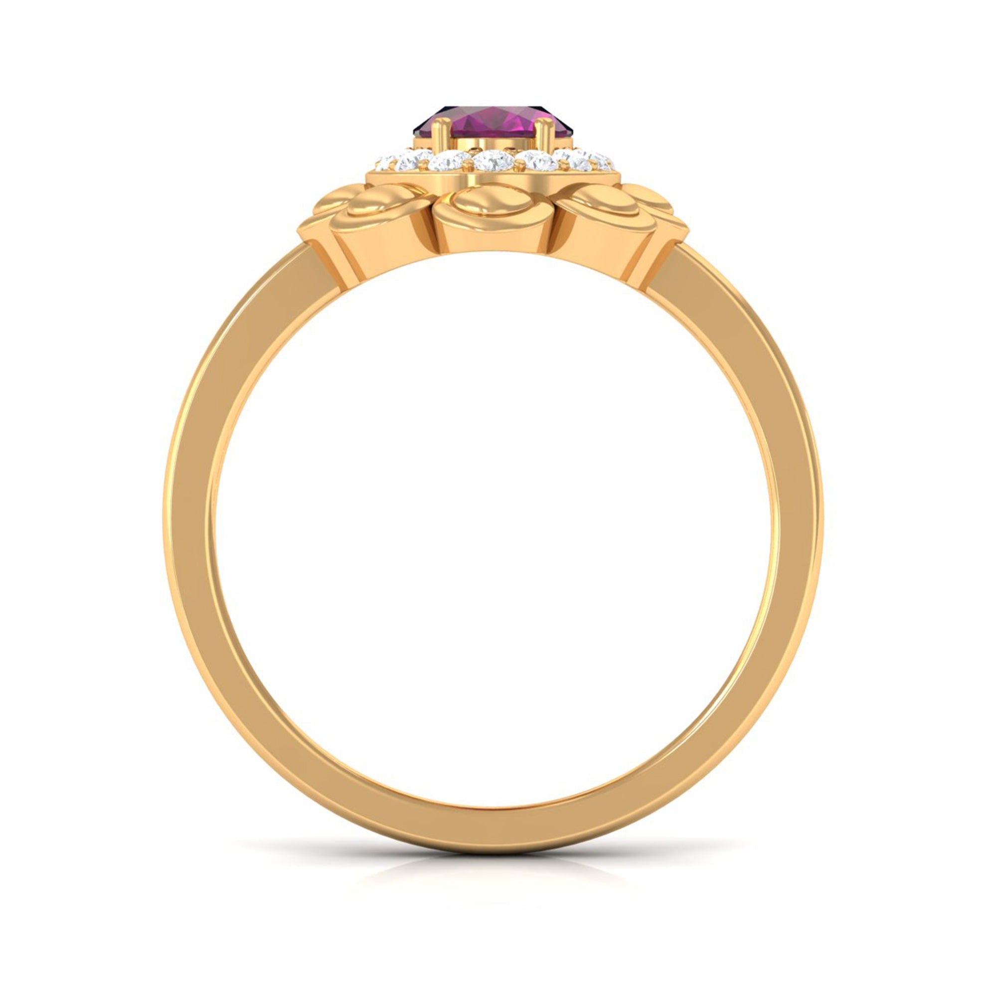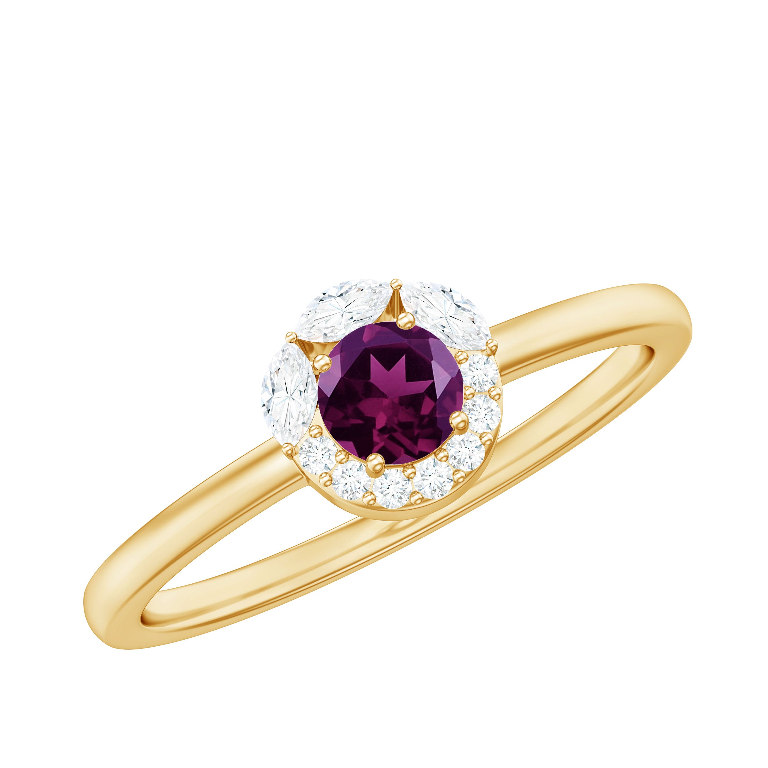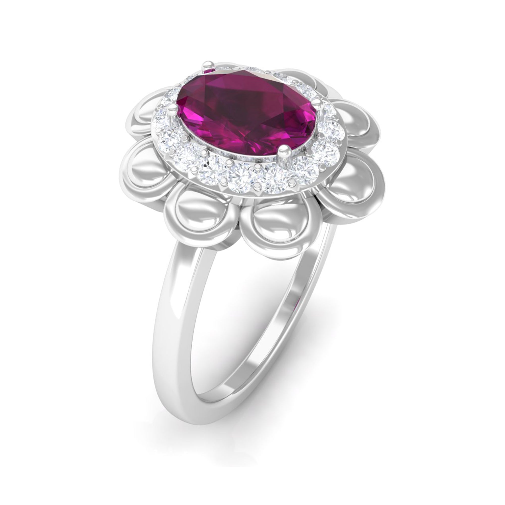 When the center stone of Rhodolite is adorned with a sparkling parade of Diamond/Moissanite all around, it is referred to as a Rhodolite Halo Ring. The Halo lends an interesting aesthetic appeal to the otherwise classic Rhodolite Solitaire Ring. Not to forget- it also makes the Rhodolite appear larger than its actual size.