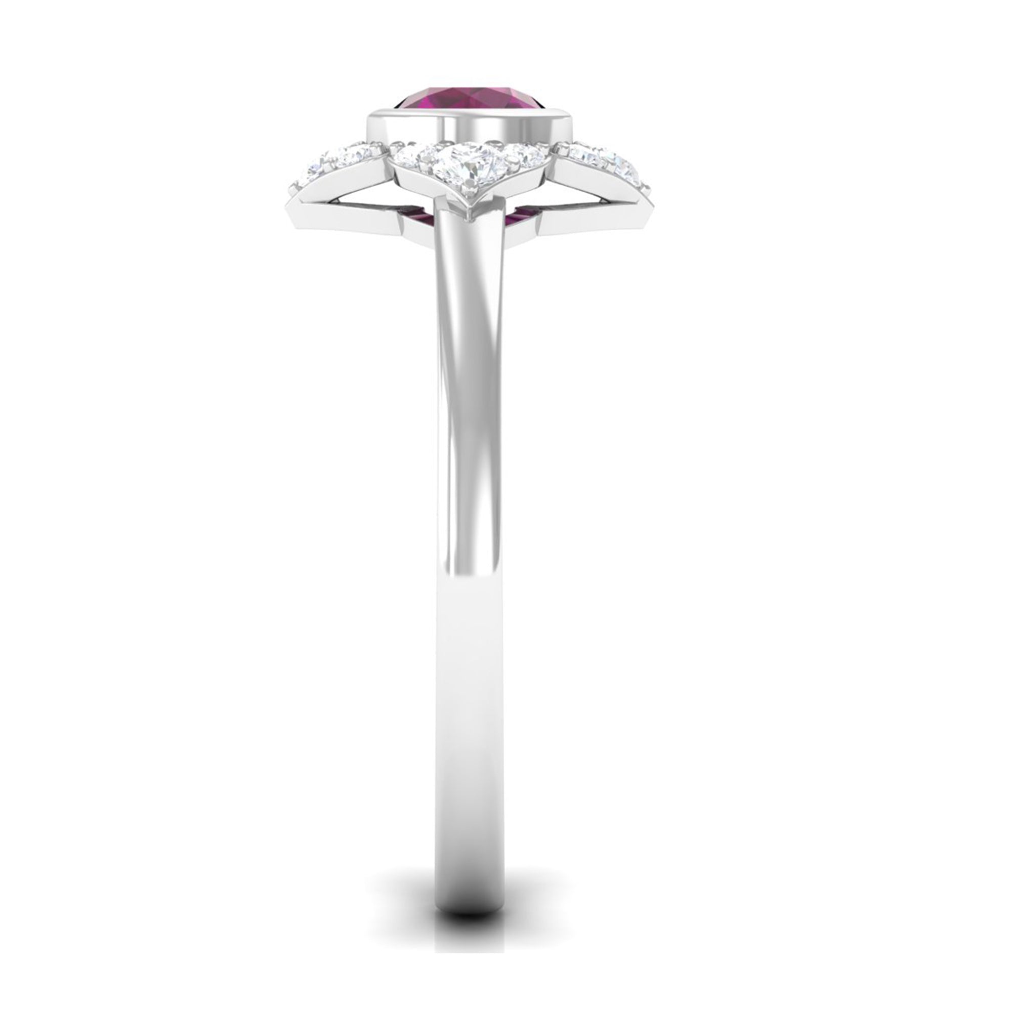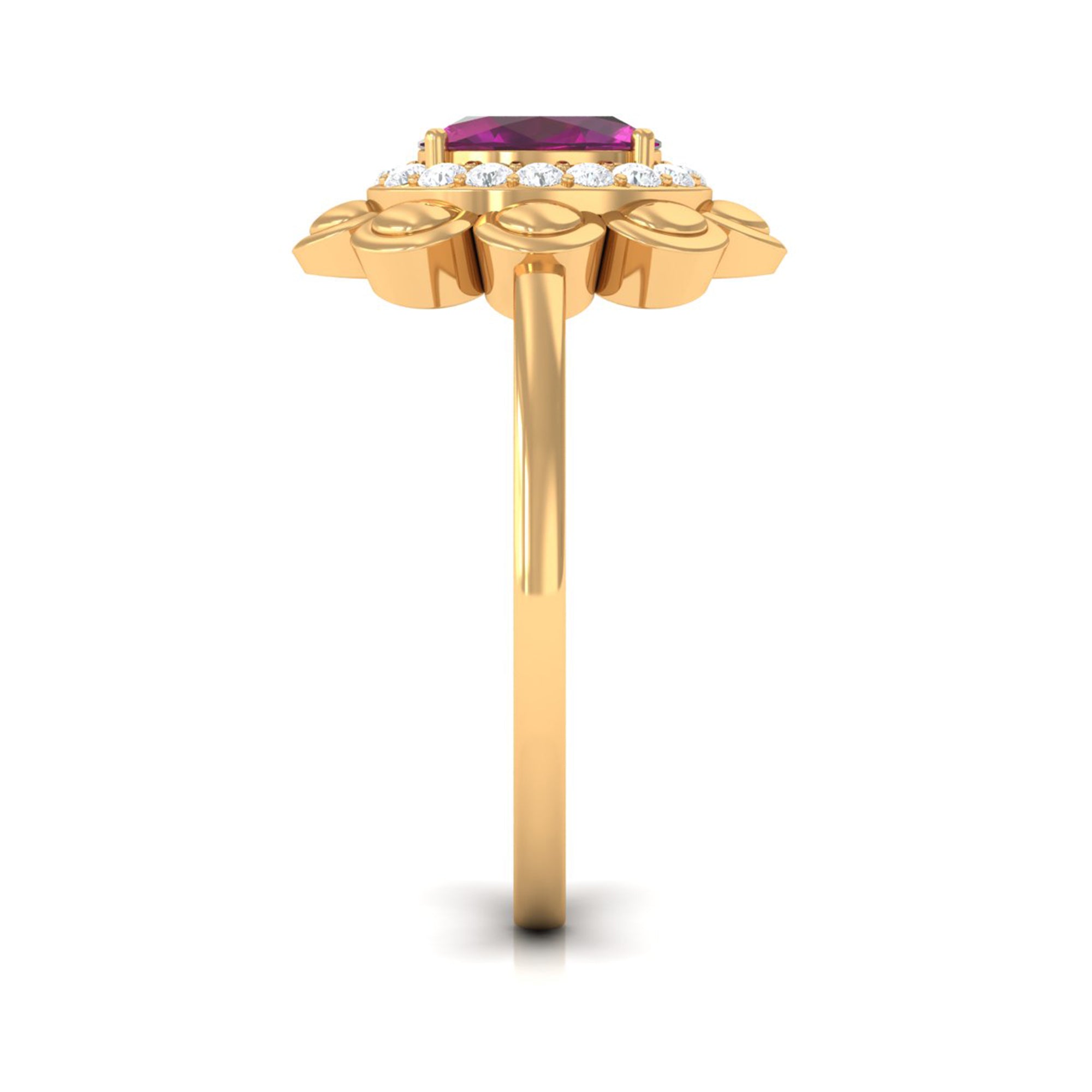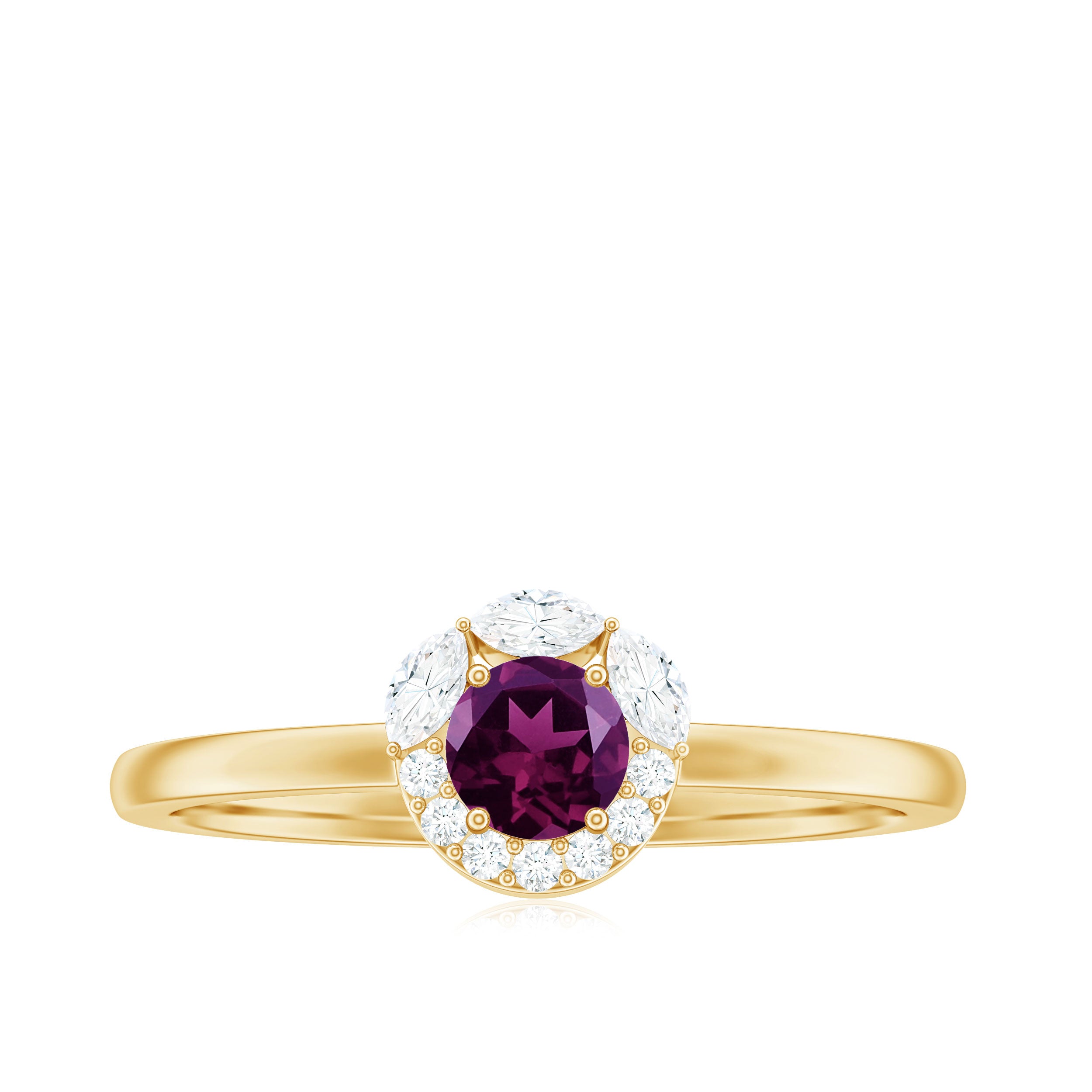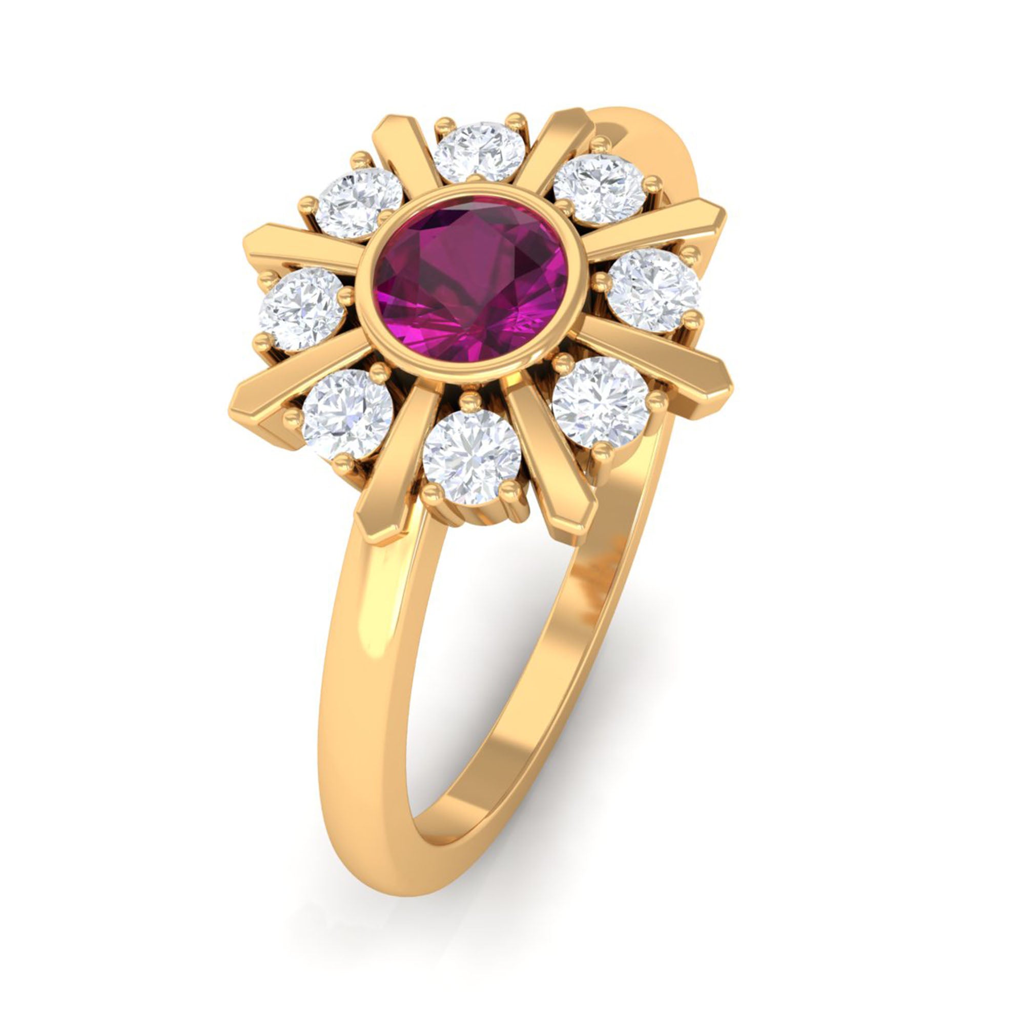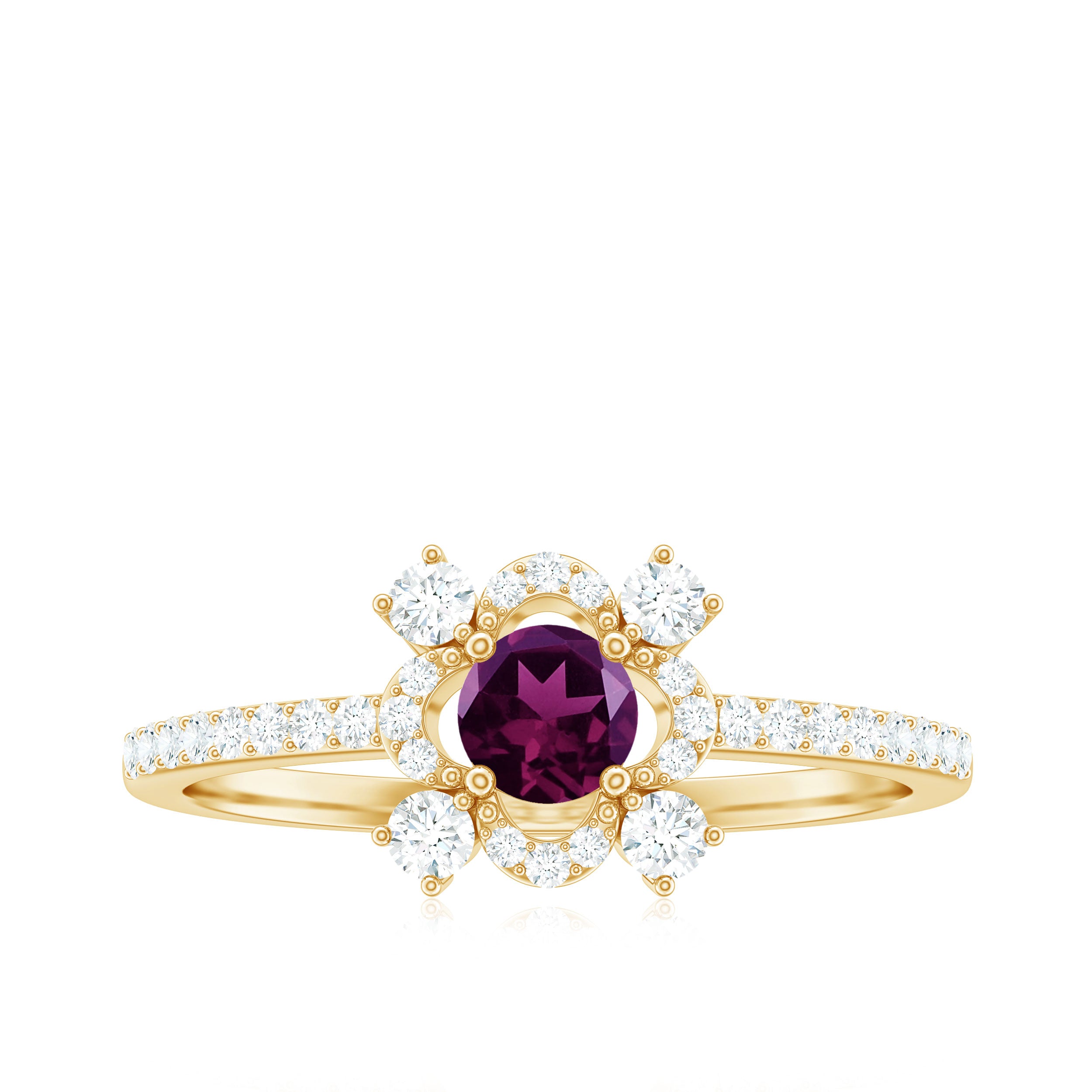When the center stone of Rhodolite is adorned with a sparkling parade of Diamond/Moissanite all around, it is referred to as a Rhodolite Halo Ring. The Halo lends an interesting aesthetic appeal to the otherwise classic Rhodolite Solitaire Ring. Not to forget- it also makes the Rhodolite appear larger than its actual size.