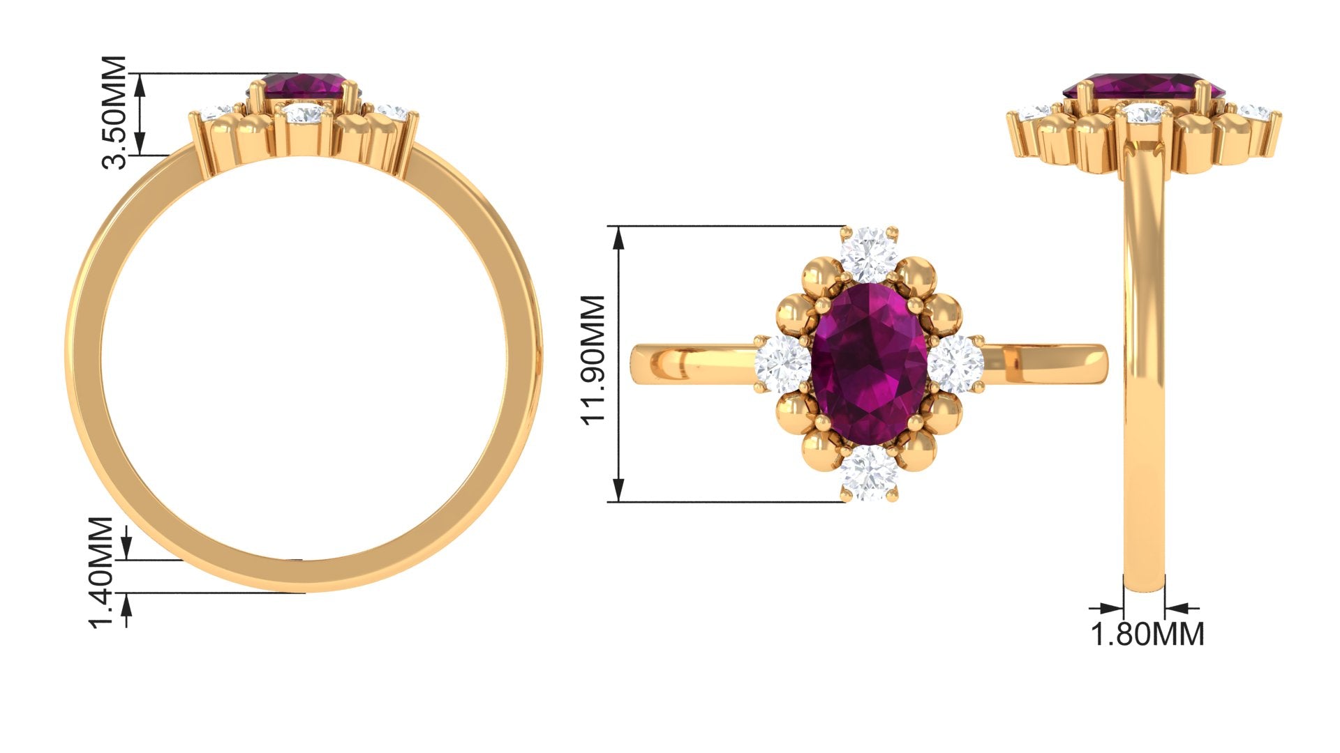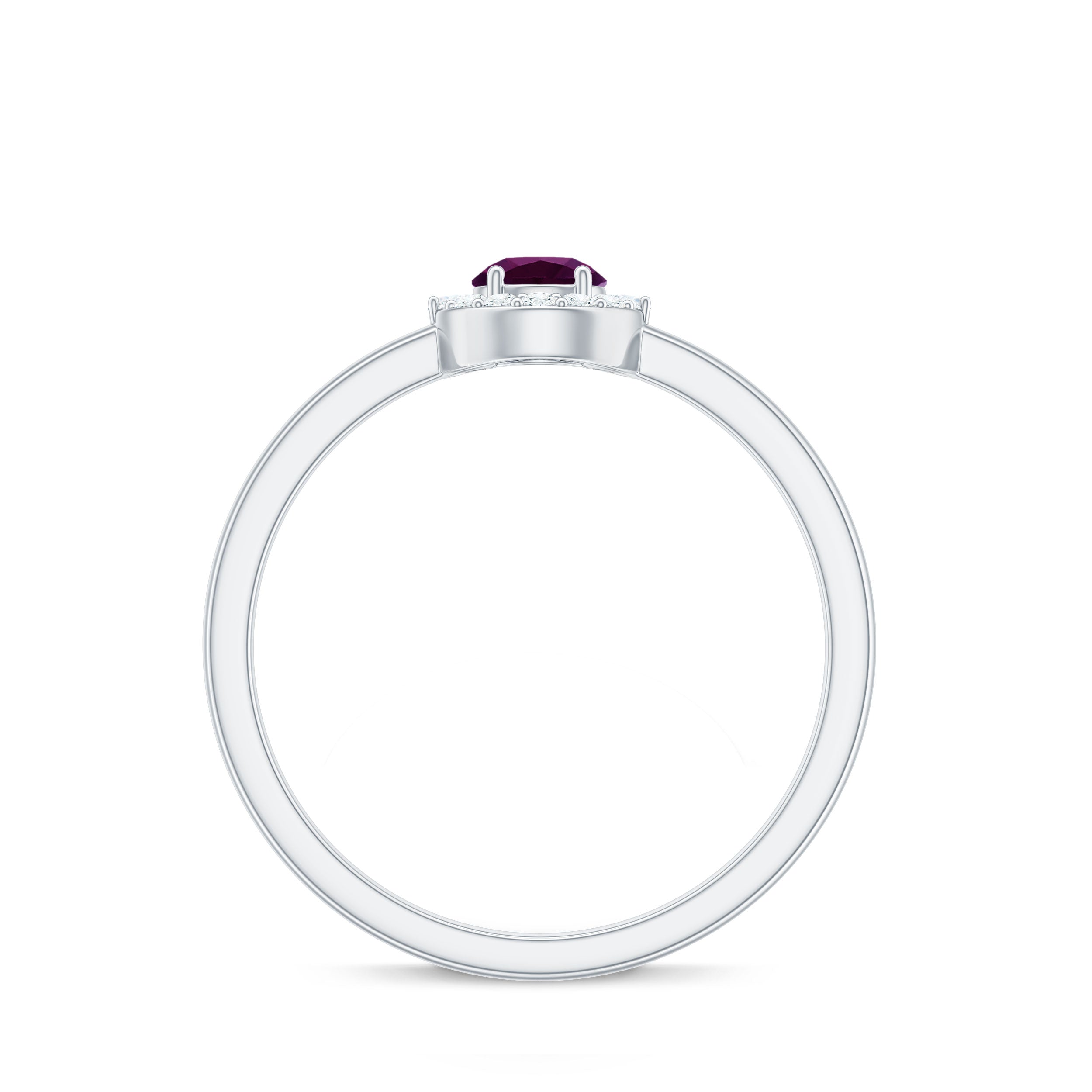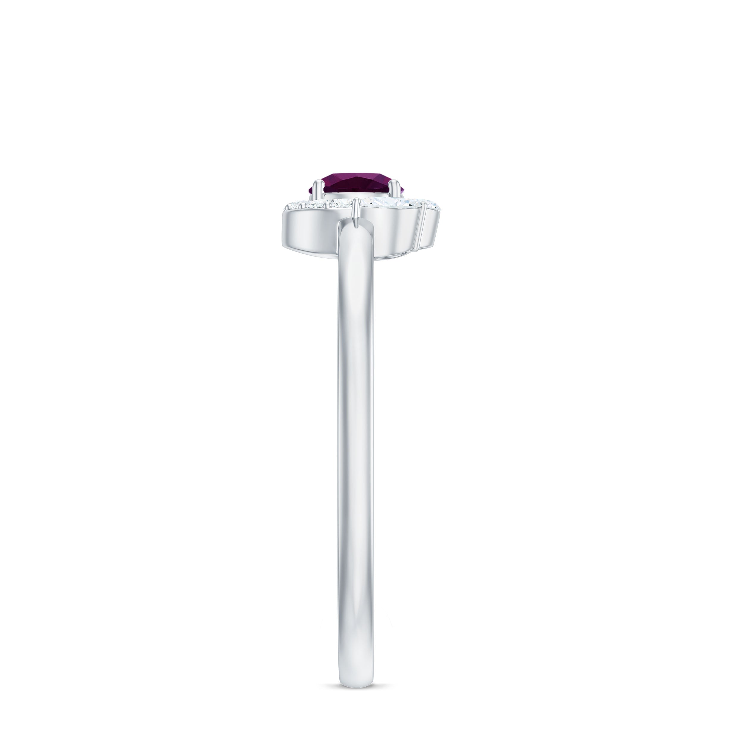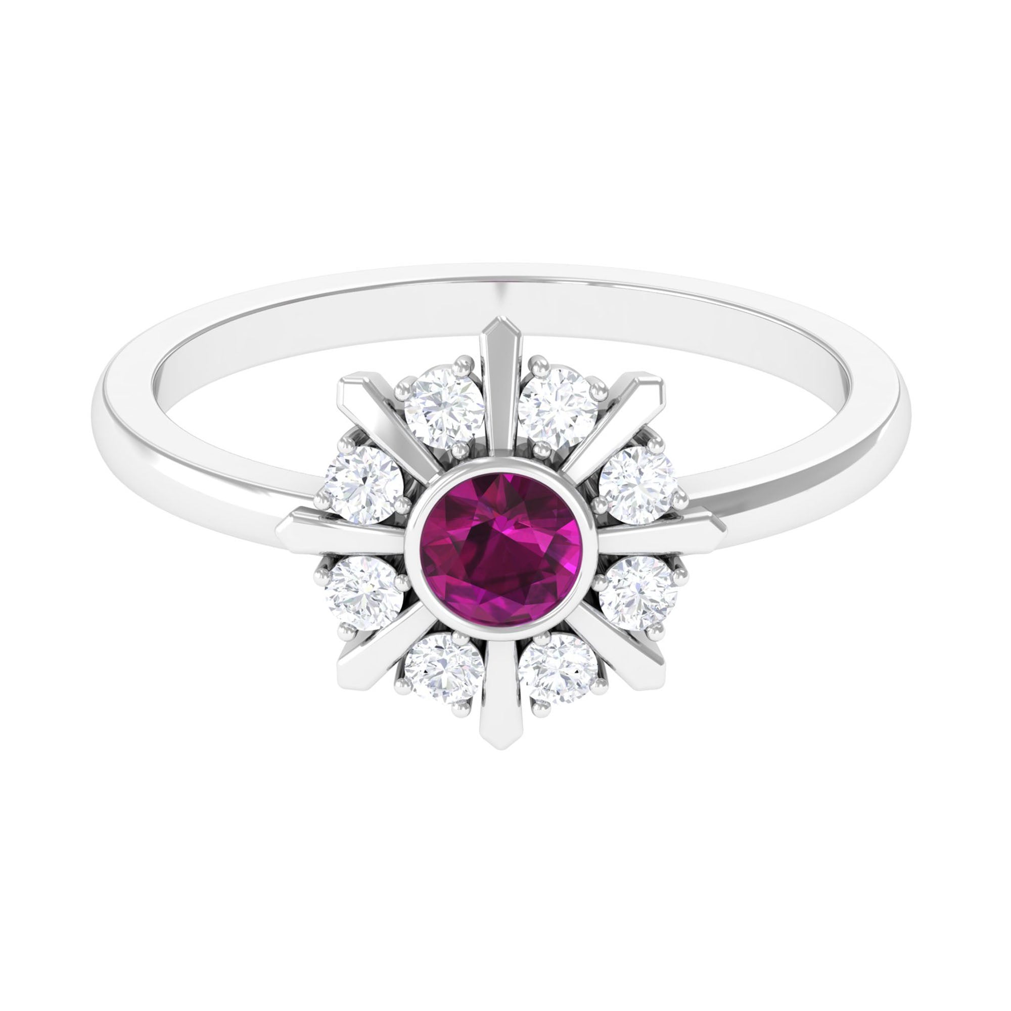 When the center stone of Rhodolite is adorned with a sparkling parade of Diamond/Moissanite all around, it is referred to as a Rhodolite Halo Ring. The Halo lends an interesting aesthetic appeal to the otherwise classic Rhodolite Solitaire Ring. Not to forget- it also makes the Rhodolite appear larger than its actual size.