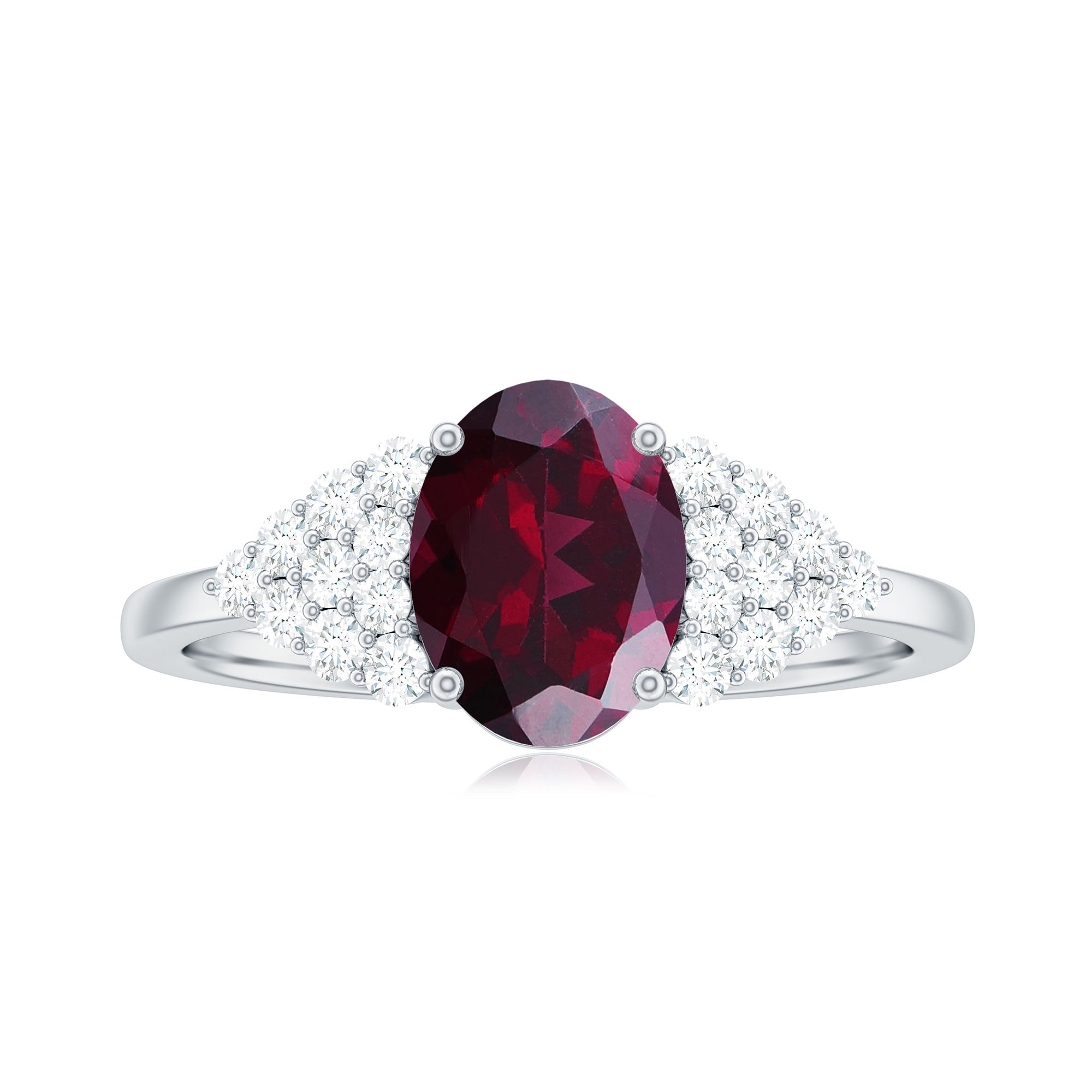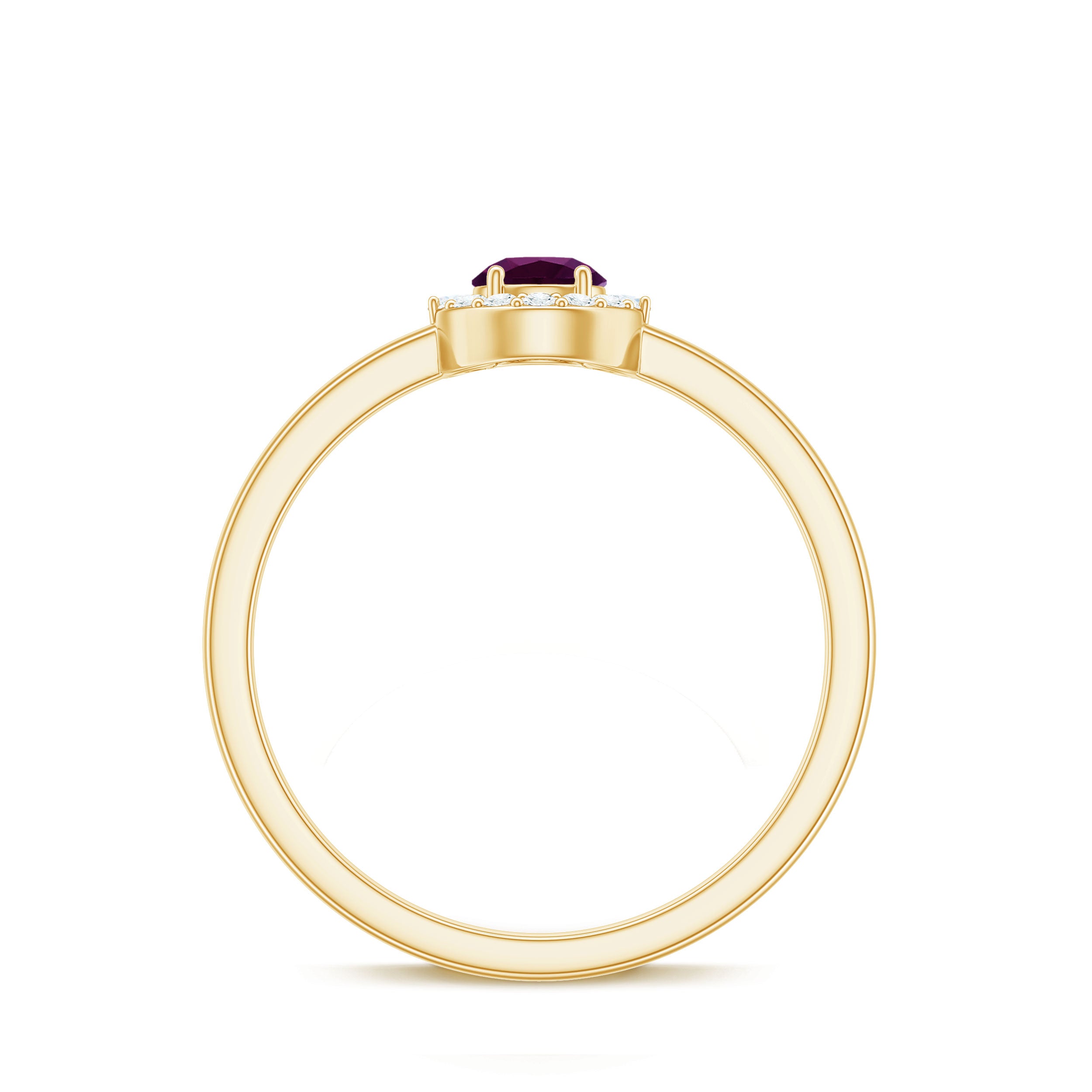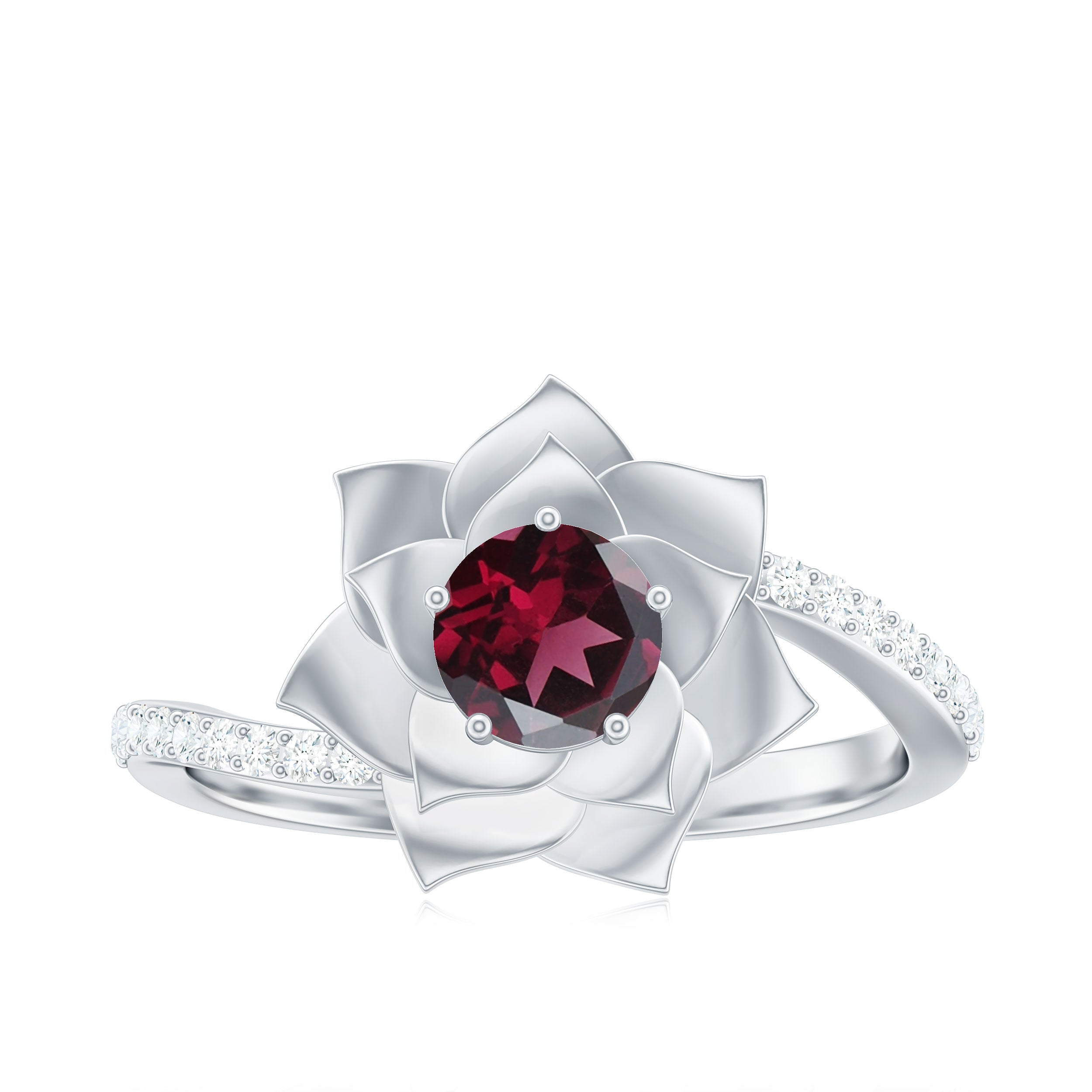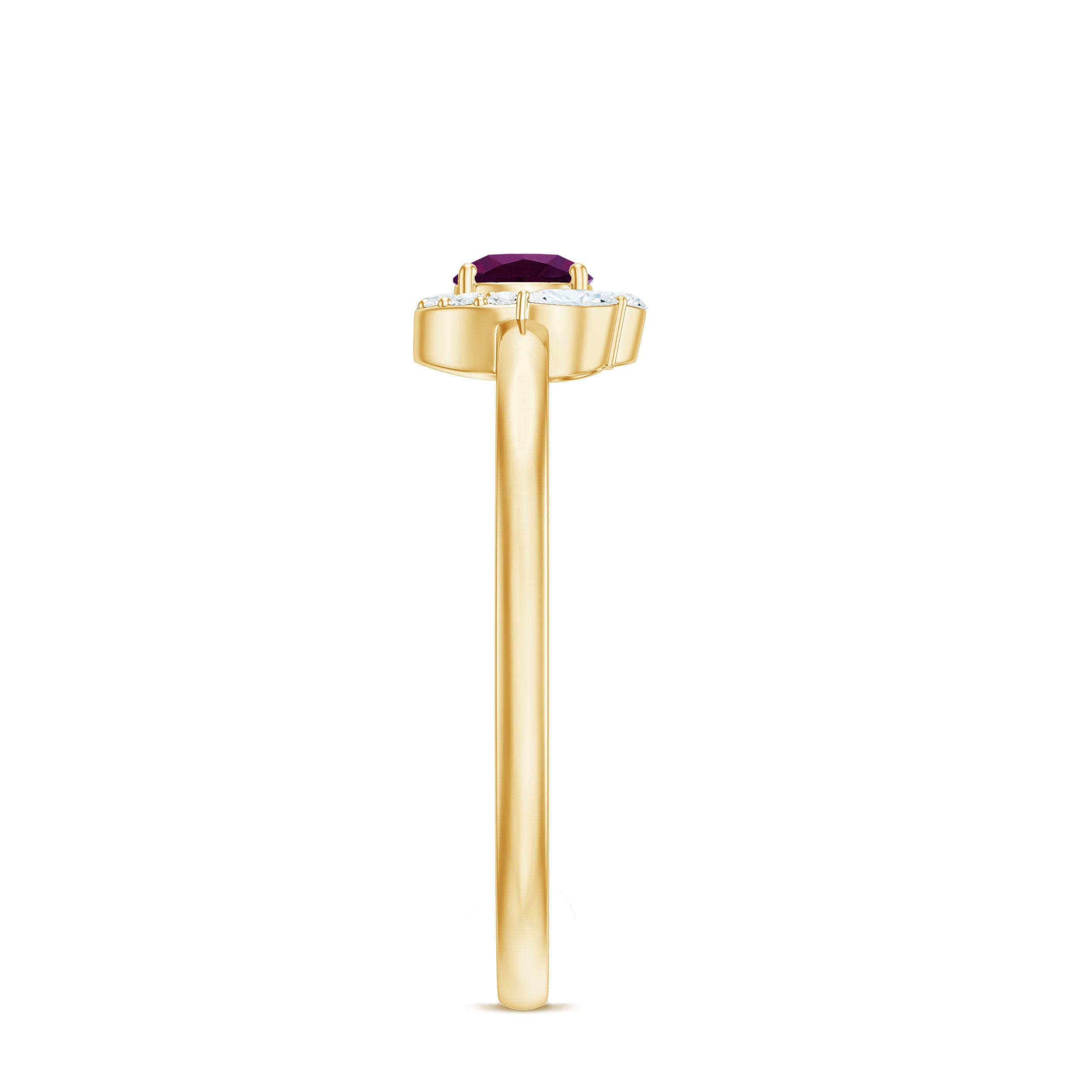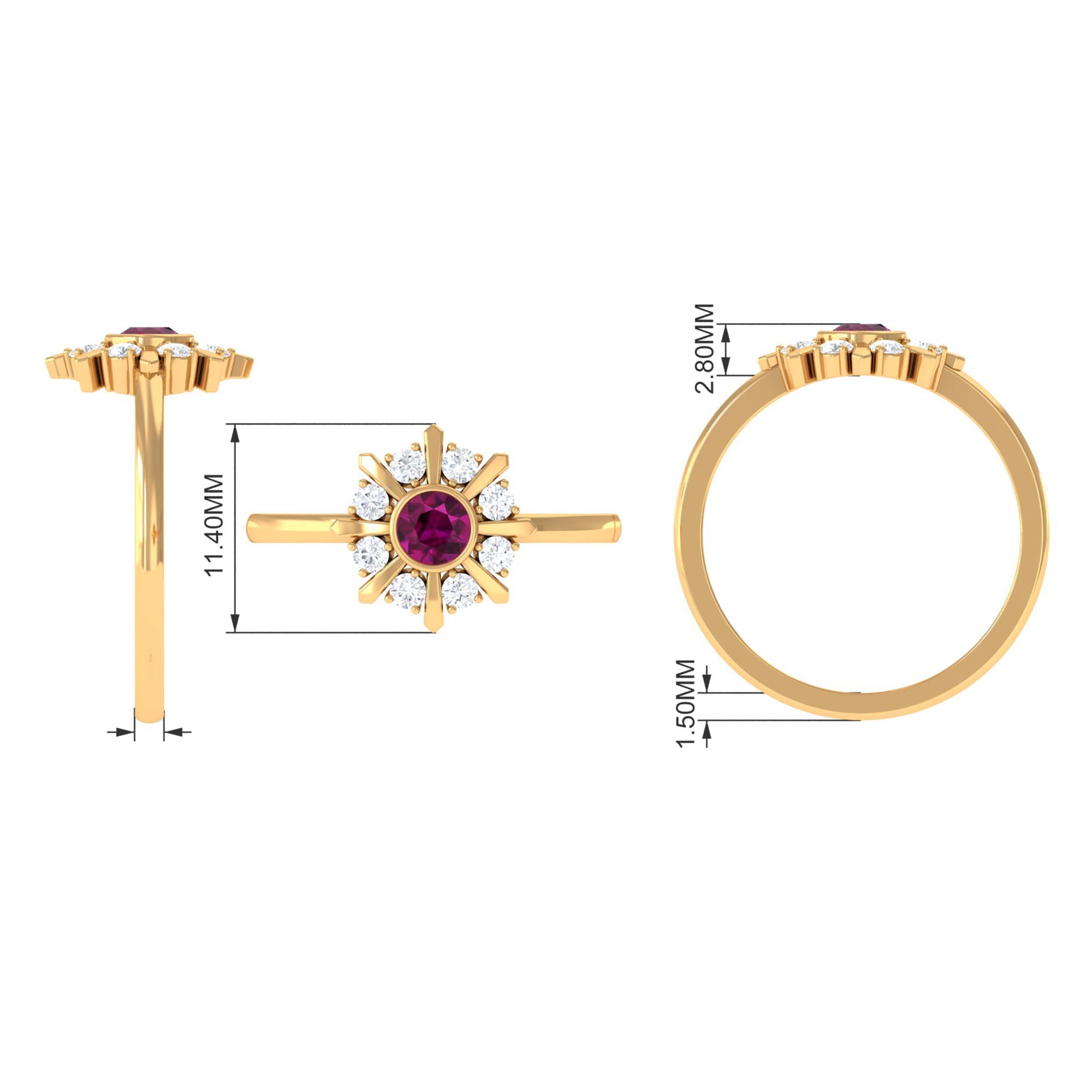 When the center stone of Rhodolite is adorned with a sparkling parade of Diamond/Moissanite all around, it is referred to as a Rhodolite Halo Ring. The Halo lends an interesting aesthetic appeal to the otherwise classic Rhodolite Solitaire Ring. Not to forget- it also makes the Rhodolite appear larger than its actual size.