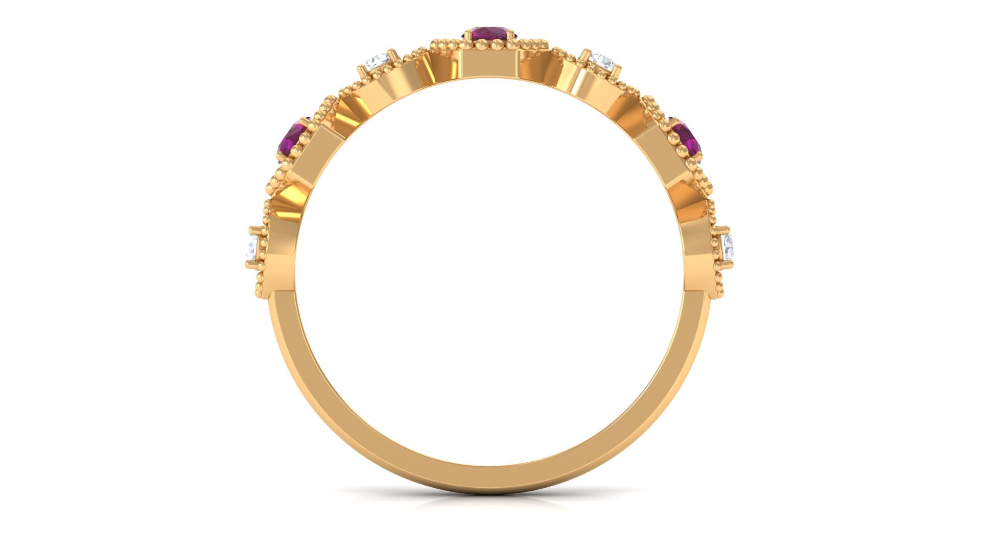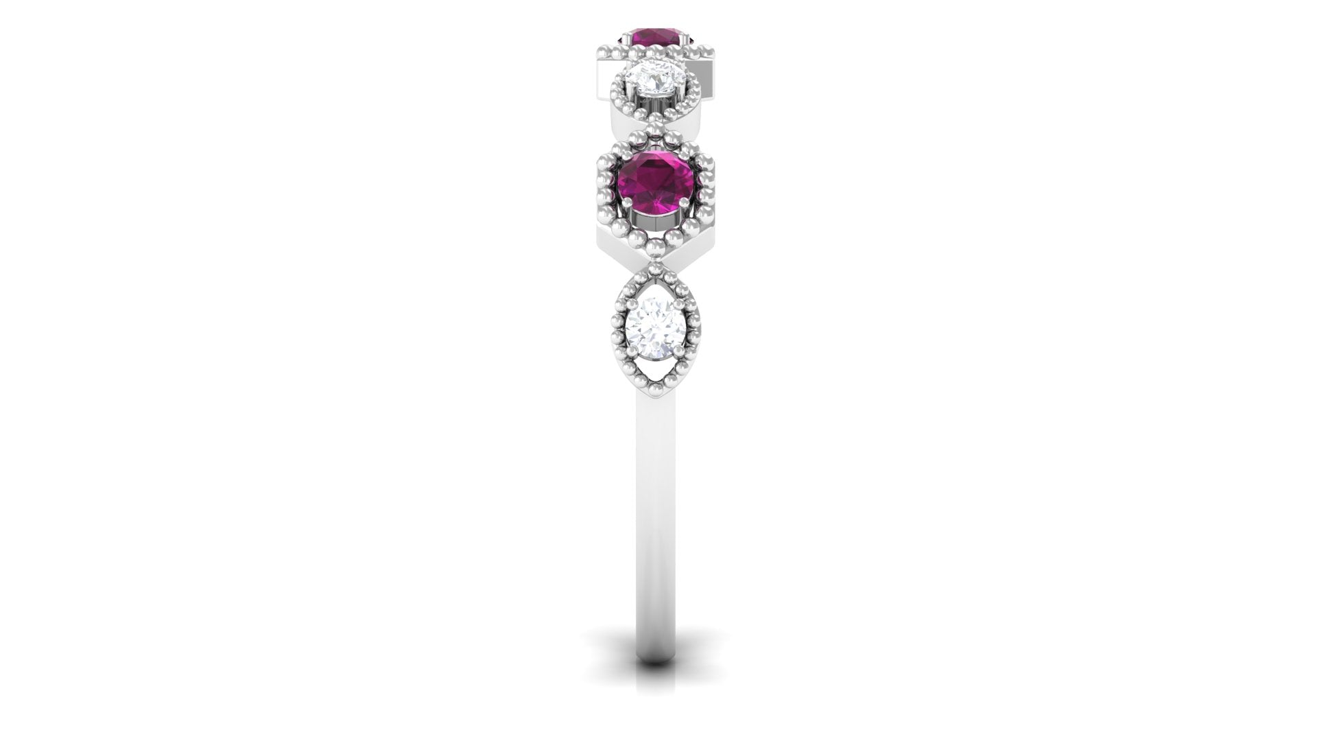 A Rhodolite Wedding Ring is embedded with Rhodolite in an endless pattern (just like an eternity ring). You have a world of options to pick the one to say I do in. For a Classic appeal, nothing compares to a Simple Rhodolite Band Ring. While if you’re into extravagant aesthetics, the ones ornamented with vintage detailing, floral-inspired designs, and sparkling halos would work best.