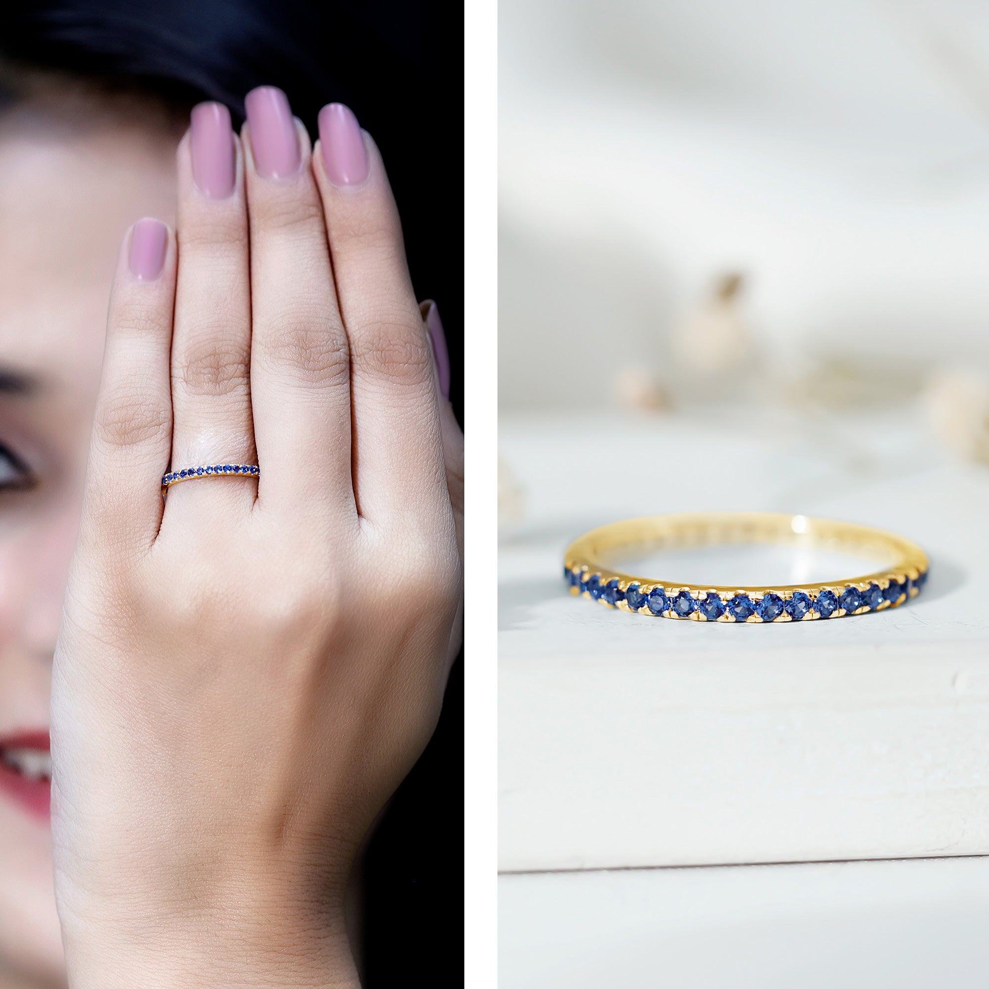 Ring enhancers also known as ring wraps or ring guard are rings that complement the beauty of other rings, especially solitaire rings. They are designed in such a way that they fit properly alongside the existing ring. Besides making a beautiful and stunning pair, they also provide protection to the ring and frame it with elegance. Our diamond ring enhancers or colored eternity bands are handcrafted, in a wide range of styles to complement your engagement and wedding rings.