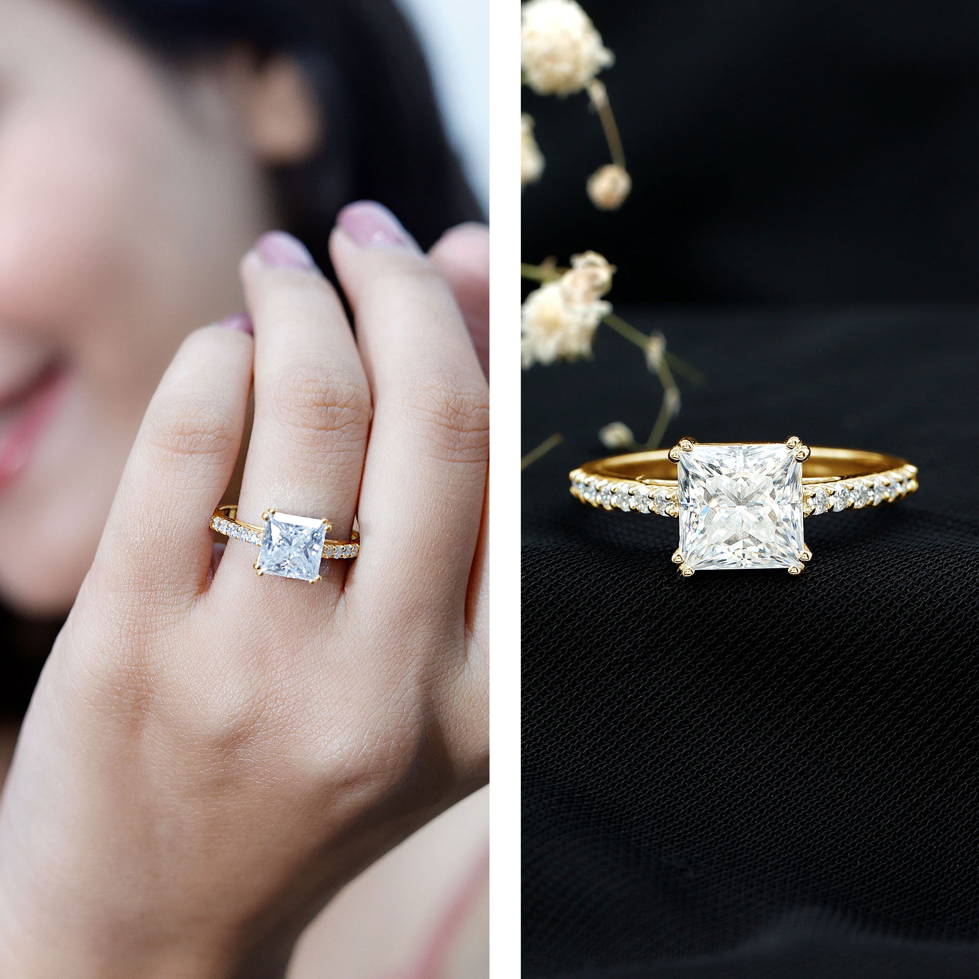 Wish to know a little secret? Not only does it sparkle at its best, but also deceives your eye by offering the illusion of a bigger center stone. So, you could totally take it to mean that it offers you the best of both worlds, making it one of the most unique gemstone rings for women out there!