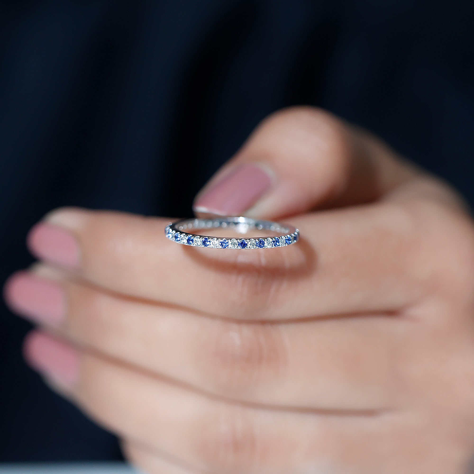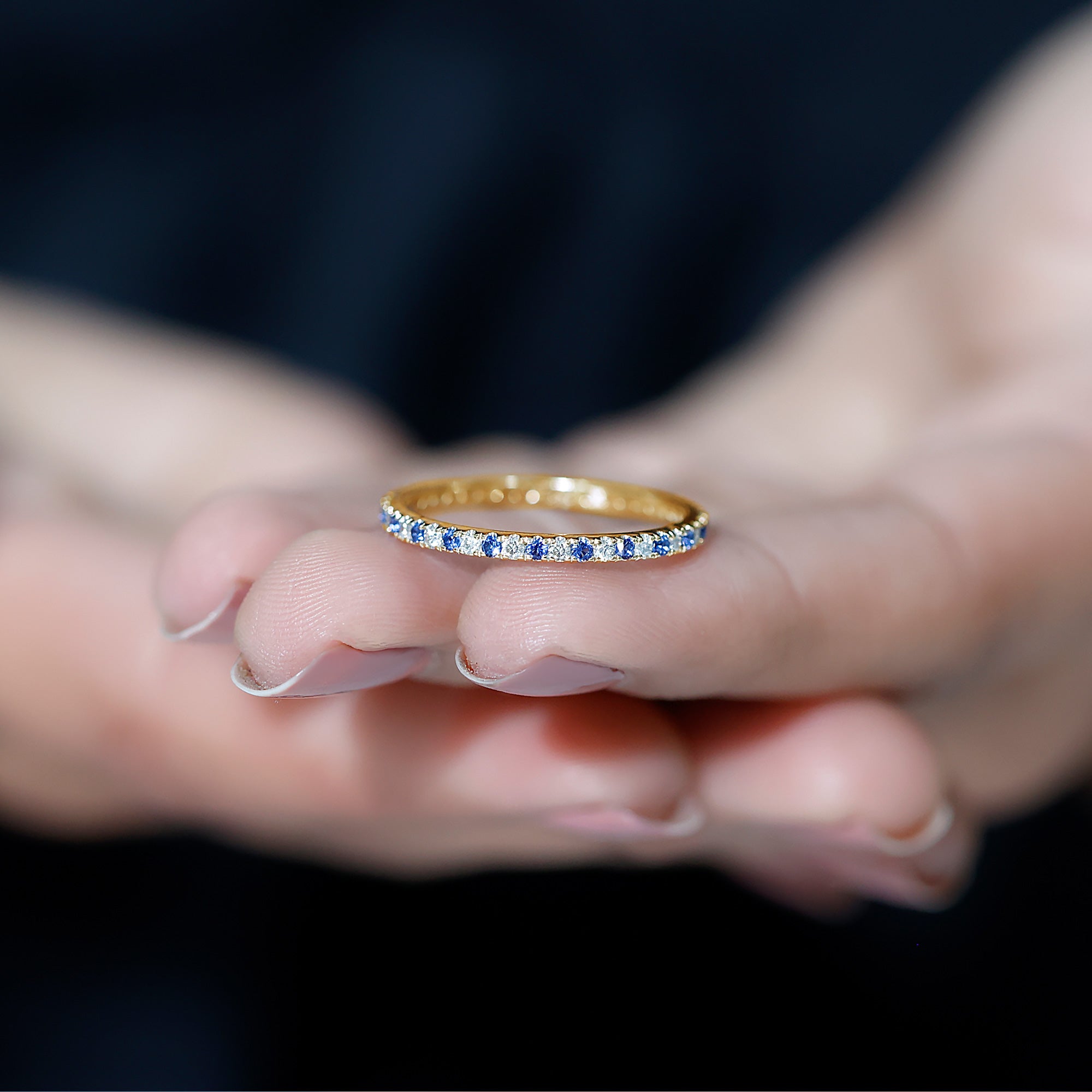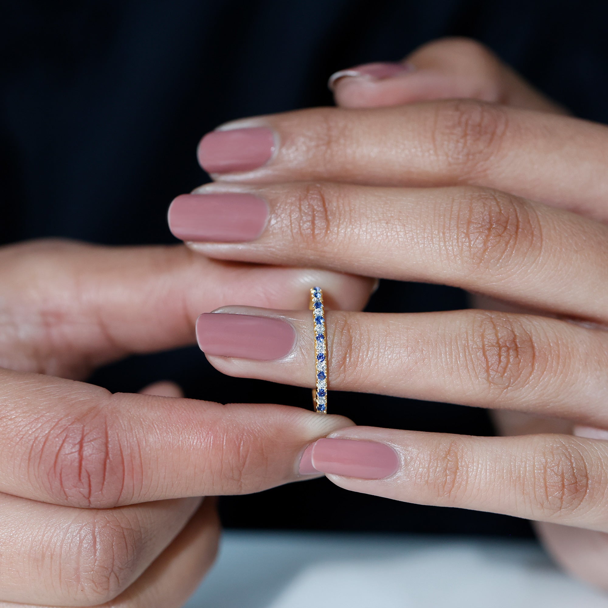 Typically, it is a type of metal ring that features gemstones set in a continuous band around the circumference of the ring. If you’re seeking something simple to flaunt regularly, a band with subtle colored stones such as Morganite, Aquamarine, Moissanite, or a Classic 14K White Gold Gemstone Band could be the one. While if you’re a little more fond of a pop of color, deeply hued stones such as Ruby, Blue Sapphire, Emerald etc., or a Yellow or Rose Gold Gemstone Band might do the job right.