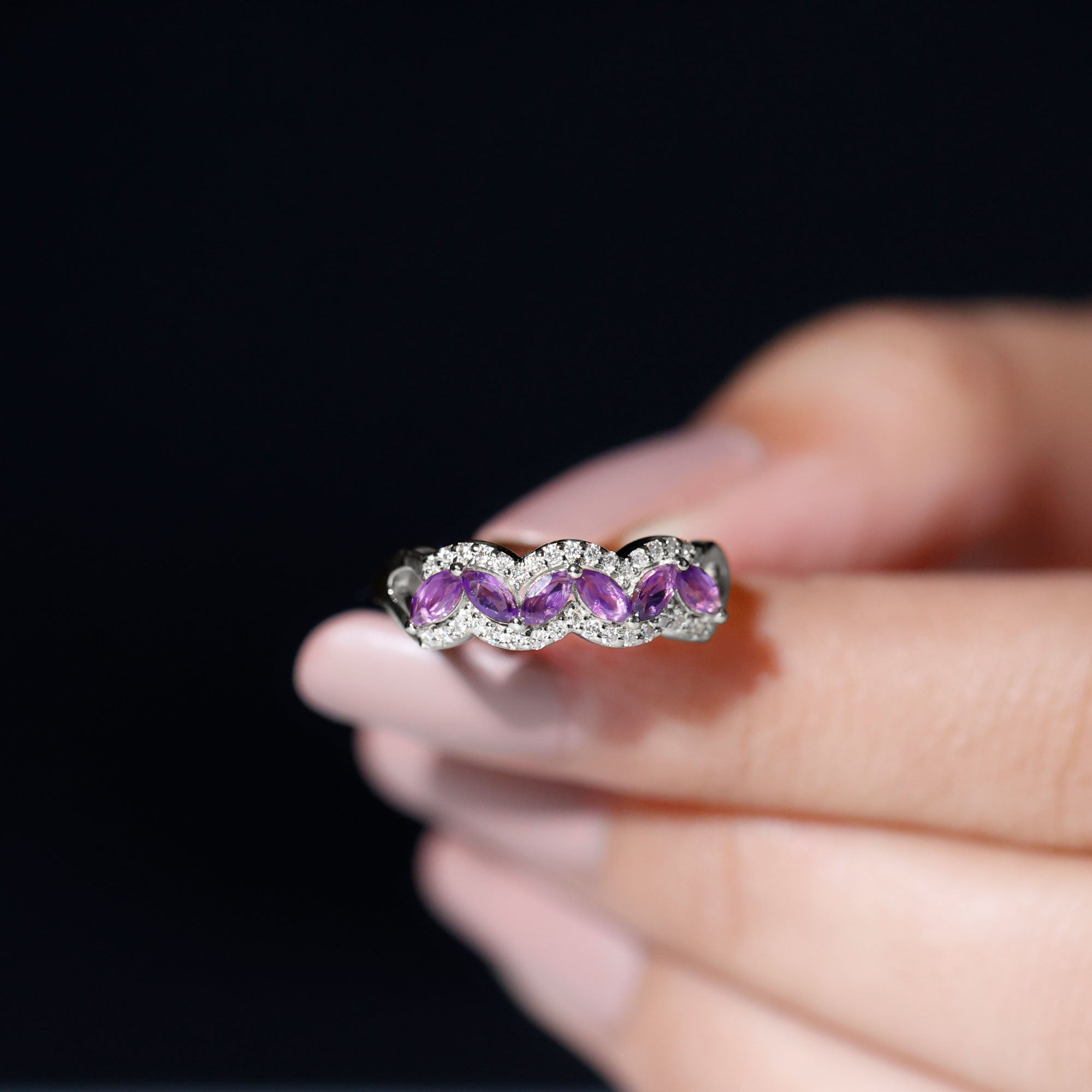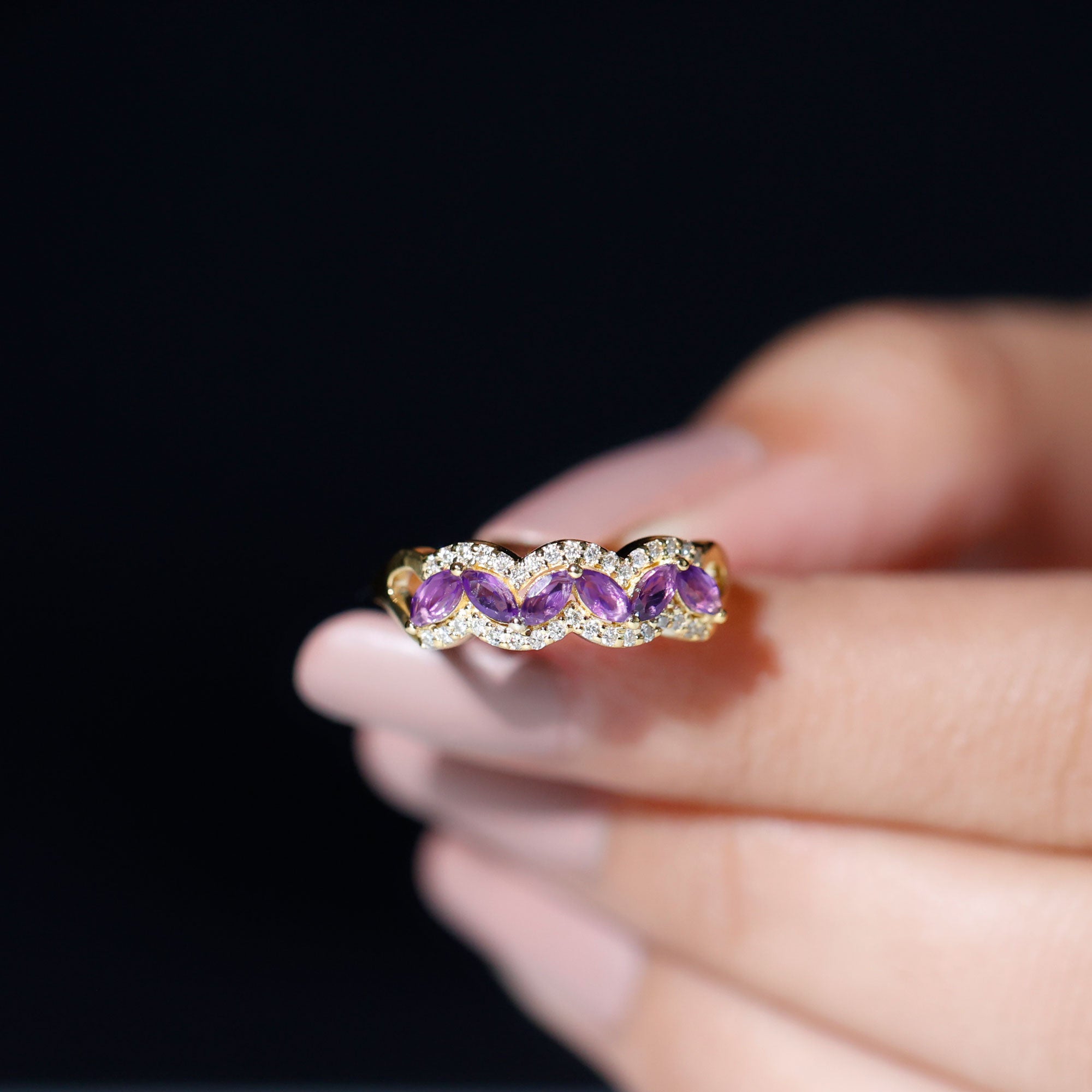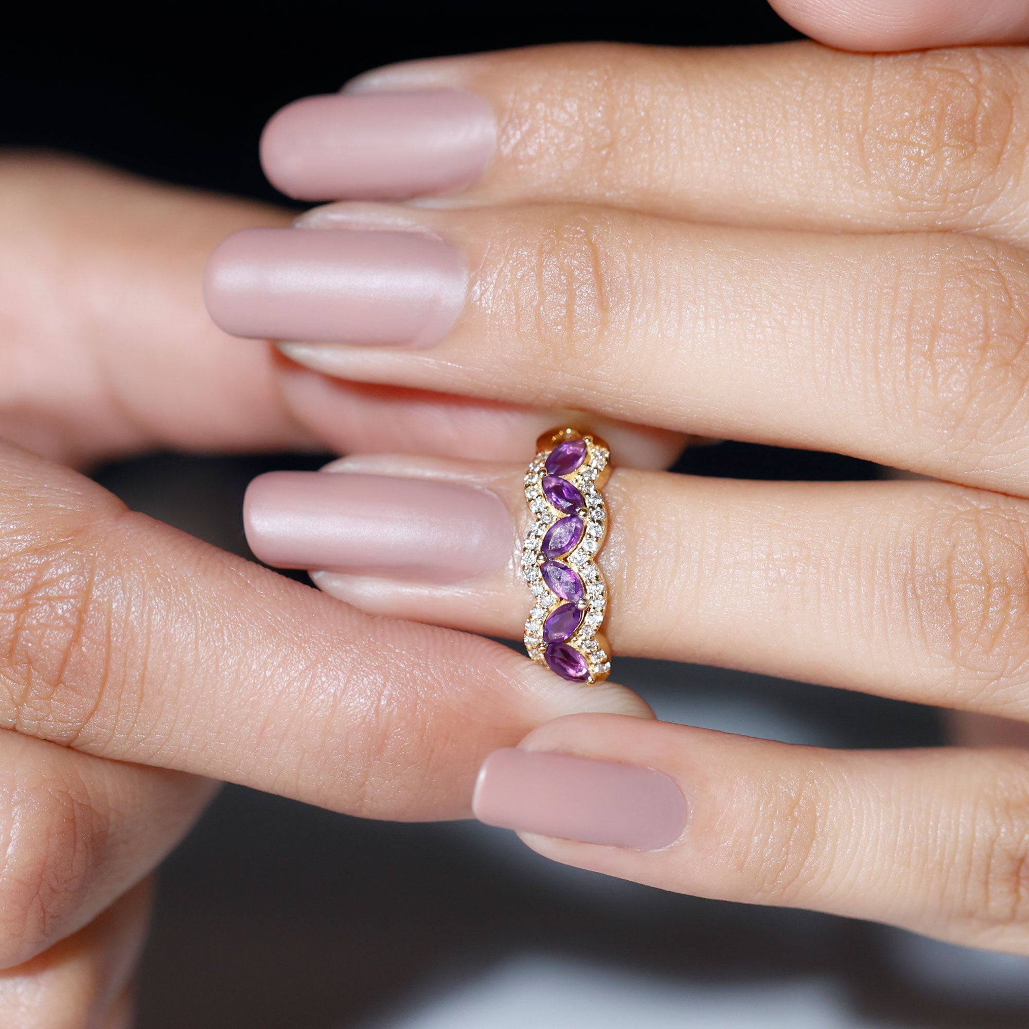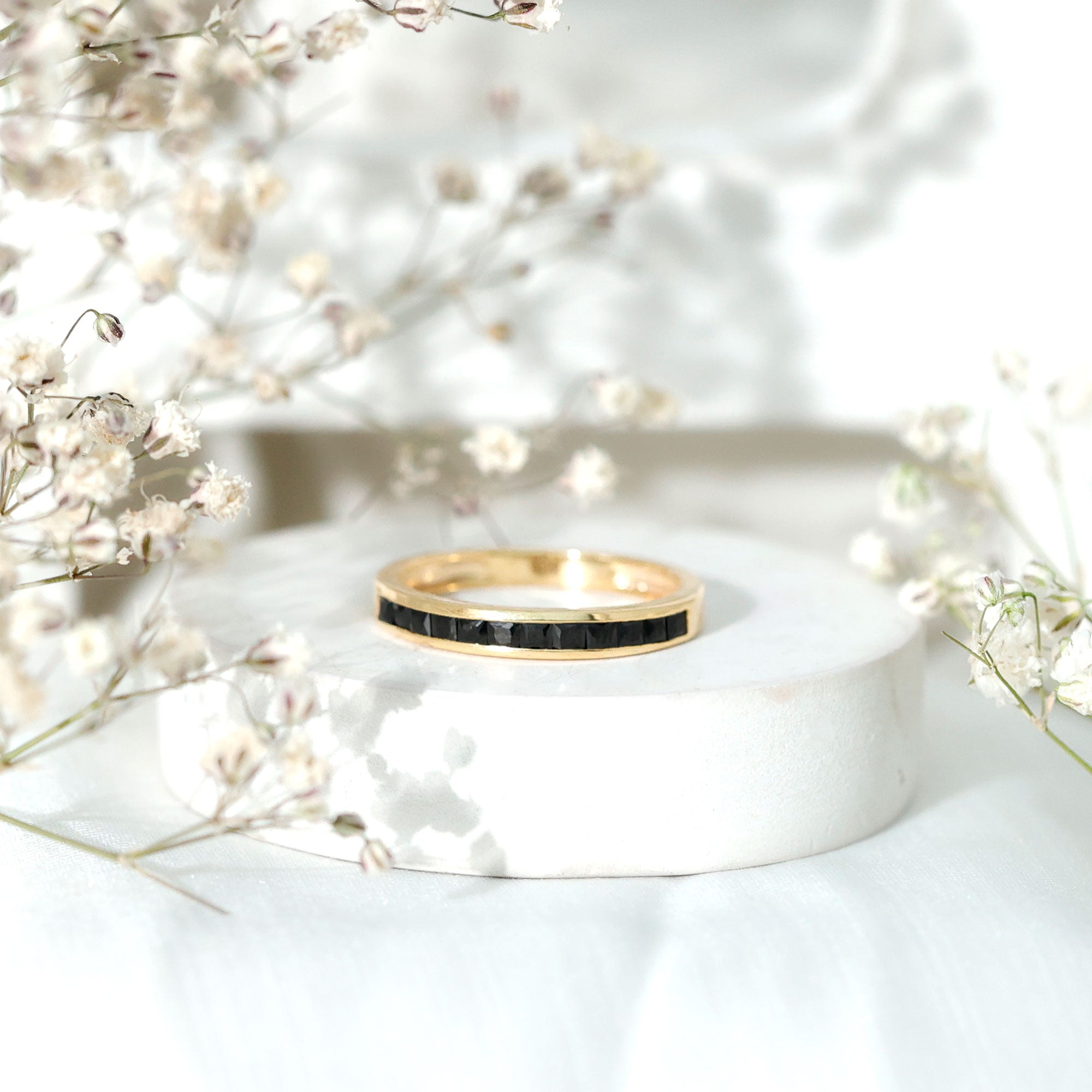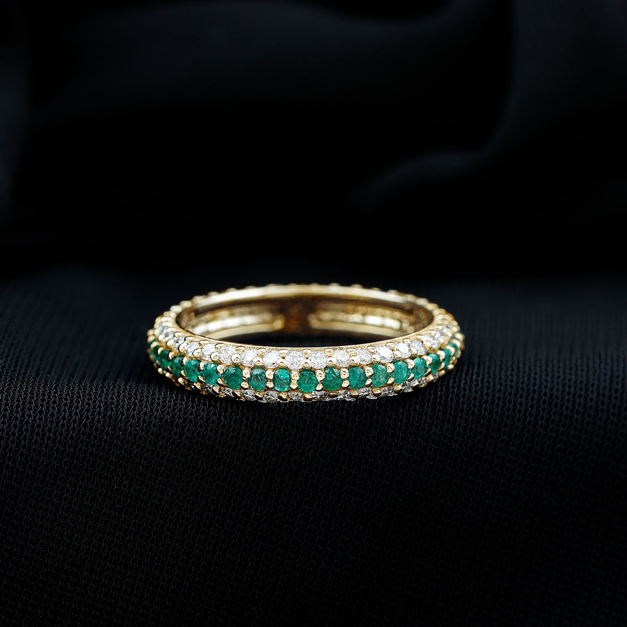 Typically, it is a type of metal ring that features gemstones set in a continuous band around the circumference of the ring. If you’re seeking something simple to flaunt regularly, a band with subtle colored stones such as Morganite, Aquamarine, Moissanite, or a Classic 14K White Gold Gemstone Band could be the one. While if you’re a little more fond of a pop of color, deeply hued stones such as Ruby, Blue Sapphire, Emerald etc., or a Yellow or Rose Gold Gemstone Band might do the job right.