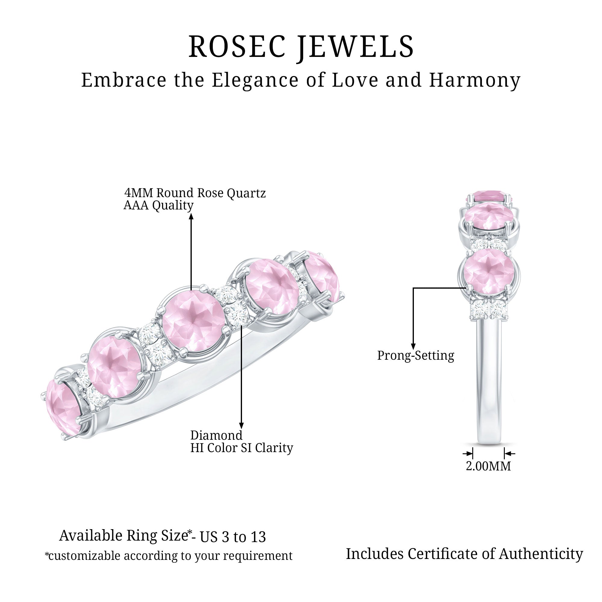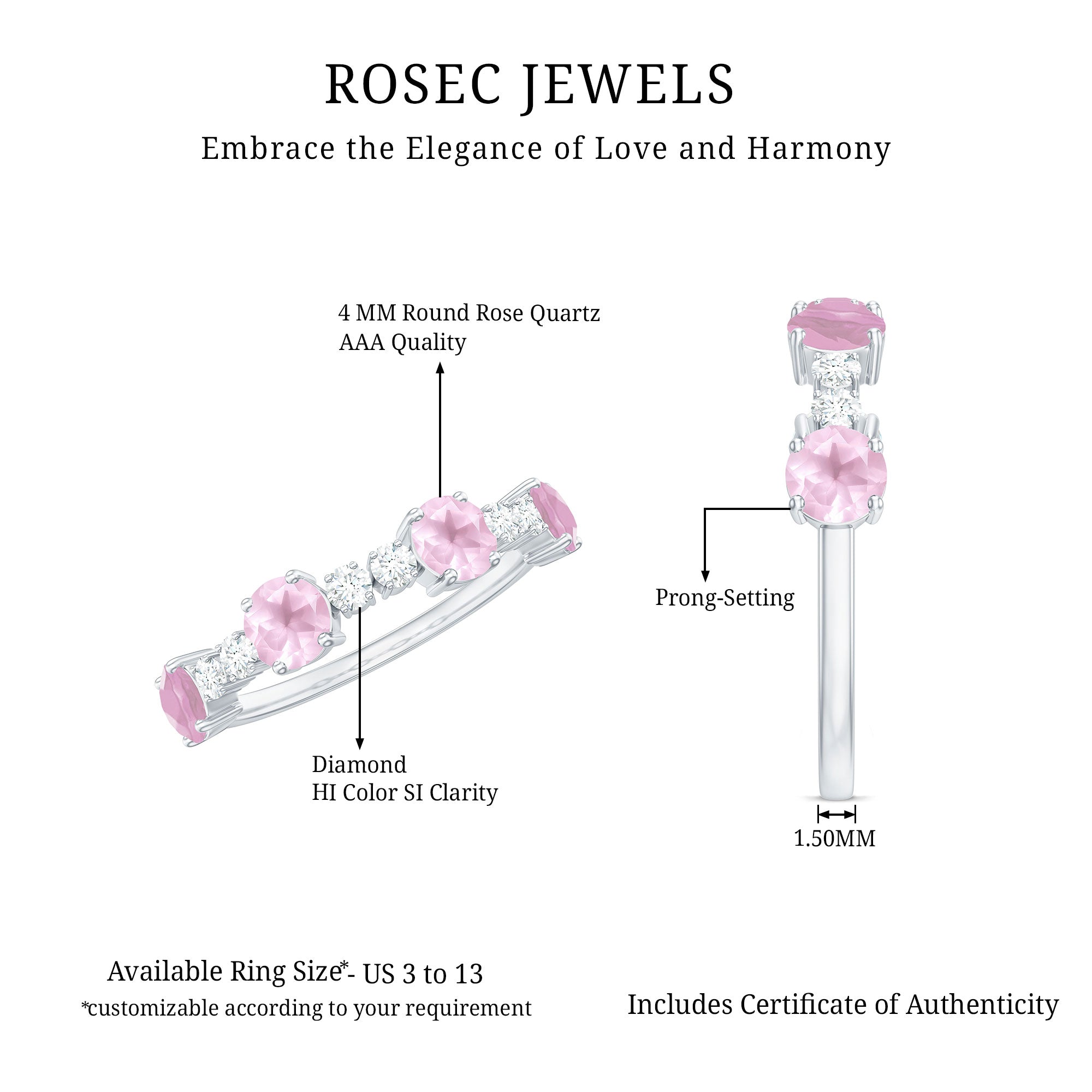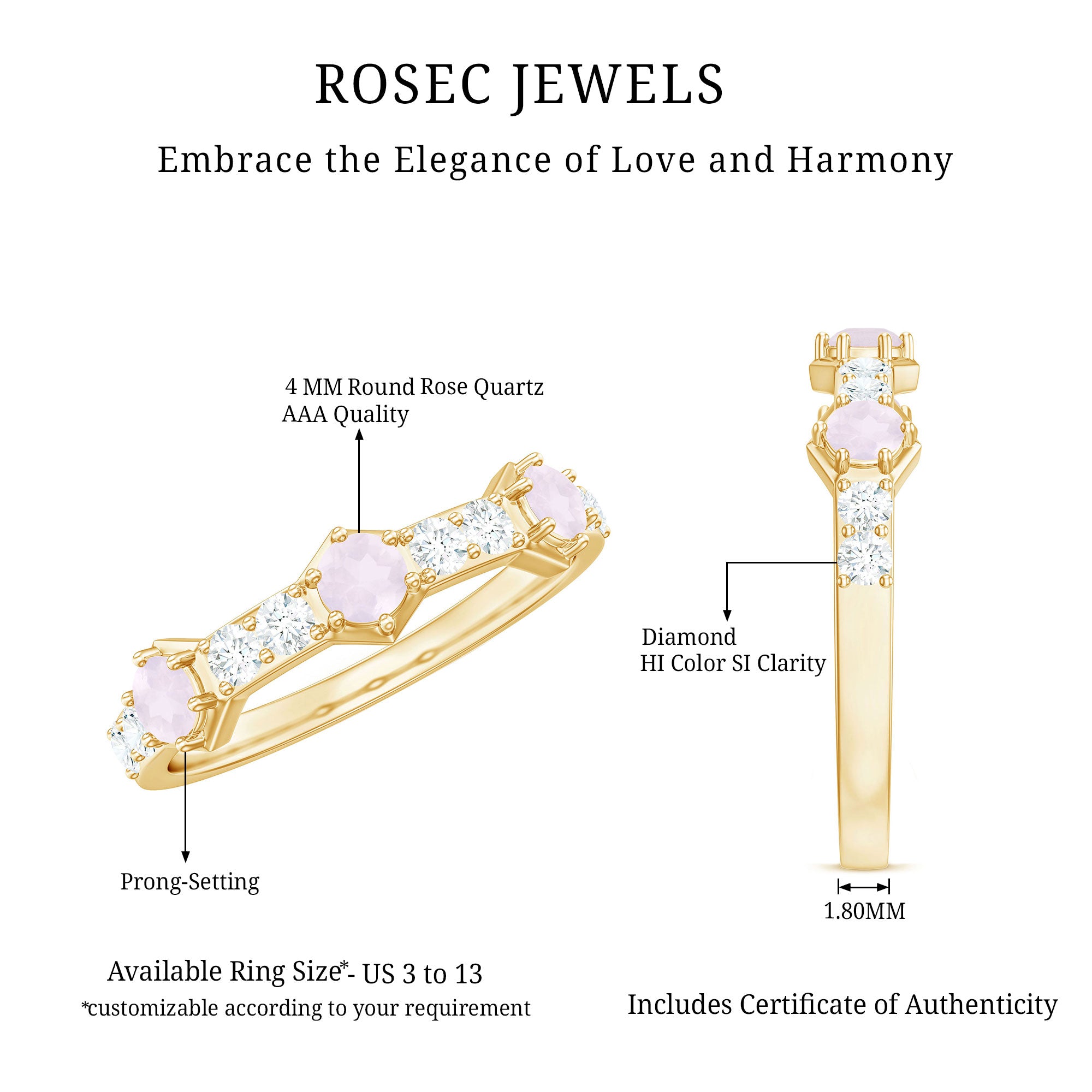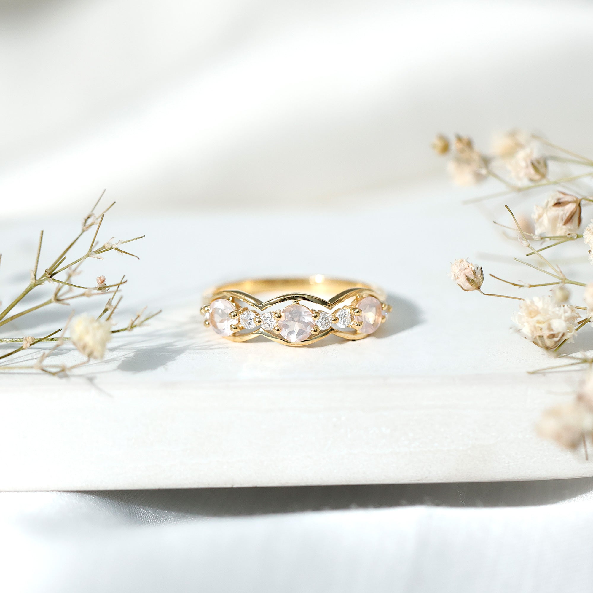 Rose quartz wedding rings from the online store of Rosec Jewels are a collection of enticing wedding rings for women to tie the knot between two souls. The romantic pink saturation of rose quartz rings makes them a popular choice among women when it comes to buying wedding rings. Thus bearing in mind, the latest trends in fashion jewelry our artisans have come out with out of the box ring styles with fine details. Rose quartz wedding band is one such sophisticated style to watch out for when it comes to buying wedding bands for women.