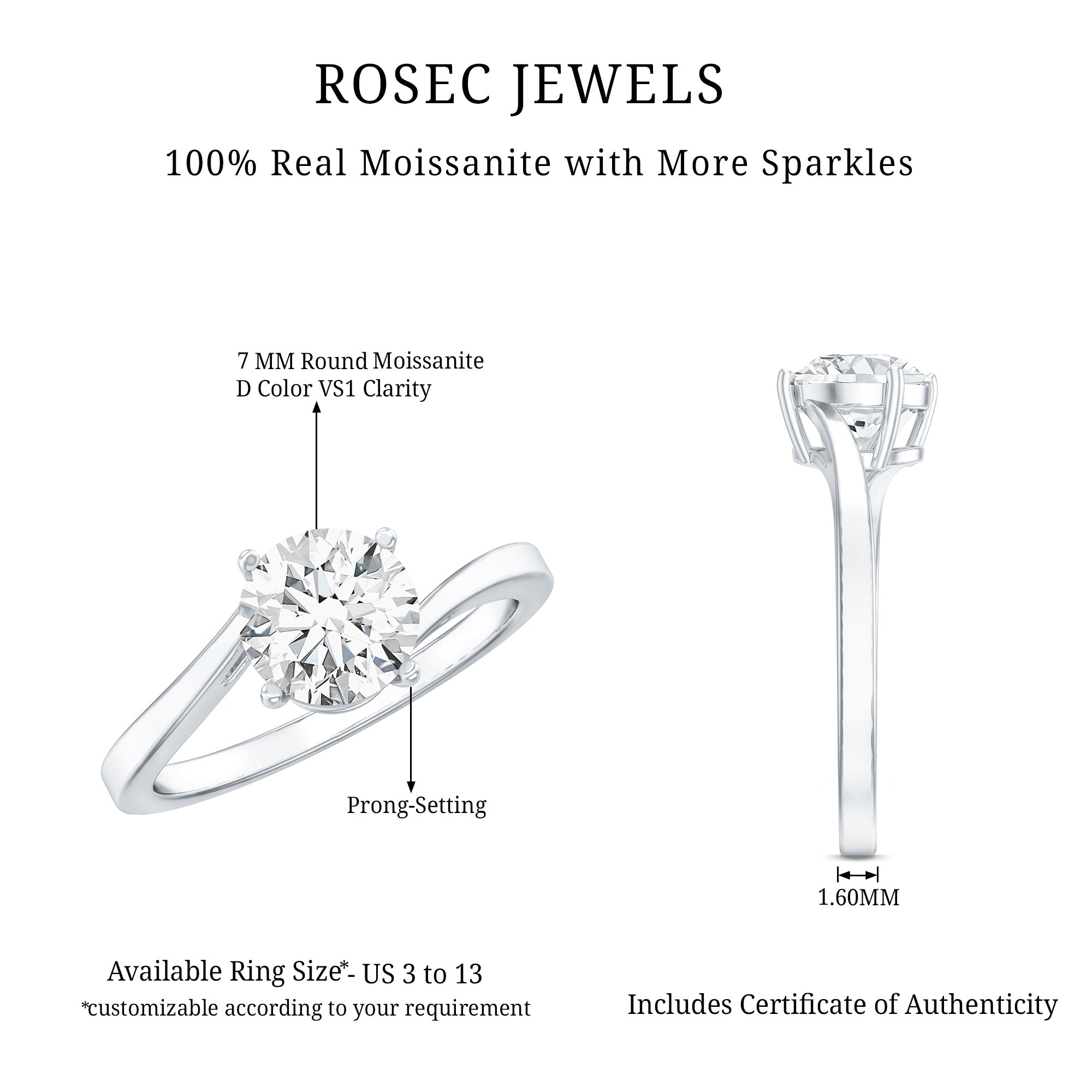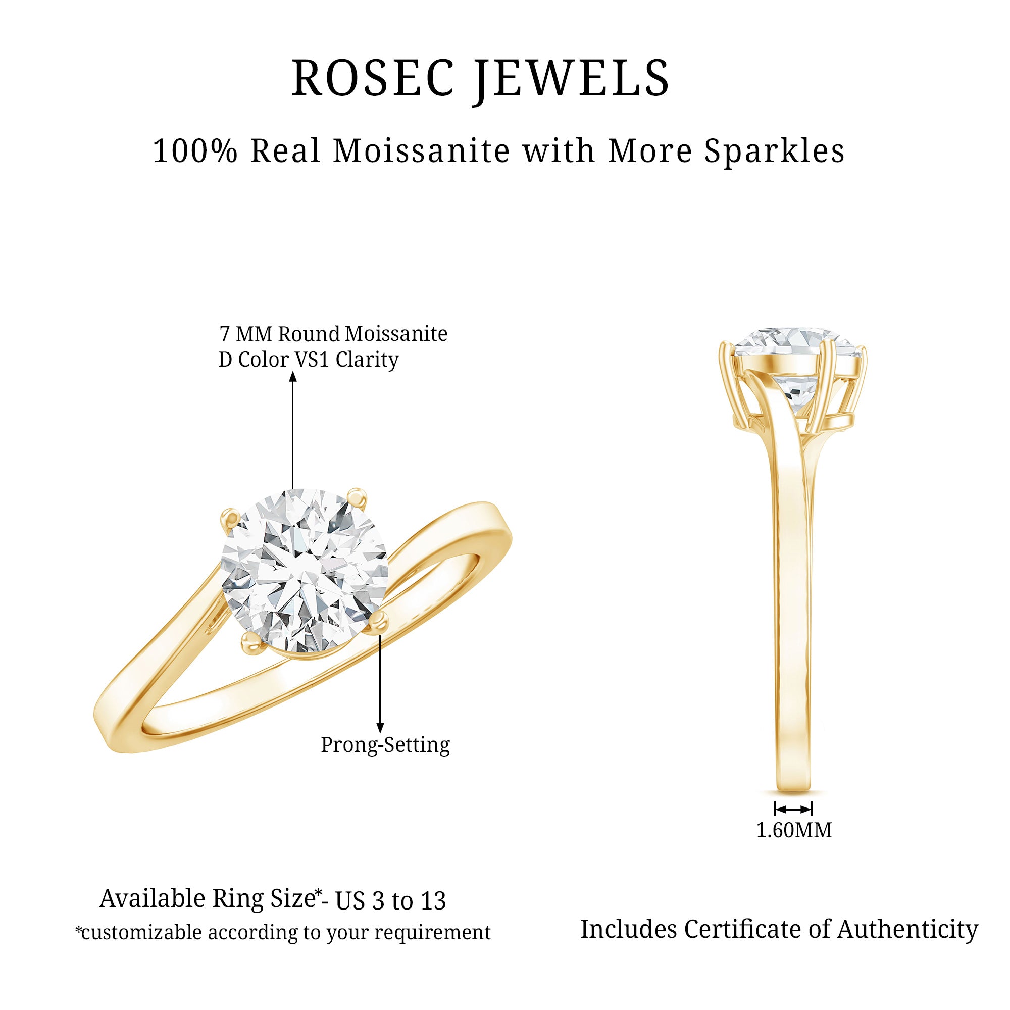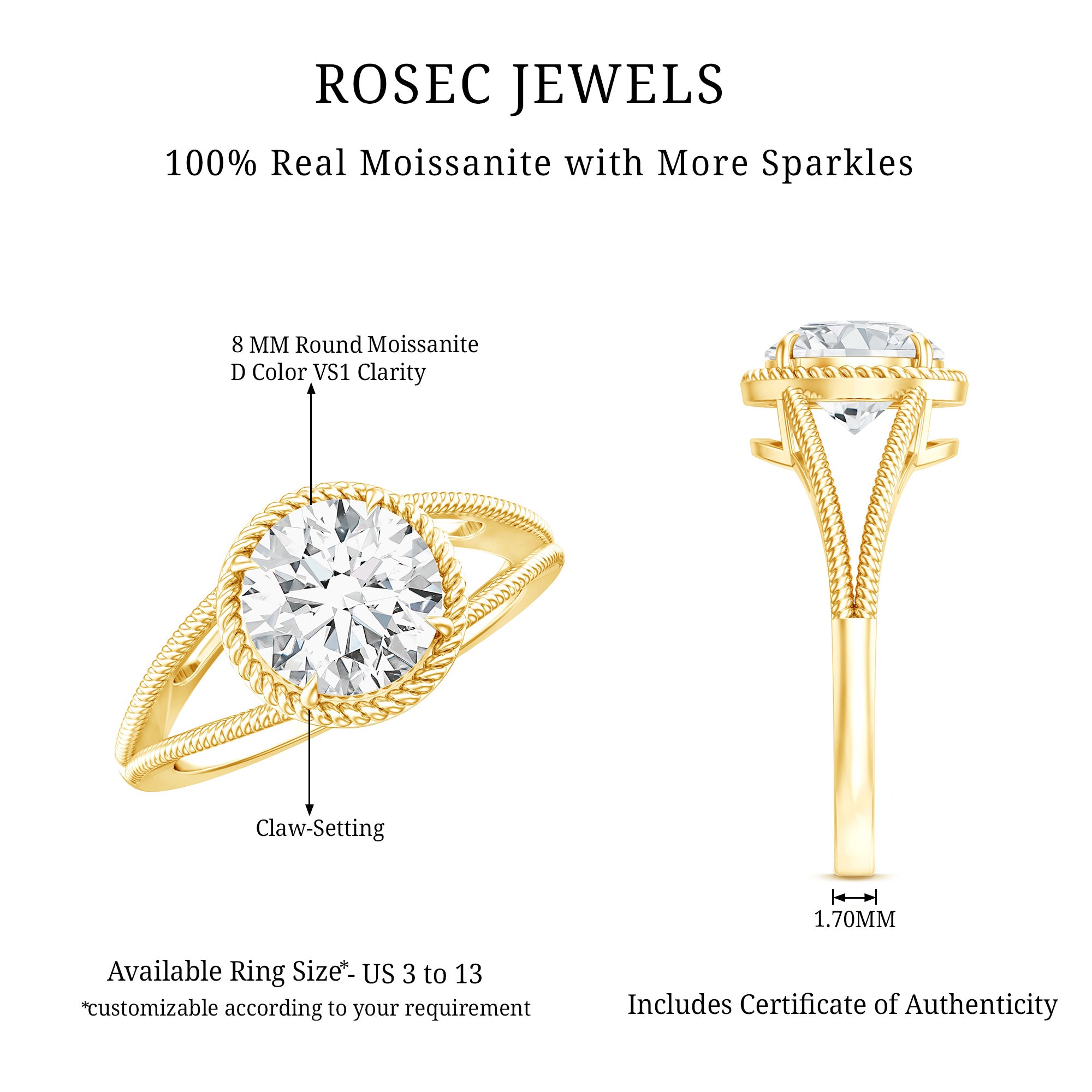Rosec Jewels, is well known for its experience and wide catalogue of handcrafted engagement rings to suit every style and budget. We keep our collection updated with the trending and inspiring pieces like solitaires and statement rings to designer and minimal pieces. Our round engagement rings feature everything from classic diamonds and moissanites to colored gemstones, both natural and lab-grown. Our high-quality certified gemstones undergo strict quality checks for their authenticity. We have a simple 30-day return policy for complete peace of mind and our fast, reliable shipping ensures that your ring arrives on time.