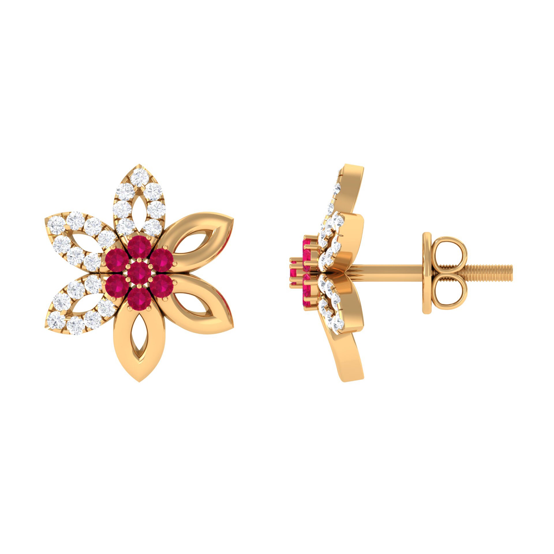 Looking for a pair of gold stud earrings that evoke the beauty of nature? Our collection of flower stud earrings is inspired by the gentle features of the natural world and captivates attention with every movement. This design blends ruby with shimmering moissanite or diamond to craft intricate floral or leaf motifs. Wearing these earrings ensures you stand out from the crowd with their exquisite elegance.