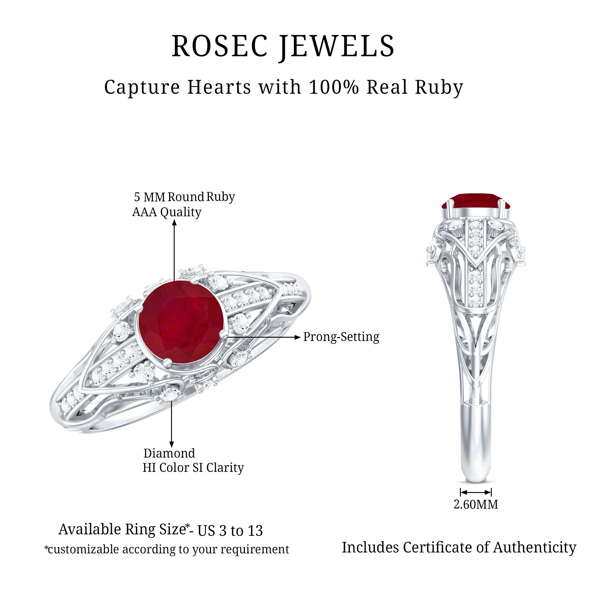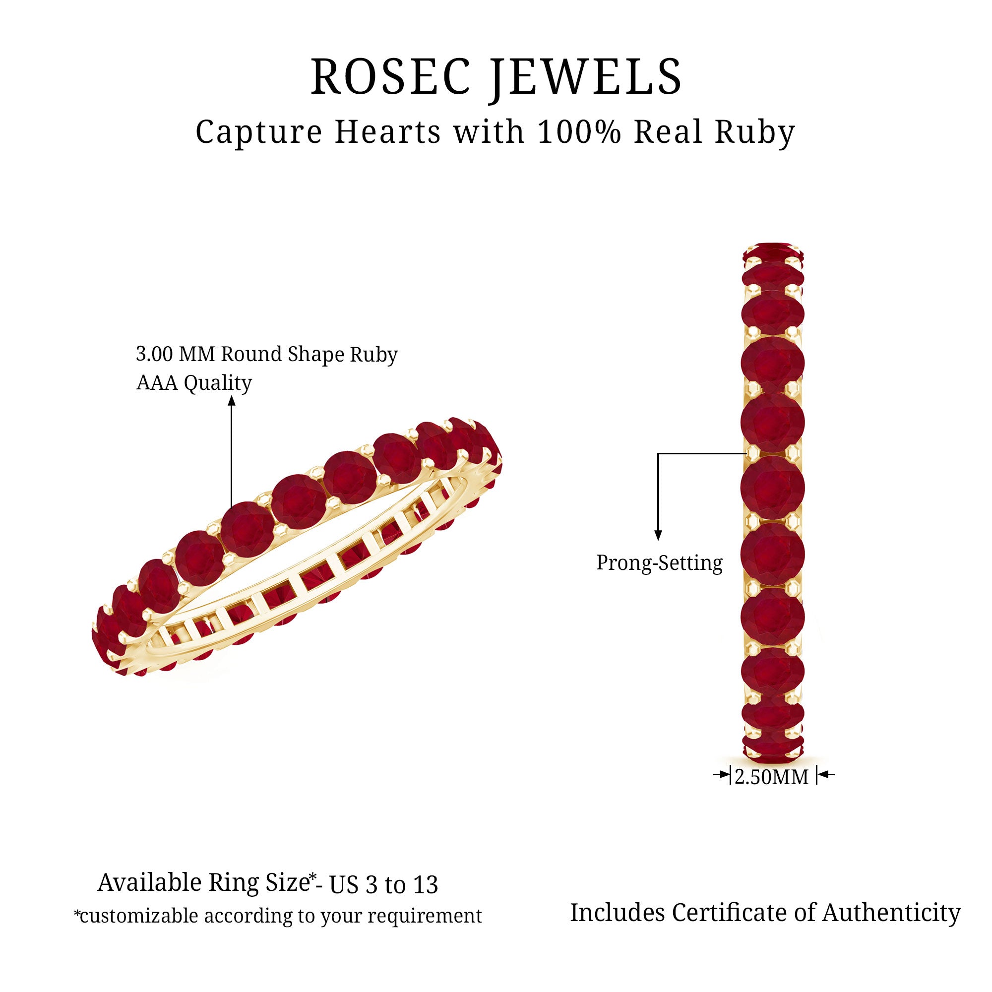 High-Quality Jewelry: Rosec Jewels offers a wide collection of ruby ring designs while ensuring quality. Each ruby ring is made from various precious metal options like white gold, yellow gold, and 925 sterling silver and AAA quality rubies.