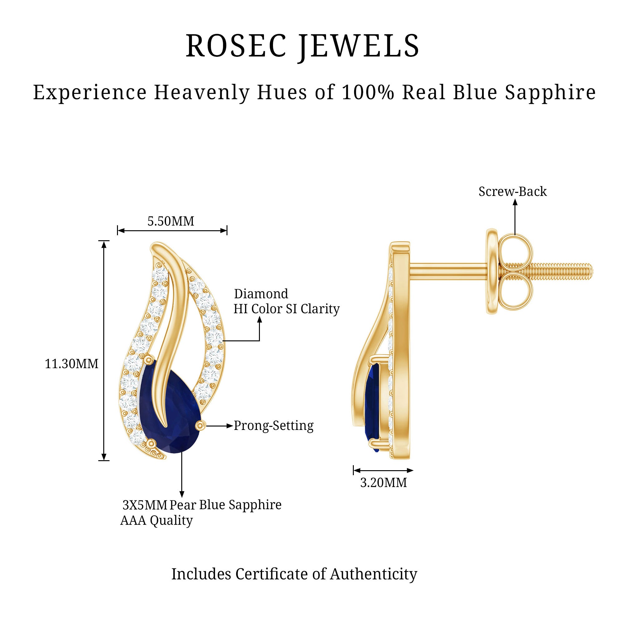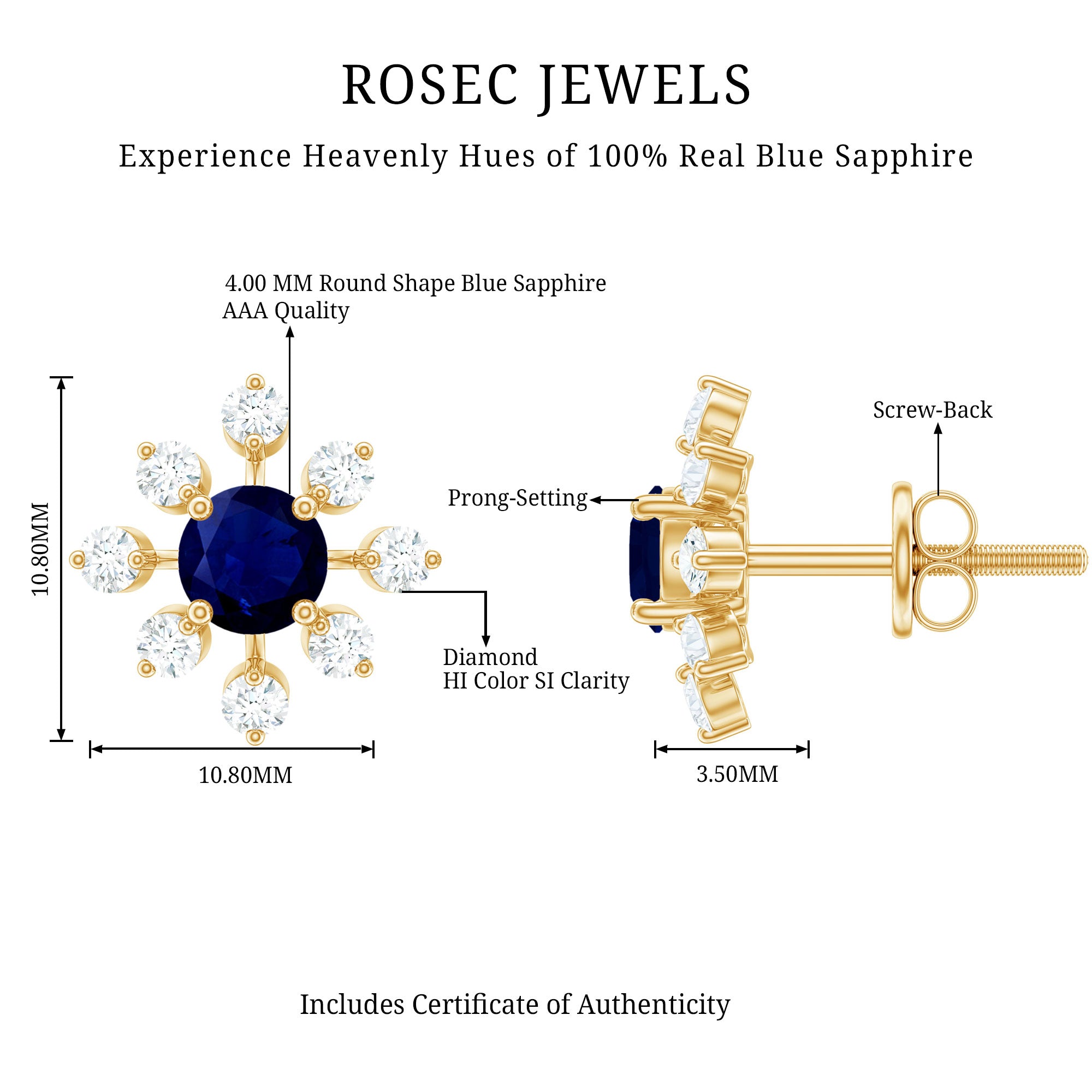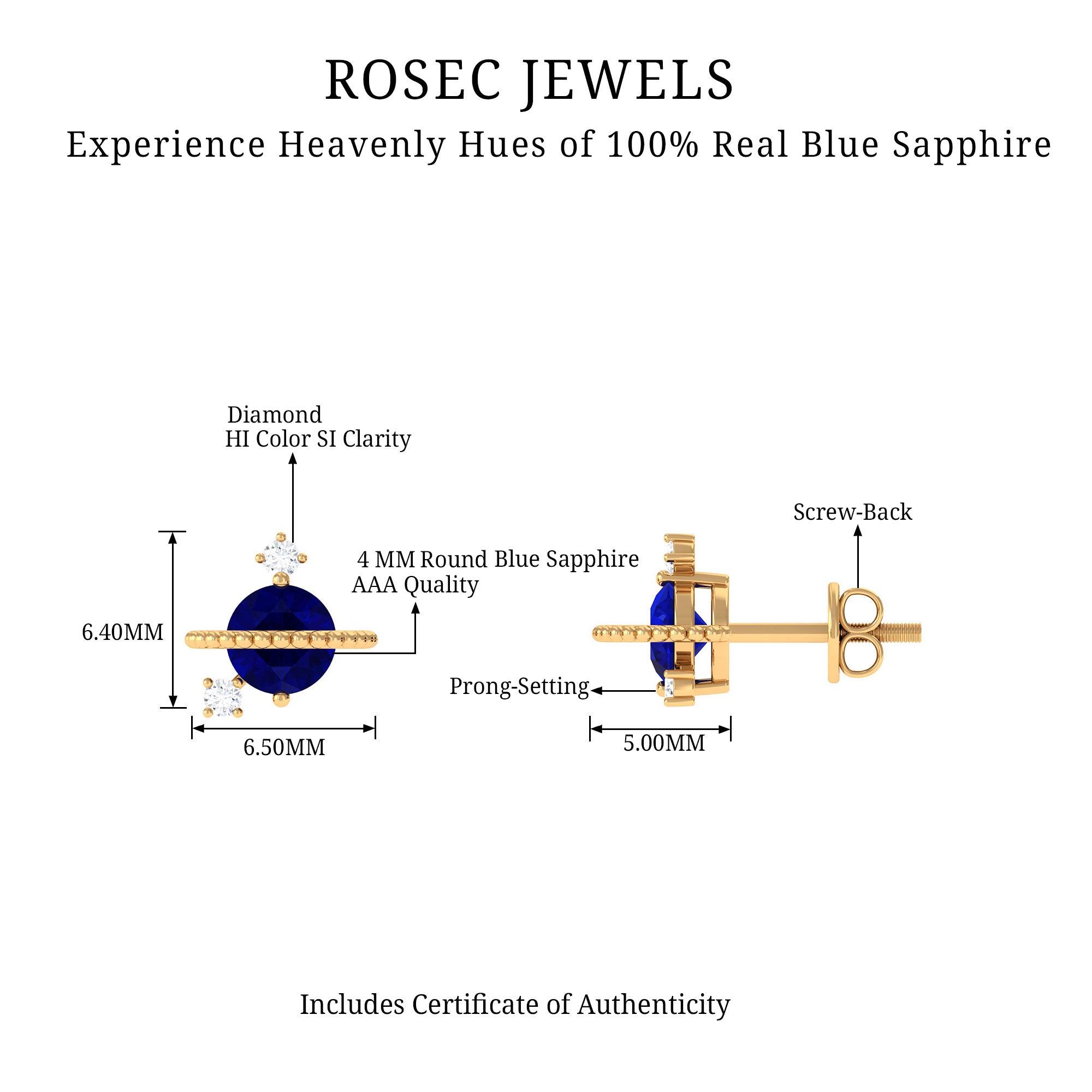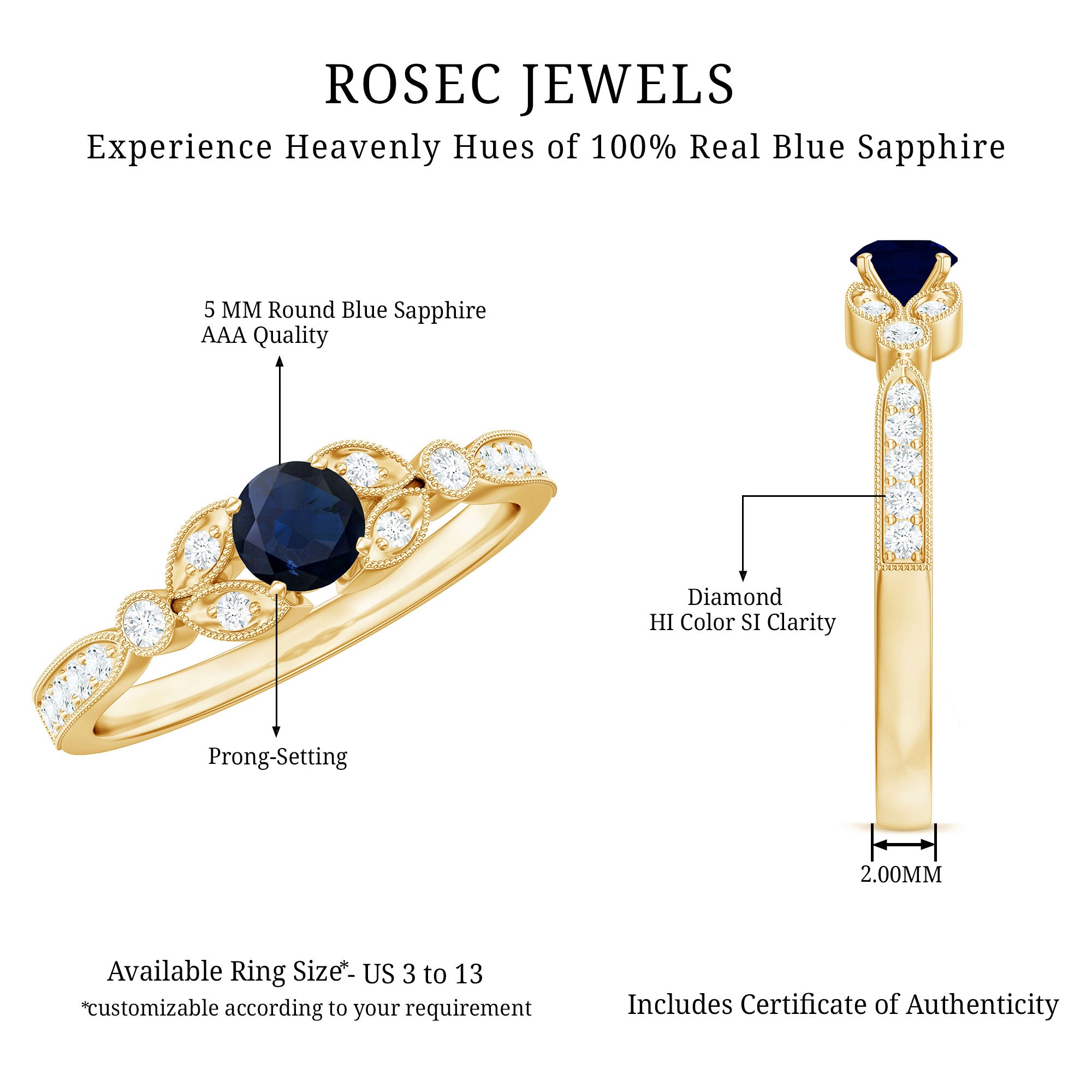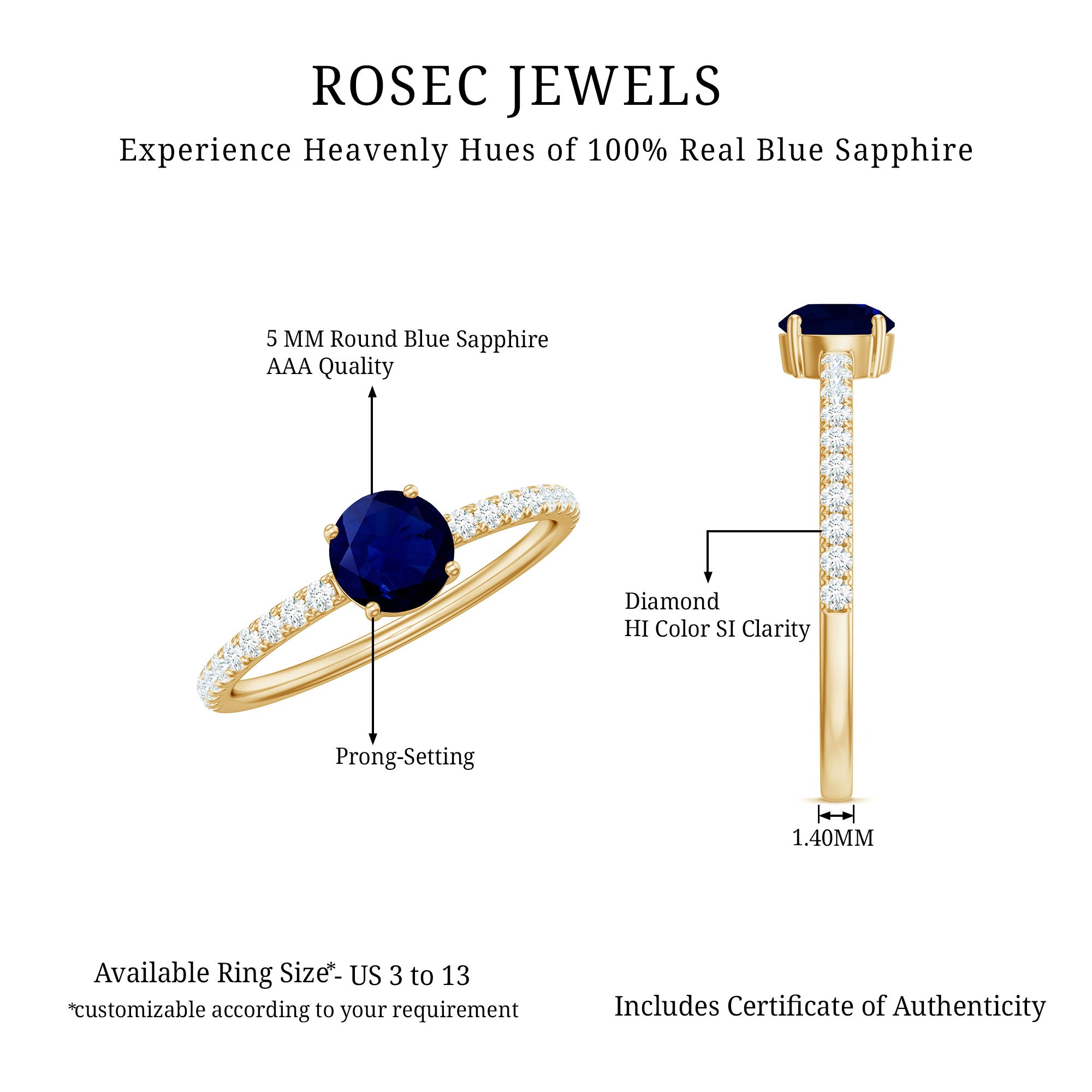 • Yellow Gold: - Being precious, yellow gold offers a warm and sophisticated look when used to craft enduring sapphire jewelry. At Rosec Jewels, you can buy the sapphire jewelry set of 10k, 14k, and 18k yellow gold.