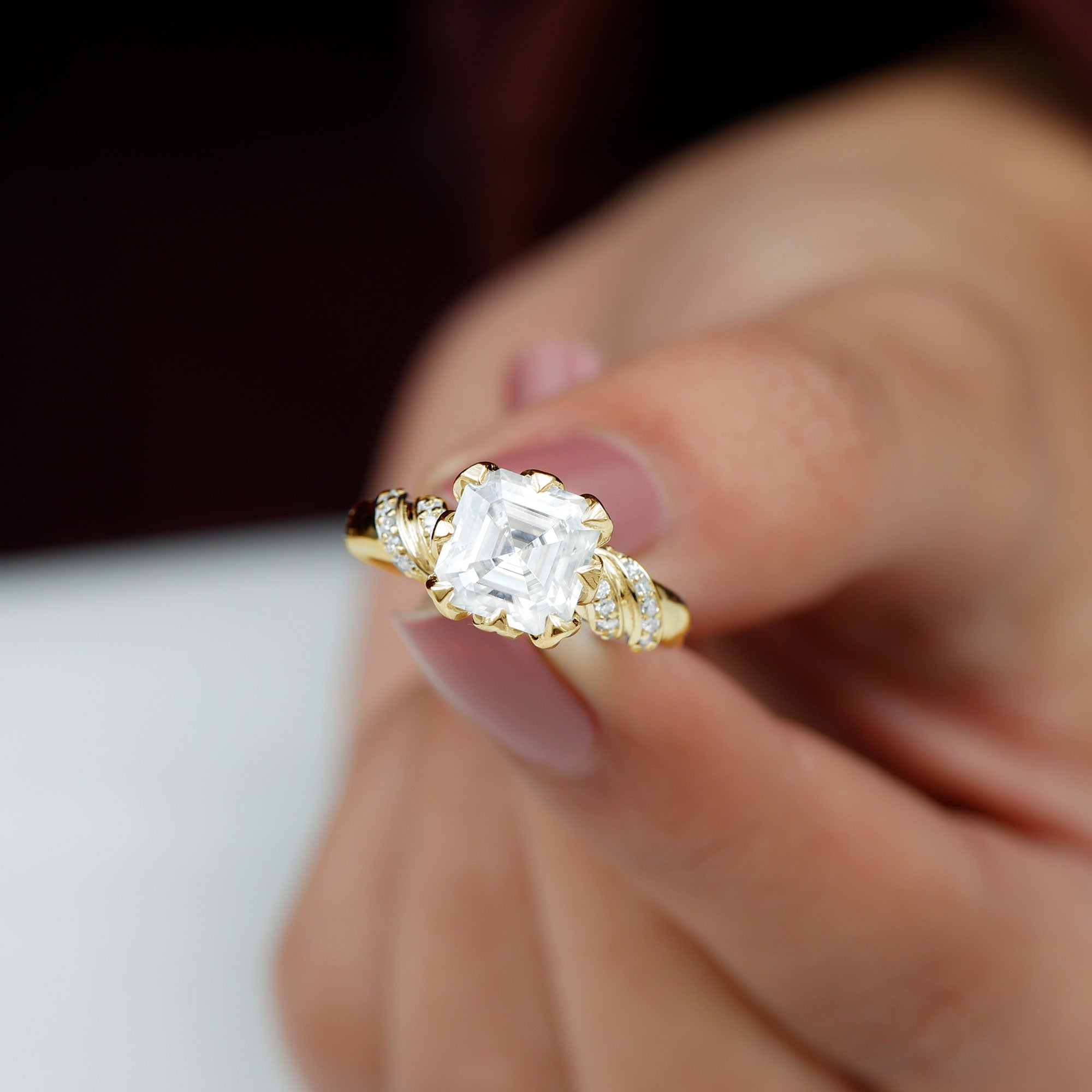 A Single Stone Ring fashioned in Asscher Cut is best defined as a Square Solitaire Engagement Ring that possesses cropped corners, which lends it a more Octagonal Shape. Owing to the strategical arrangement of its 58 facets that showcase a “hall of mirrors’ look, it exudes a vintage Art Deco vibe.