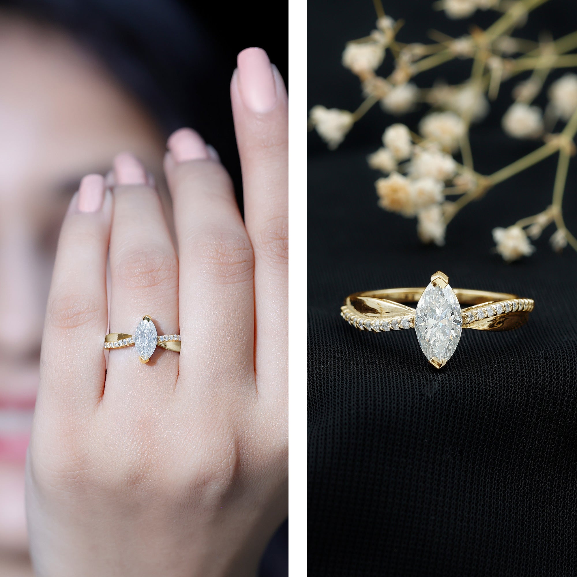 Desired for its fancy look, a Solitaire Marquise Engagement Ring is characterized by a smile-resembling shape that features curved sides and pointed tips. Owing to its elongated shape, it gives off the illusion of a larger looking ring. Moreover, thanks to the arrangement of 58 facets, it also catches the eye with its beautiful bow-tie effect.