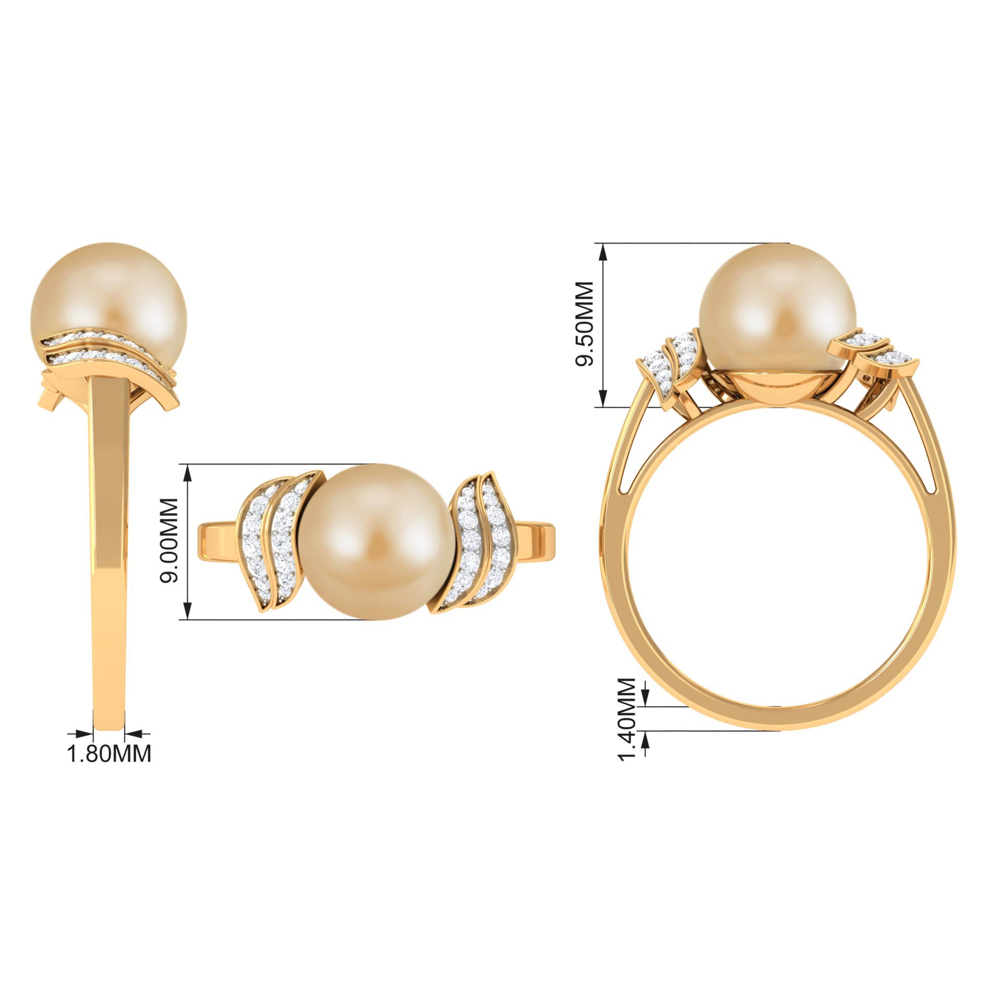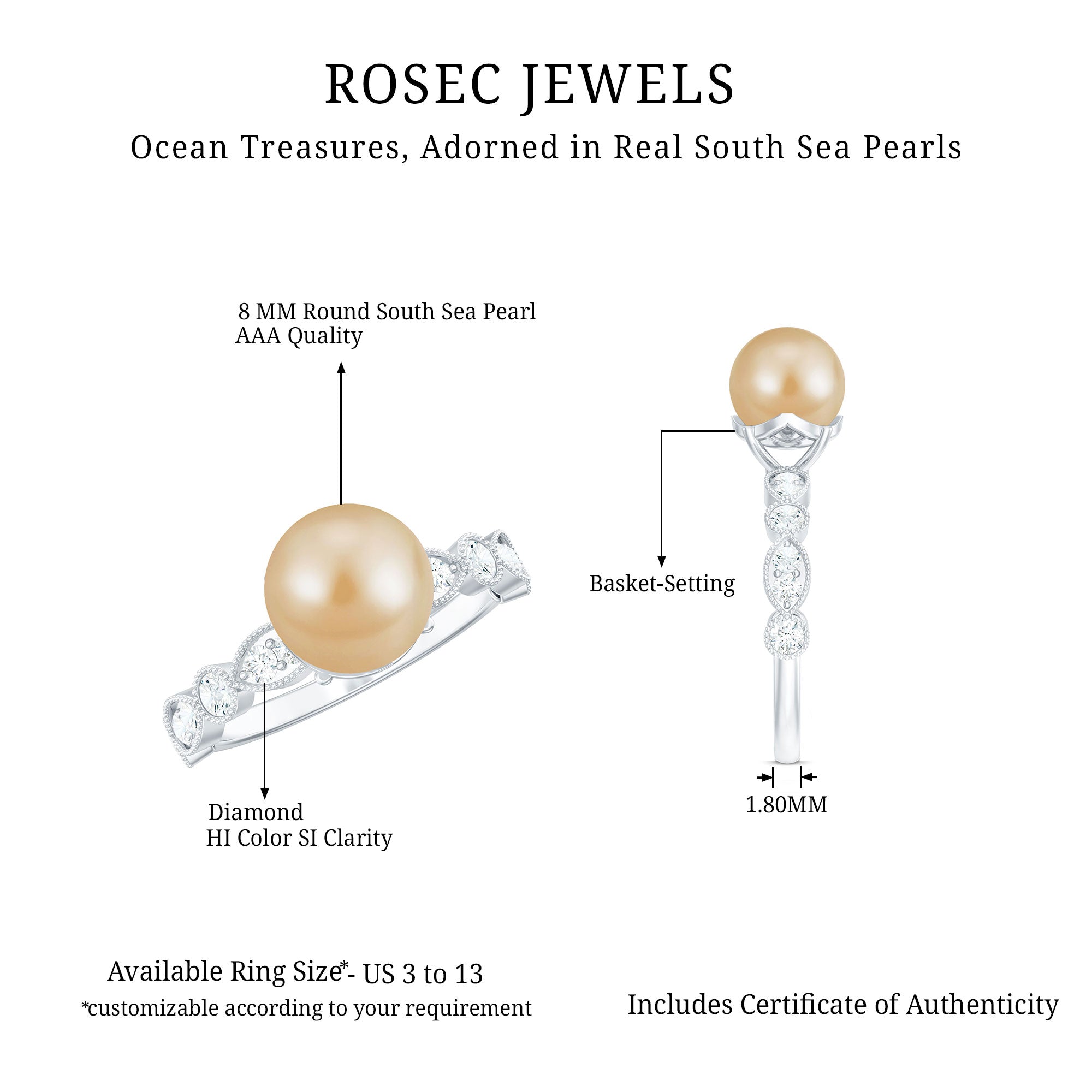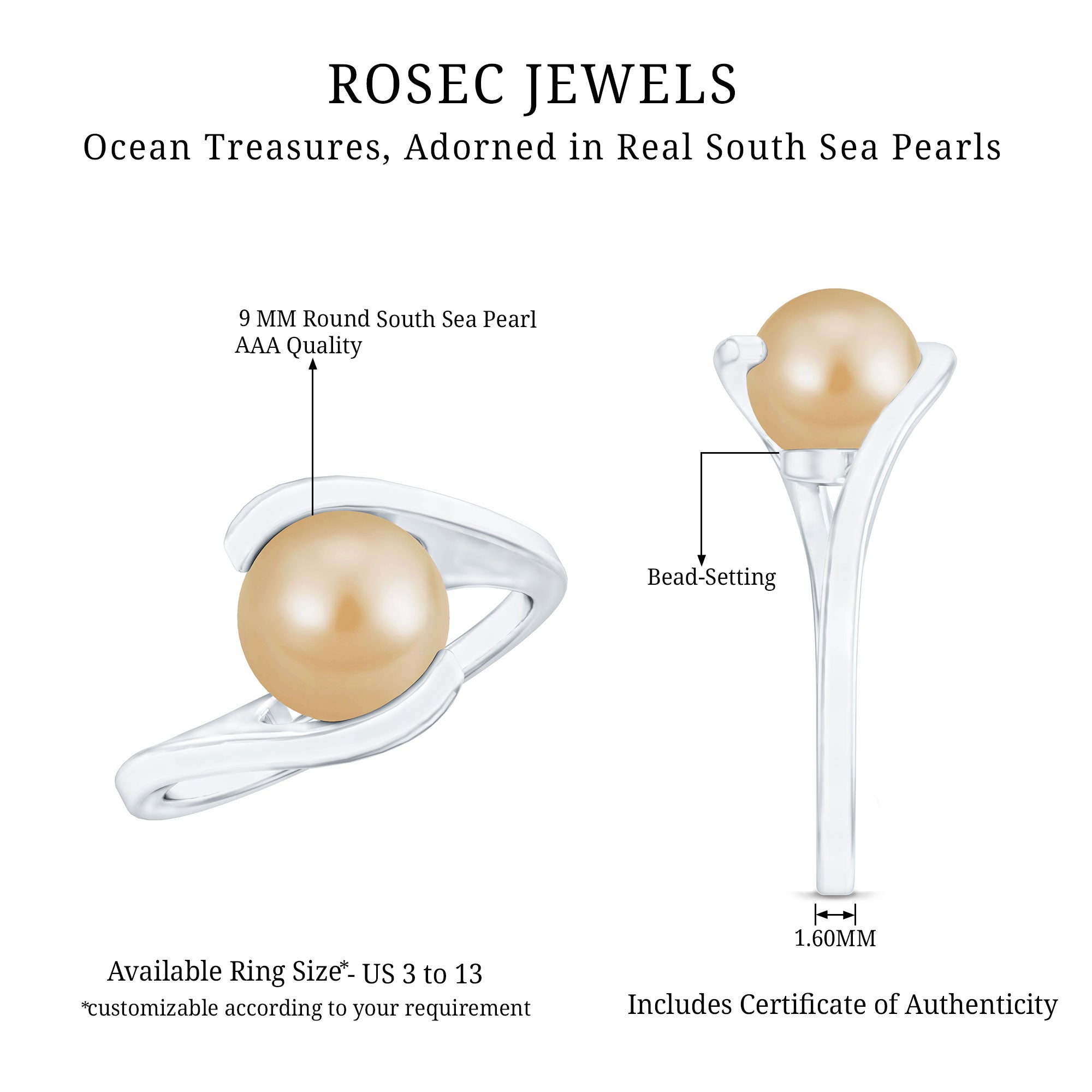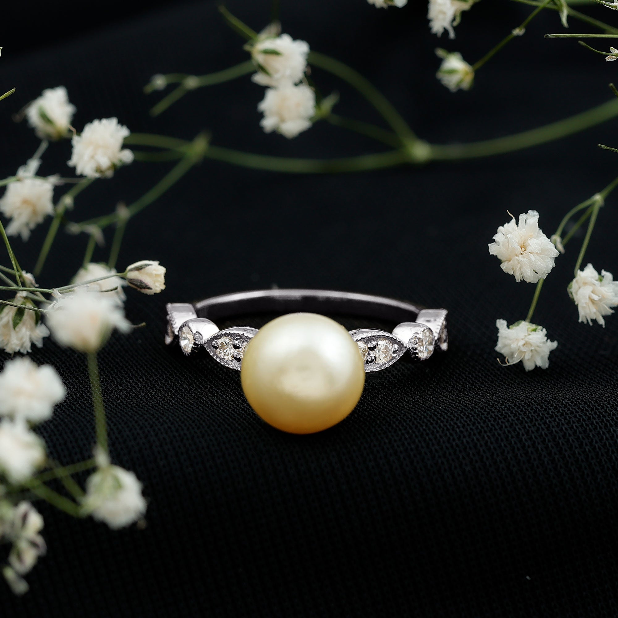 South sea pearl engagement rings from the mesmerizing collection of engagement rings by Rosec Jewels are an exceptional range of pearl engagement rings featuring the soft silvery and gold body colors of the South sea pearl. South sea pearl rings for women are a site to adore which speak for the wonderful creation of this organic gem biological activities of silver and gold lipped oysters. The serene luster of our south sea pearl rings will be an essential addition to the jewelry wardrobe of women with a knack for trending jewelry.
