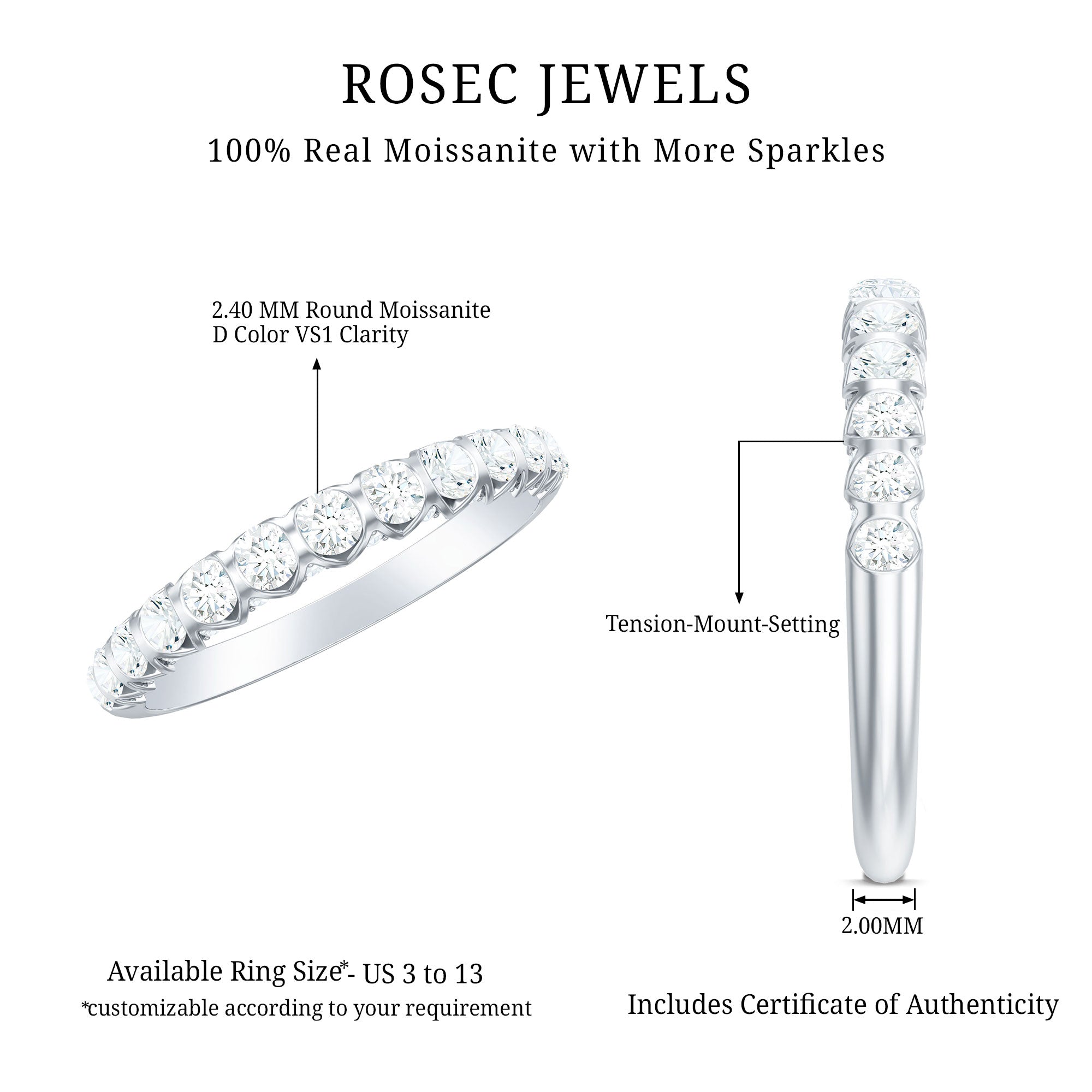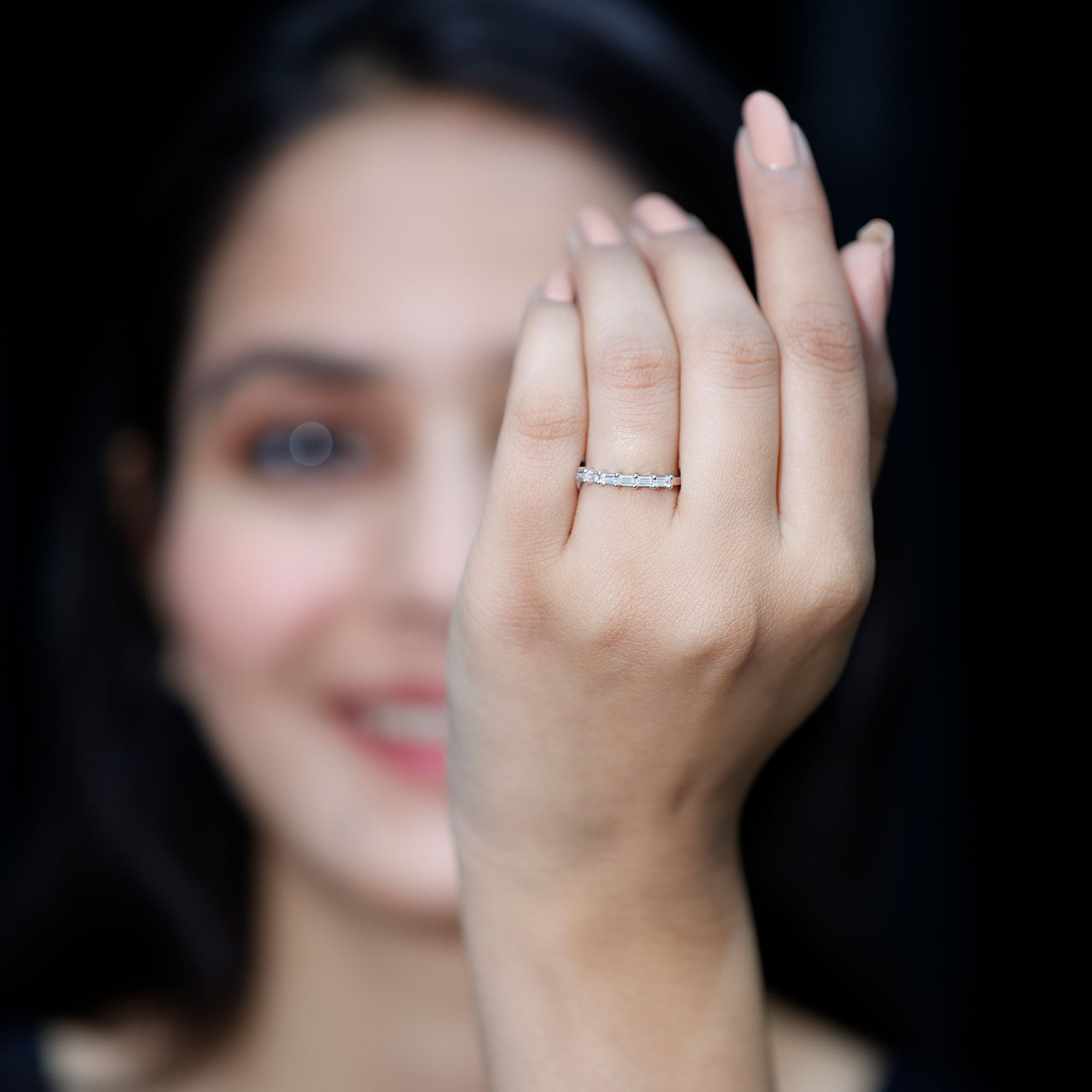 • Check gemstone shapes: To create a uniform stack, gemstone shape must be considered. It's very important to play with proportions carefully. Like for your teardrop sapphire engagement ring, moissanite curved wedding rings can be good complementing rings. Opt shapes that fit well in the stack.