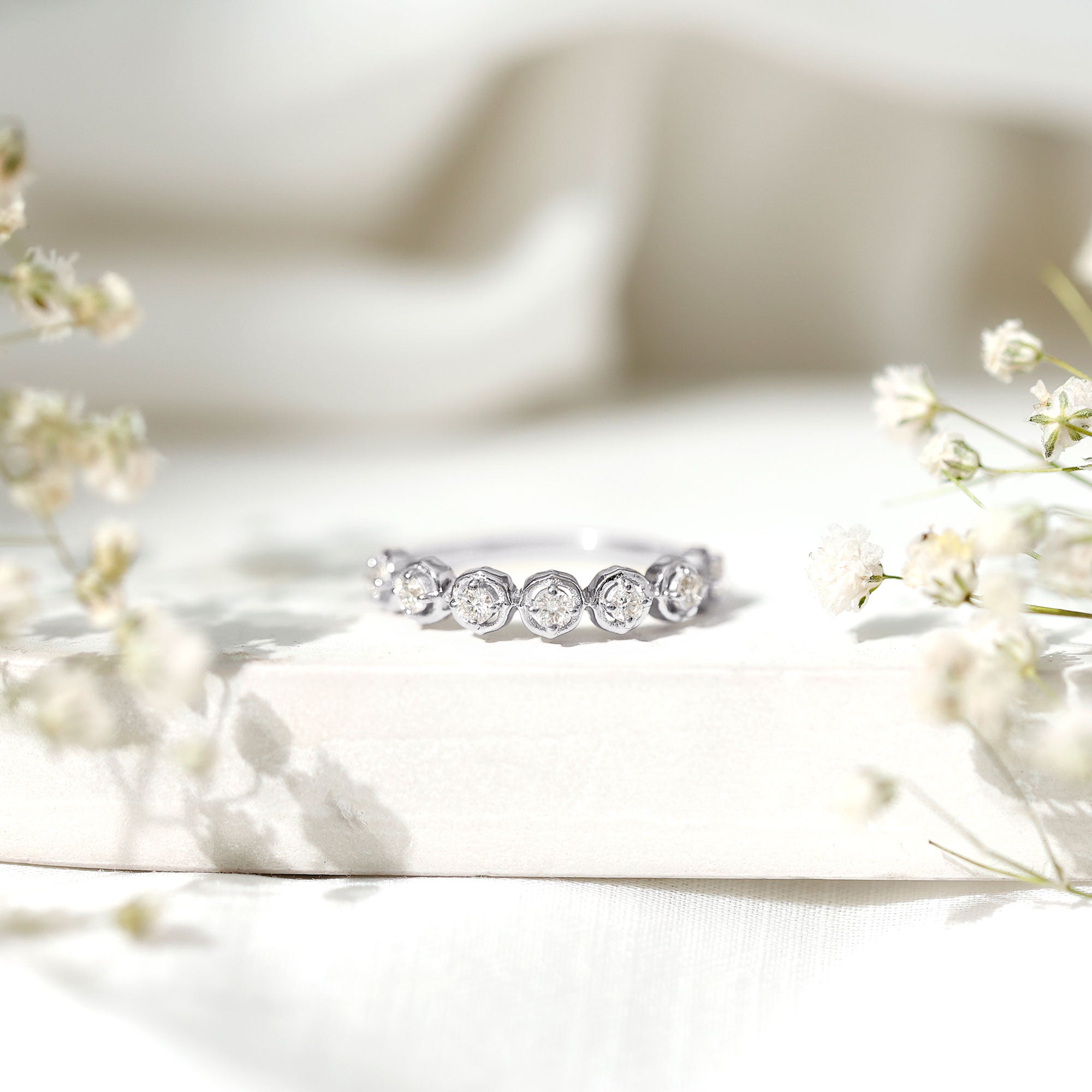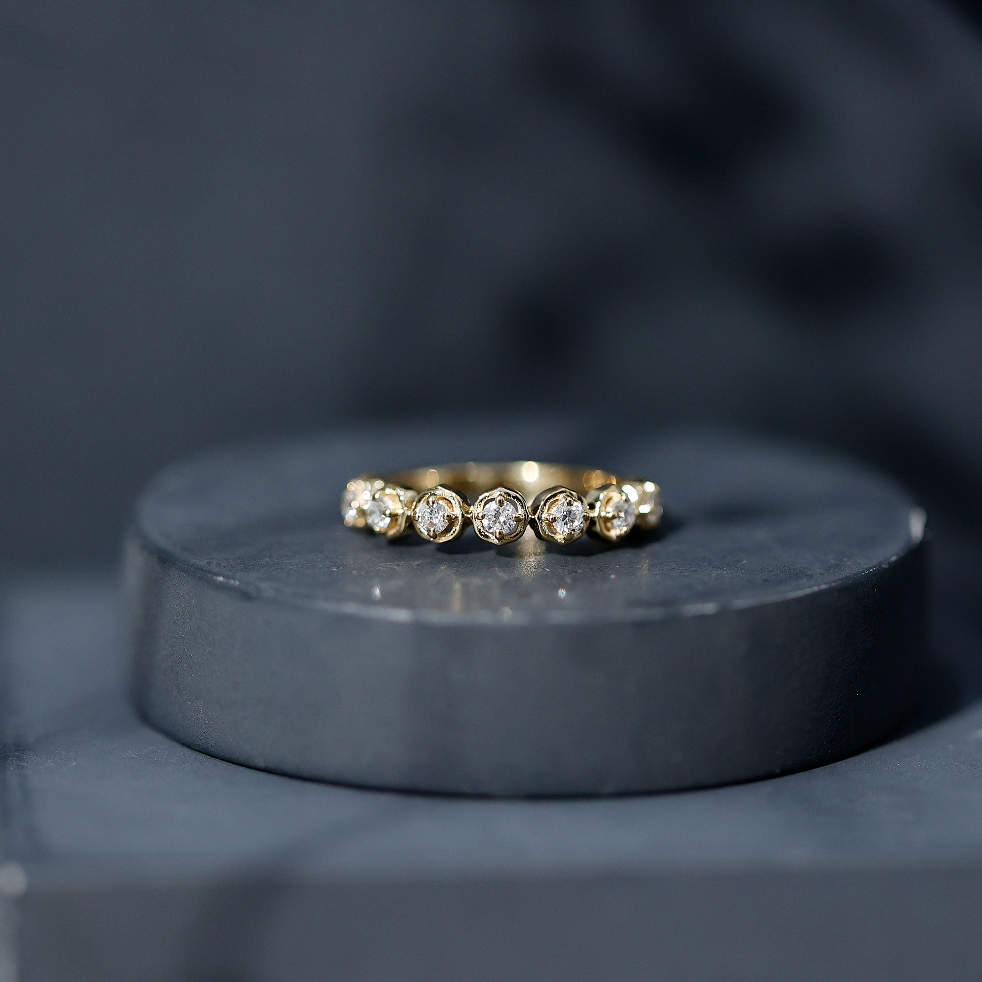 Check gemstone shapes: To create a uniform stack, gemstone shape must be considered. It's very important to play with proportions carefully. Like for your teardrop sapphire engagement ring, moissanite curved wedding rings can be good complementing rings. Opt shapes that fit well in the stack.