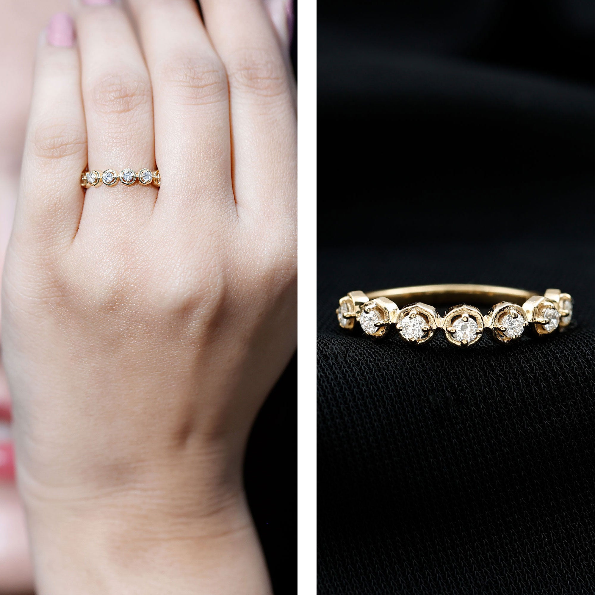 Stackable rings don't feature bold or statement designs, they are elegant, sleek bands that can adorn any finger. Sleek eternity bands featuring different gemstone shapes are among the popular stackable ring styles. Depending on your luxurious or sparkling taste, full or half eternity stackable rings can be chosen. Two stone stackable rings symbolizing union of two souls in a romantic way are a good choice for your unique stack. Infinity rings with a symbolic frame adorned with dainty gemstones form the heart of this ring style. Minimalism is a trend and stackable rings have a style to match this trend too.