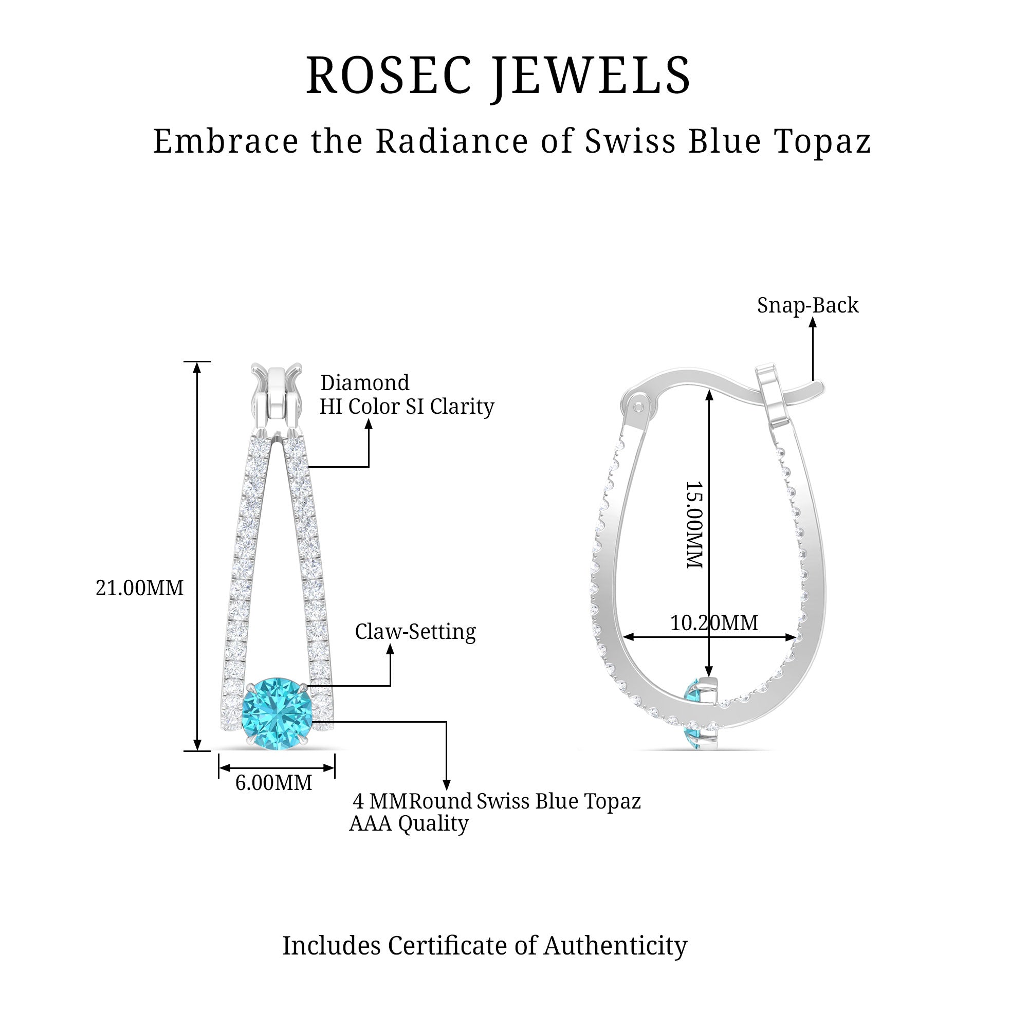 Talking about its premium USP: the deep sea blue color of Swiss Blue Topaz Earrings, its color saturation ranges from light to moderate.