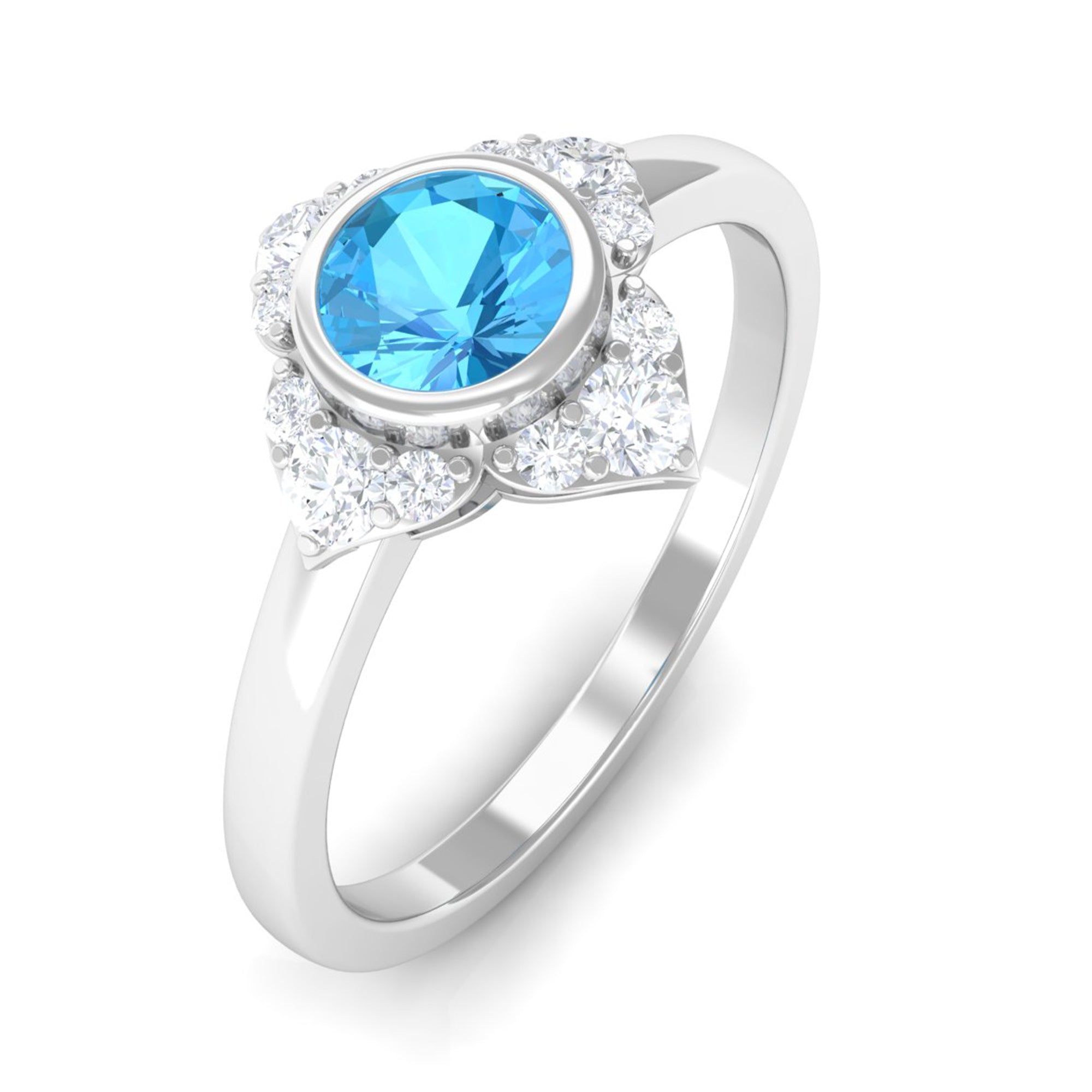 - Color: The color specific to Swiss blue topaz engagement rings is defined by bright and light shades falling in the mid-range of London Blue to Sky Blue Topaz.