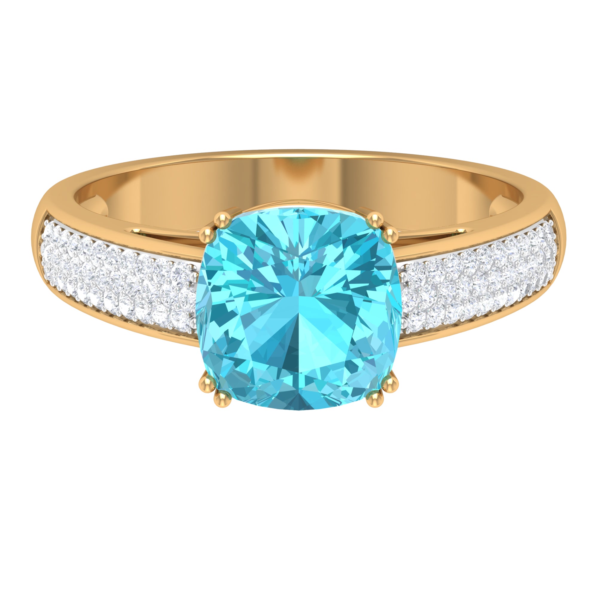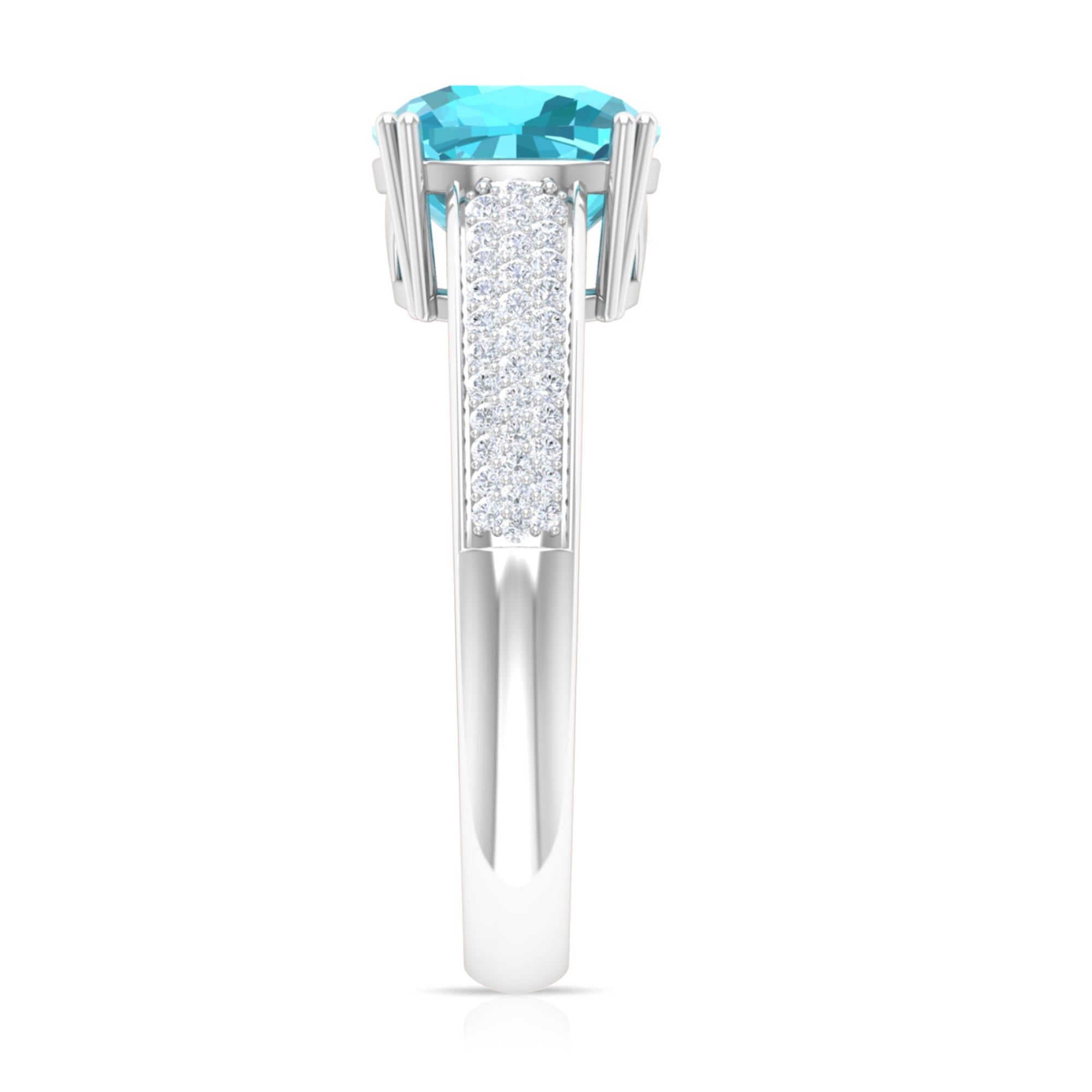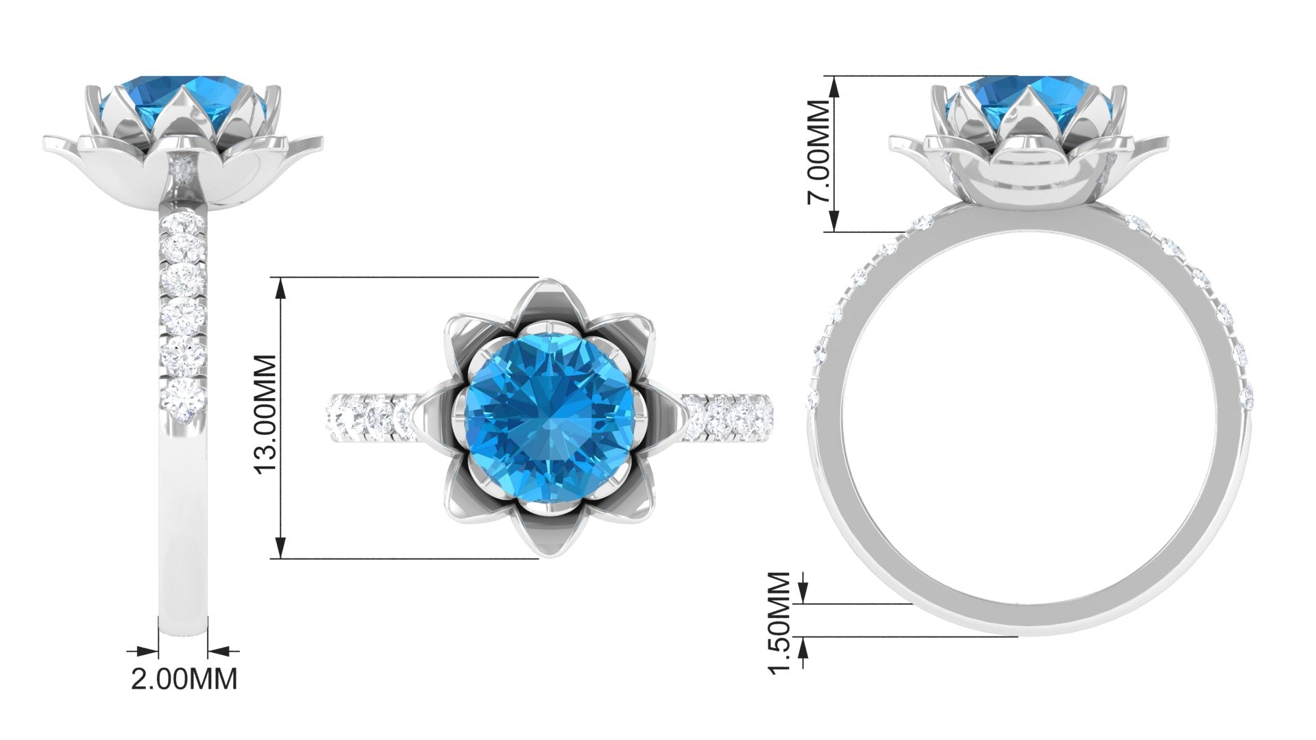 The center-stone of Swiss Blue Topaz here is sparkled up with the encircling of Diamond/Moissanite (that we fondly term ‘Halo’). That makes the Swiss Blue Topaz appear even brighter while highlighting its beauty at its best. Surprisingly, it also gives off the illusion of a bigger Topaz. So, if a Swiss Blue Topaz and Diamond Ring is on your list, this style might turn out to be your best bet.