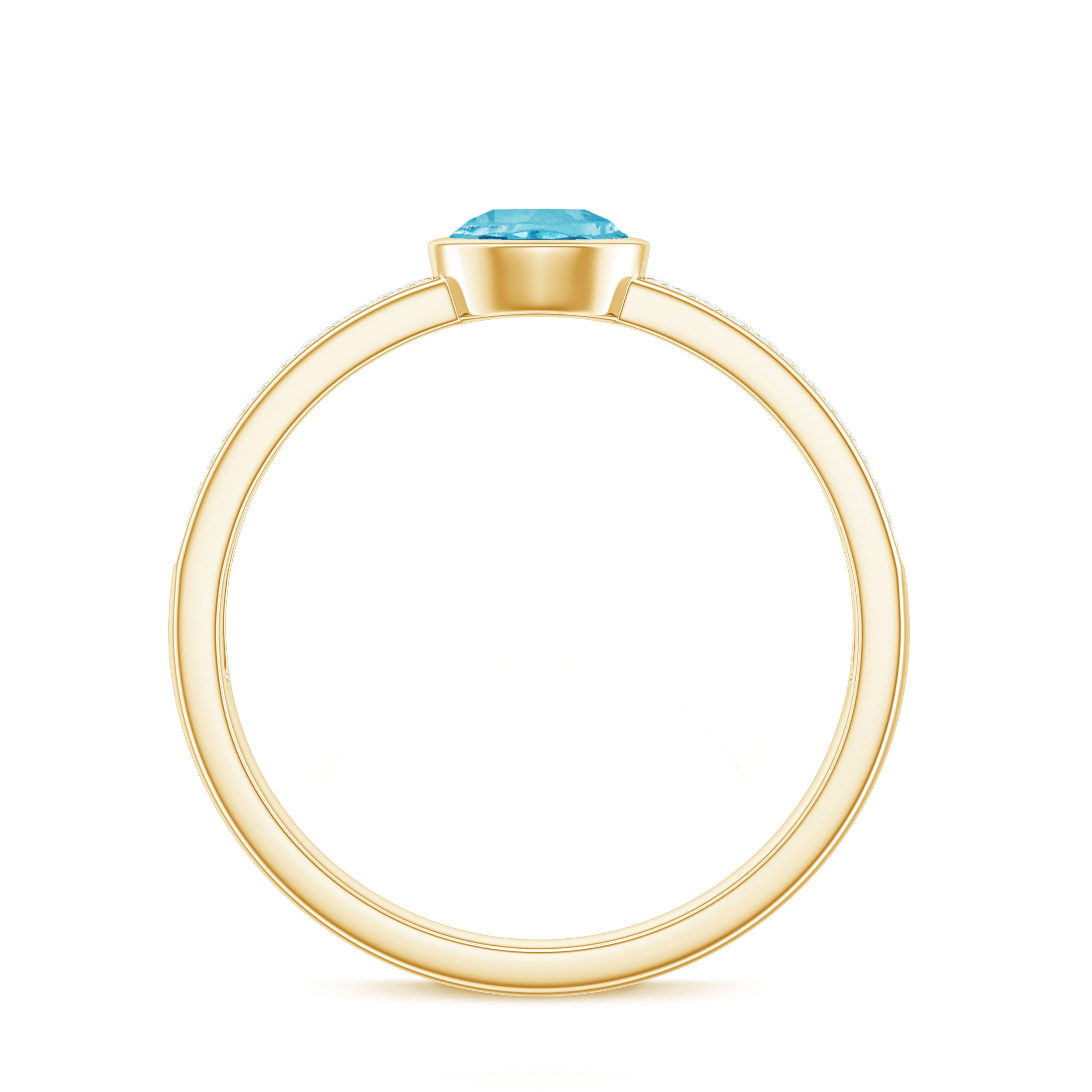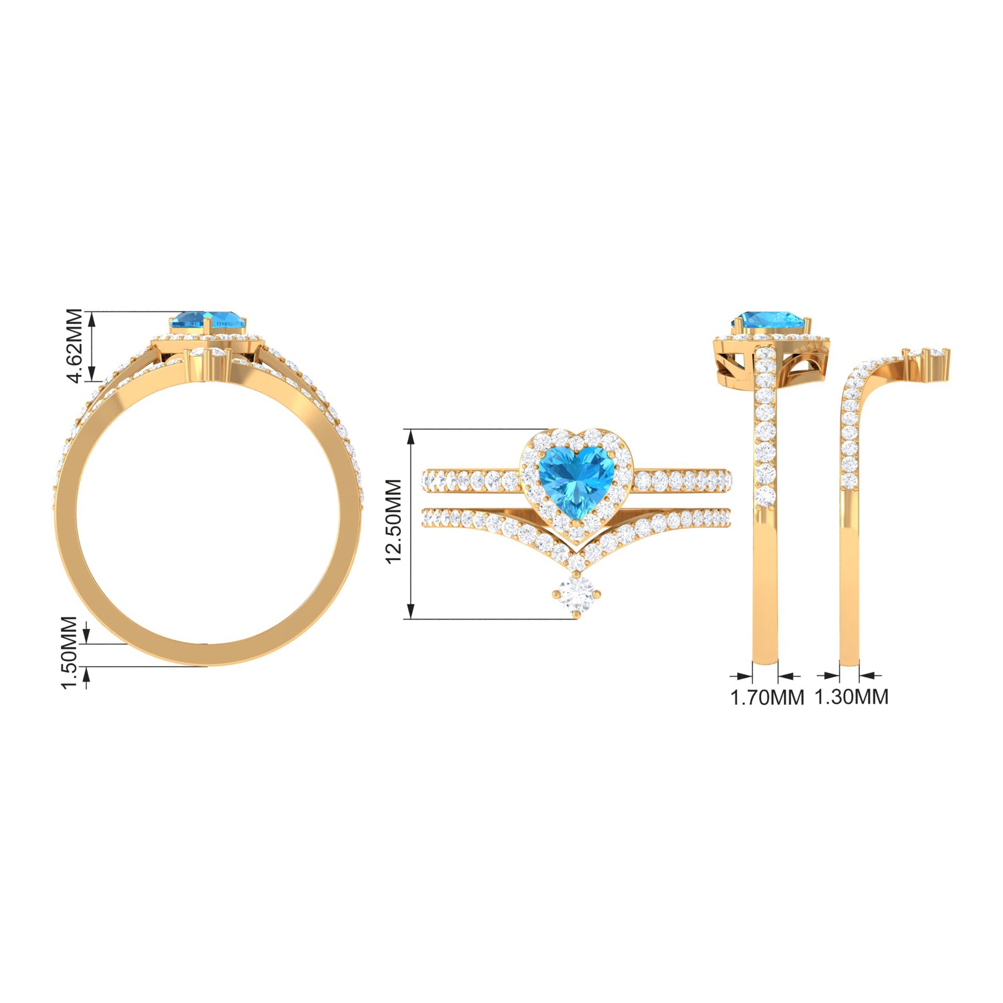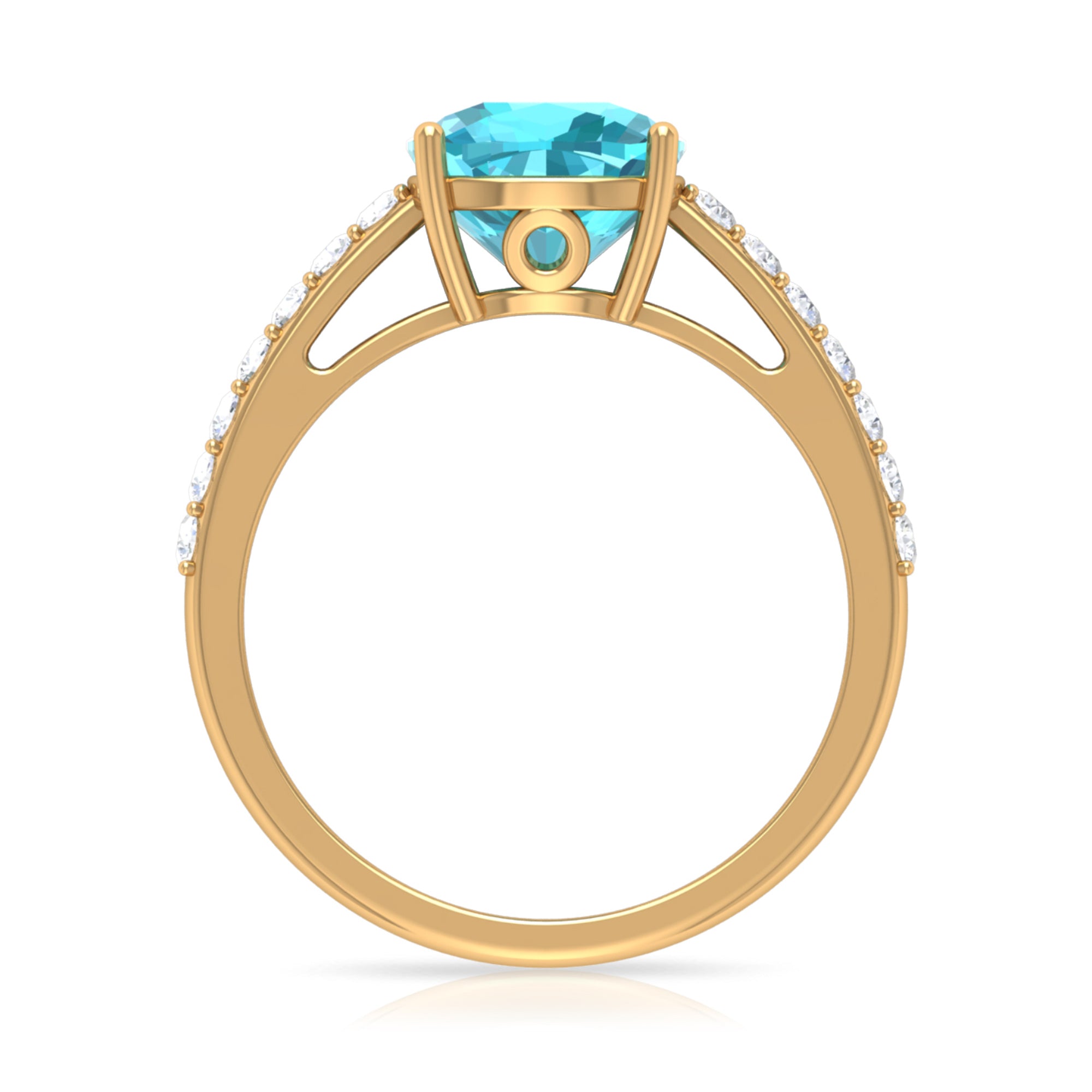 The center-stone of Swiss Blue Topaz here is sparkled up with the encircling of Diamond/Moissanite (that we fondly term ‘Halo’). That makes the Swiss Blue Topaz appear even brighter while highlighting its beauty at its best. Surprisingly, it also gives off the illusion of a bigger Topaz. So, if a Swiss Blue Topaz and Diamond Ring is on your list, this style might turn out to be your best bet.