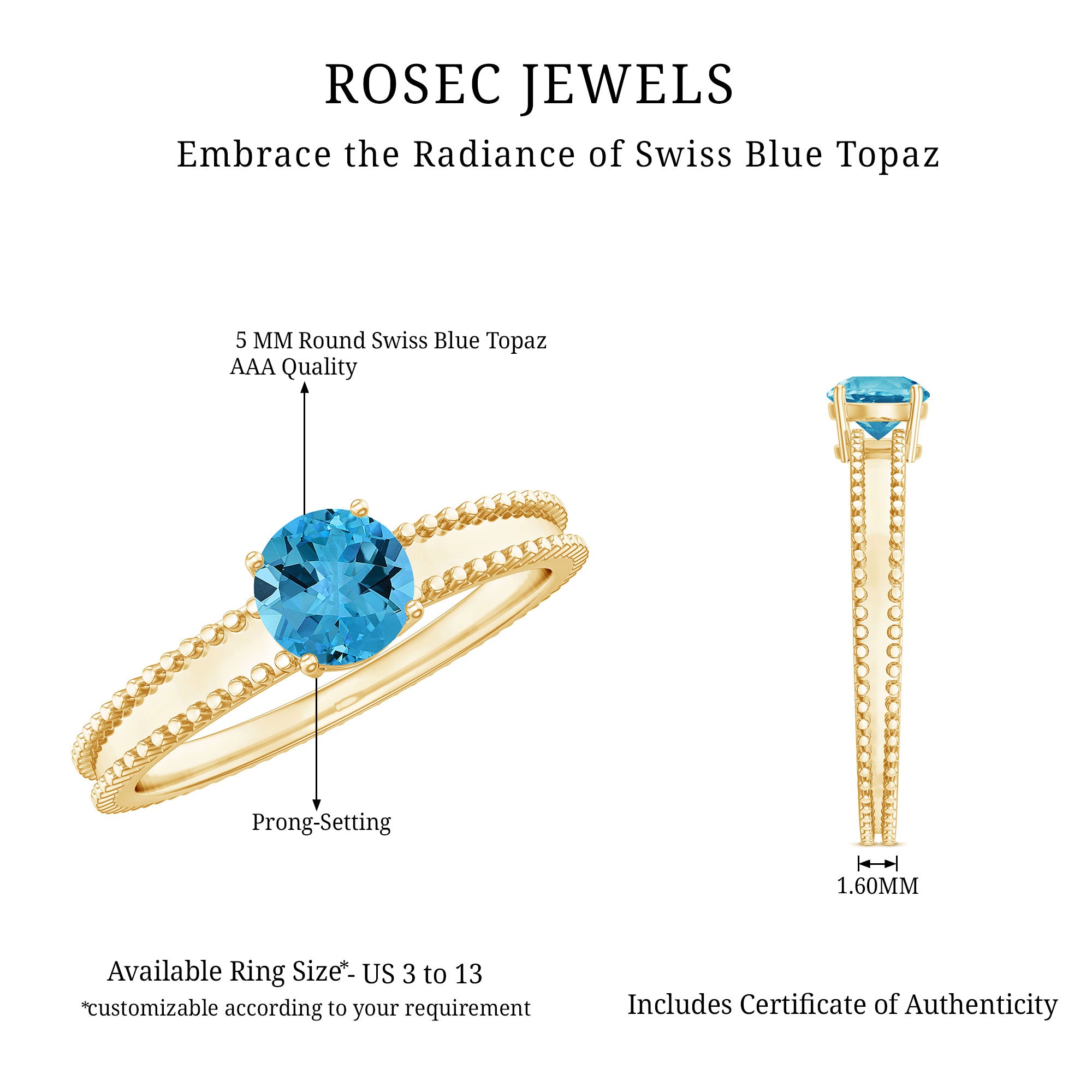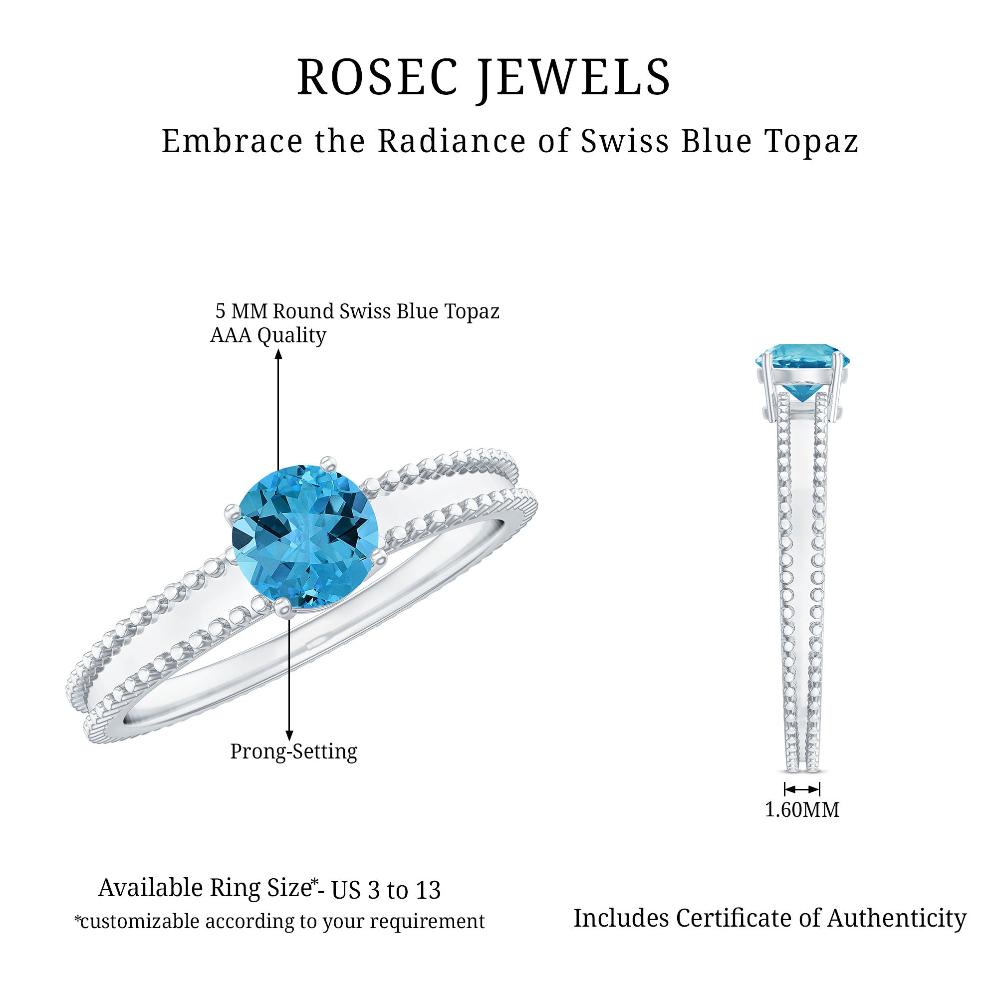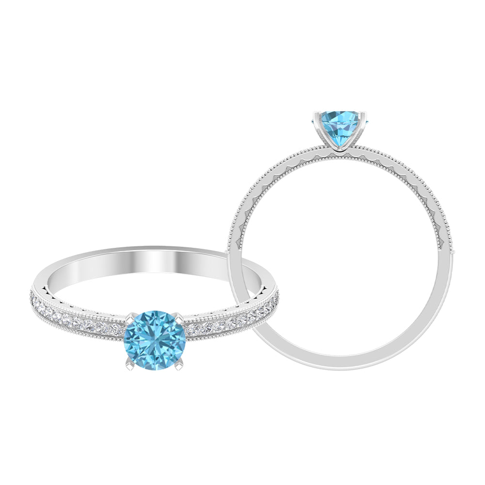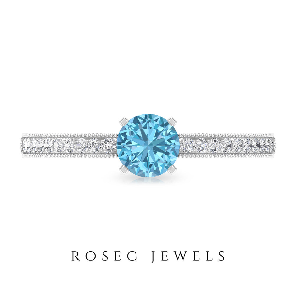 Highly prized as one of the most conventional Swiss Blue Topaz Engagement Rings out there, it is characterized by a Single Centerpiece of Swiss Blue Topaz of any shape. Technically, the Swiss Blue Topaz here appears much more flashy than any other ring style (with a stone size of 6 MM or more). It could range from an understated Round Cut Swiss Blue Topaz Ring to fancier ones such as those fashioned in Marquise, Princess, and Pear Cut. Or if you fancy a little old-school touch, an Asscher or Emerald Cut Swiss Blue Topaz Ring might be the one.