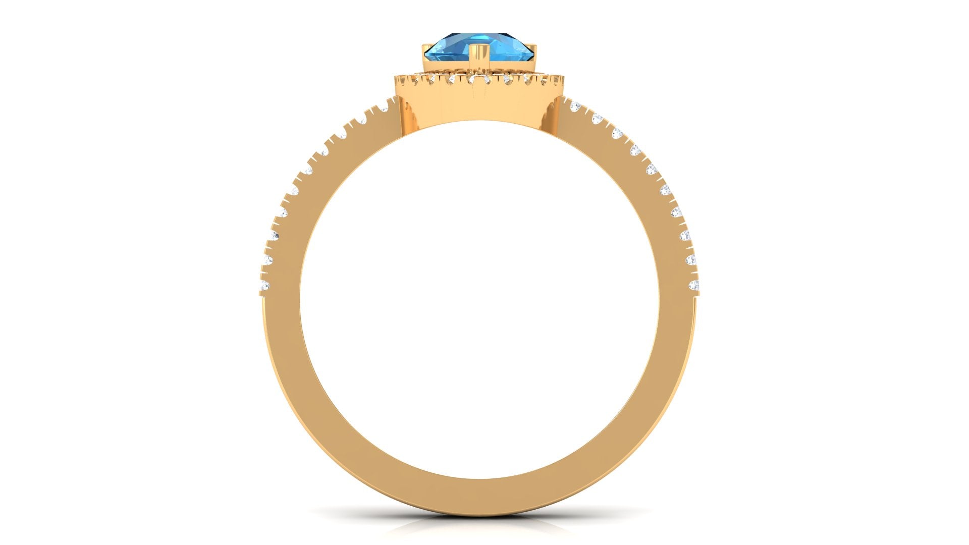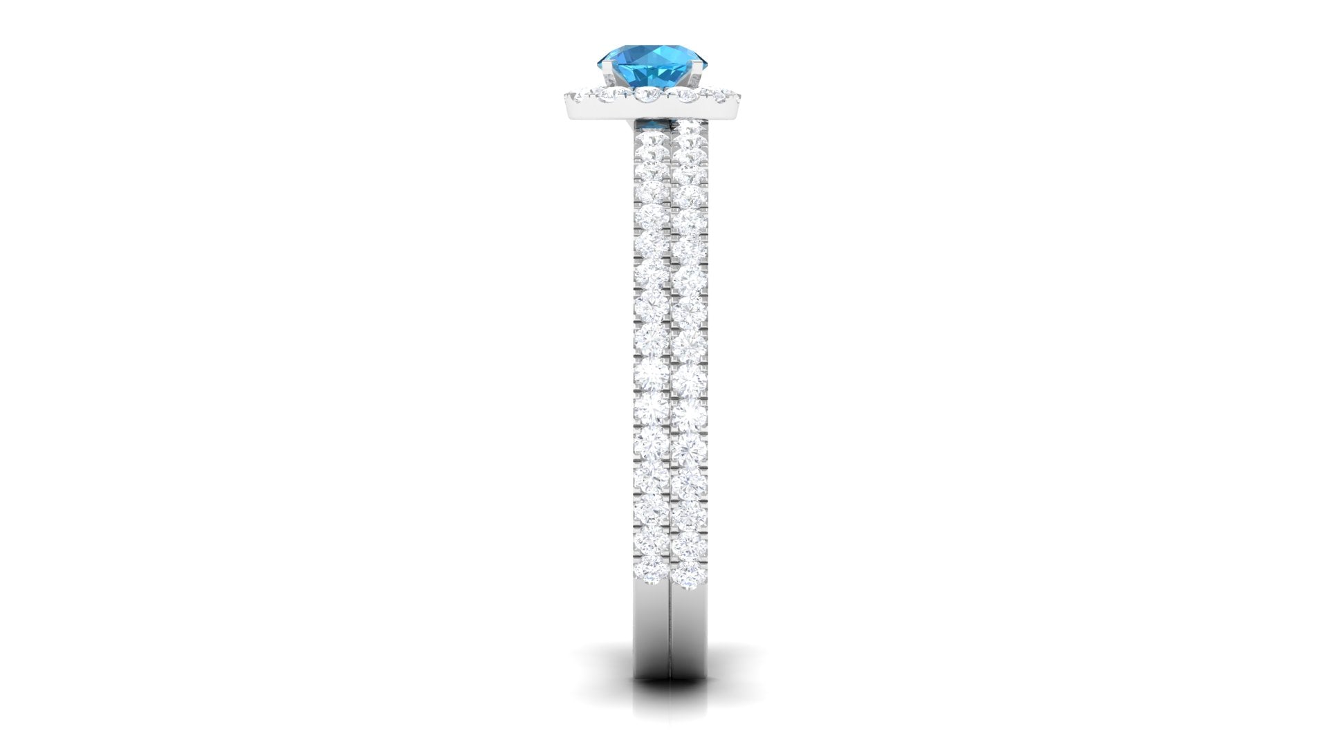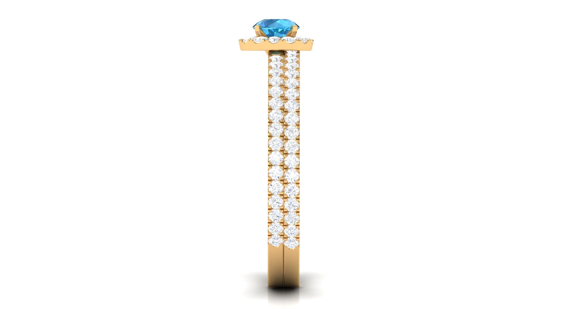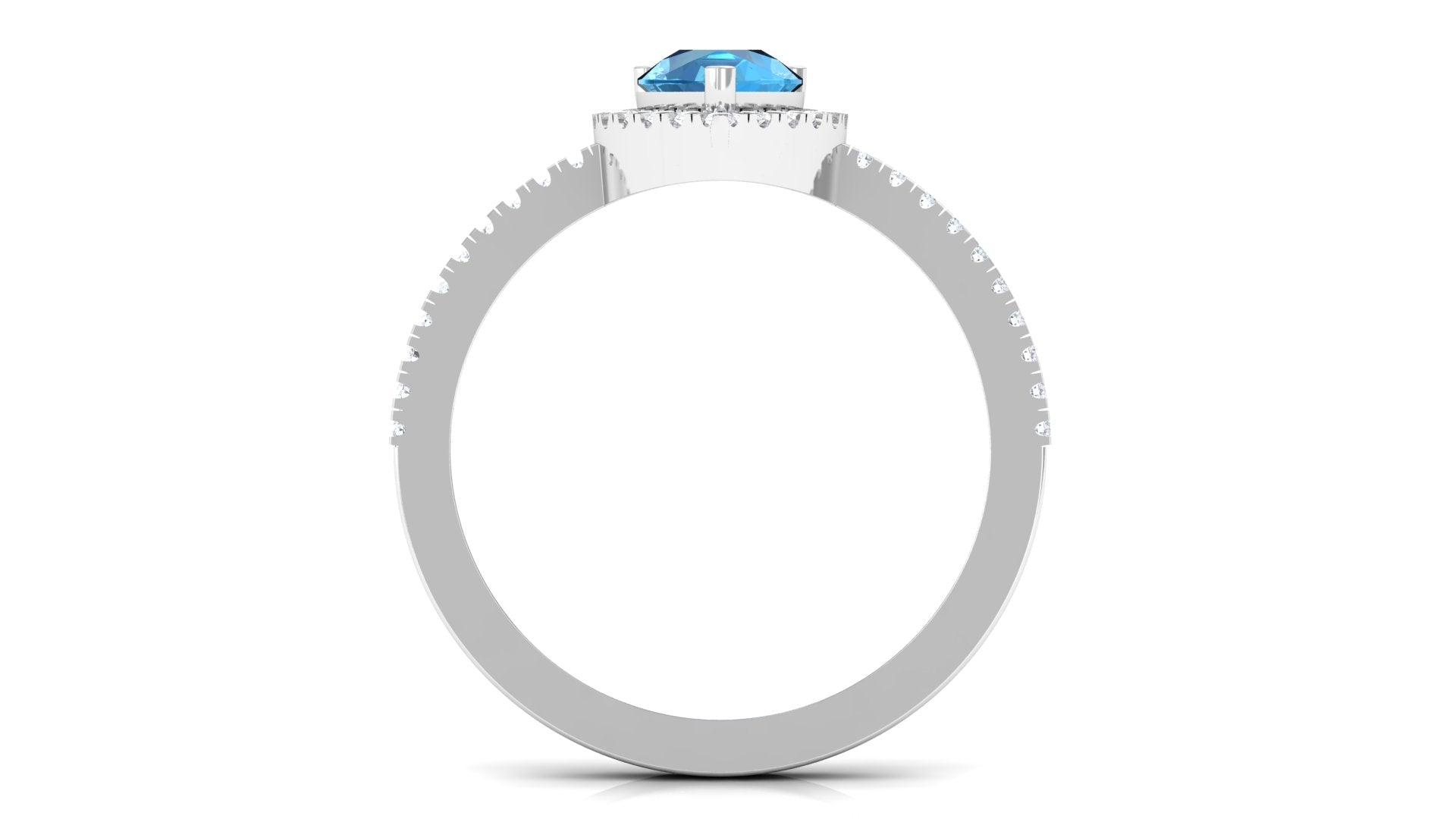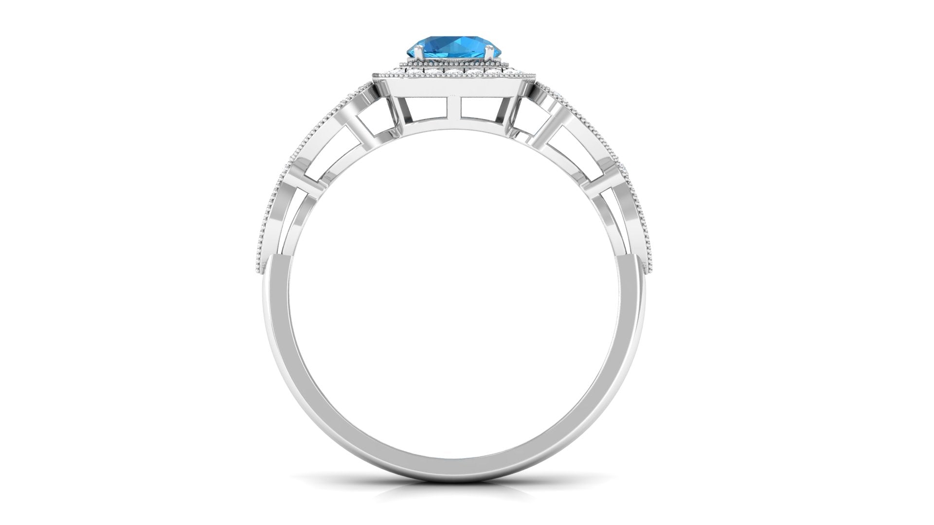 The center-stone of Swiss Blue Topaz here is sparkled up with the encircling of Diamond/Moissanite (that we fondly term ‘Halo’). That makes the Swiss Blue Topaz appear even brighter while highlighting its beauty at its best. Surprisingly, it also gives off the illusion of a bigger Topaz. So, if a Swiss Blue Topaz and Diamond Ring is on your list, this style might turn out to be your best bet.